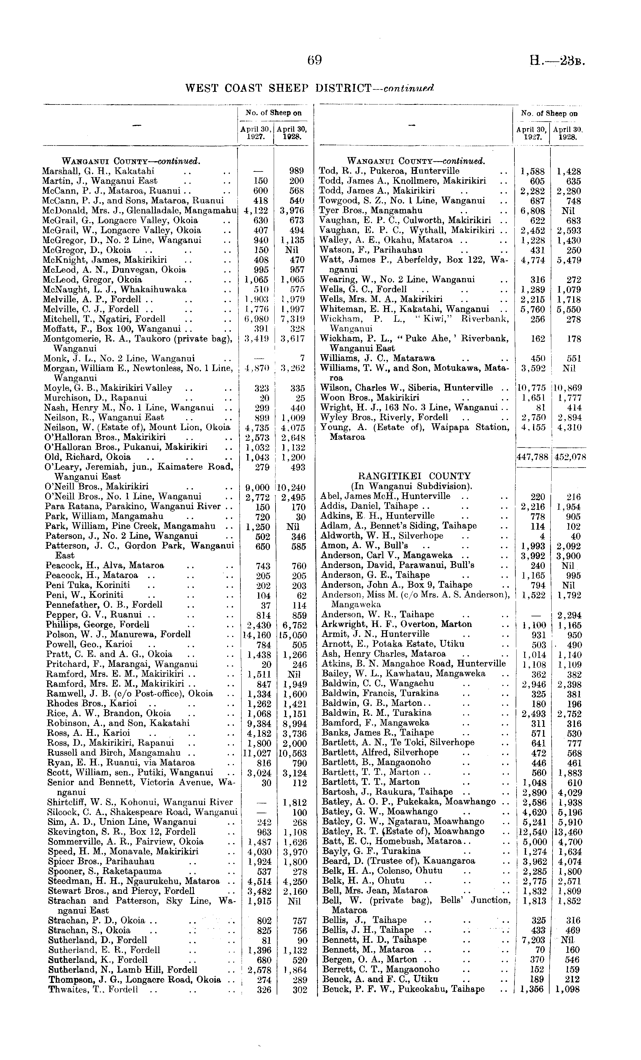 No. of Sheep on April 30, April 30, 1927. 1928. Wanganui County—continued,. Tod, R. J., Pukeroa, Hunterville .. 1,588 1,428 Todd, James A., Knollmere, Makirikiri .. 605 635 Todd, James A., Makirikiri .. .. 2,282 2,280 Towgood, S. Z., No. 1 Line, Wanganui .. 687 748 Tyer Bros., Mangamahu .. .. 6,808 Nil Vaughan, E. P. C., Culworth, Makirikiri .. 622 683 Vaughan, E. P. C., Wythall, Makirikiri .. 2,452 2,593 Walley, A. E., Okahu, Mataroa .. .. 1,228 1,430 Watson, 1' ., Parihauhau .. .. 431 250 Watt, James P., Aberfeldy, Box 122, Wa- 4,774 5,479 nganui Wearing, W., No. 2 Line, Wanganui .. 316 272 Wells, G. C., Fordell .. .. .. 1,289 1,079 Wells, Mrs. M. A., Makirikiri .. .. 2,215 1,718 Whiteman, E. H., Kakatahi, Wanganui . . 5,760 5,550 Wickham, P. L., " Kiwi," Riverbank, 256 278 Wanganui Wickham, P. L., " Puke Ahe, ' Riverbank, 162 178 Wanganui East Williams, J. C., Matarawa .. .. 450 551 Williams, T. W., and Son, Motukawa, Mata- 3,592 Nil roa Wilson, Charles W., Siberia, Hunterville .. 10,775 10,869 Woon Bros., Makirikiri .. .. 1,651 1,777 Wright, H. J., 163 No. 3 Line, Wanganui .. 81 414 Wyley Bros., Riverly, Fordell .. .. 2,750 2,894 Young, A. (Estate of), Waipapa Station, 4,155 4,310 Mataroa 447,788 452,078 RANGITIKEI COUNTY (In Wanganui Subdivision). Abel, James McH., Hunterville .. .. 220 216 Addis, Daniel, Taihape .. .. .. 2,216 1,954 Adkins, E H., Hunterville .. .. 778 905 Adlam, A., Bennet's Siding, Taihape .. 114 102 Aldworth, W. H., Silverhope .. .. 4 40 Amon, A. W., Bull's .. .. .. 1,993 2,092 Anderson, Carl V., Mangaweka .. .. 3,992 3,900 Anderson, David, Parawanui, Bull's .. 240 Nil Anderson, G. E., Taihape .. .. 1,165 995 Anderson, John A., Box 9, Taihape .. 794 Nil Anderson, Miss M. (c/o Mrs. A. S. Anderson), 1,522 1,792 Mangaweka Anderson, W. R., Taihape .. .. — ! 2,294 Arkwright, H. F., Overton, Marton .. 1,100 ' 1,165 Armit, J. N., Hunterville .. .. 931 J 950 Arnott, E., Potaka Estate, Utiku .. I 503 . 490 Ash, Henry Charles, Mataroa .. .. 1,014 1,140 Atkins, B. N. Mangahoe Road, Hunterville 1,108 1,109 Bailey, W. L., Kawhatau, Mangaweka .. 362 382 Baldwin, C. C., Wangaehu .. .. 2,946 2,398 Baldwin, Francis, Turakina .. .. 325 381 Baldwin, G. B., Marton.. .. .. 180 196 Baldwin, R. M., Turakina .. .. 2,493 2,752 Bamford, F., Mangaweka .. .. 311 316 Banks, James R., Taihape .. .. 571 530 Bartlett, A. N., Te Toki, Silverhope .. 641 777 Bartlett, Alfred, Silverhope .. .. 472 568 Bartlett, B., Mangaonoho .. .. 446 461 Bartlett, T. T., Marton .. .. .. 560 1,883 Bartlett, T. T., Marton .. .. 1,048 610 Bartosh, J., Raukura, Taihape .. .. 2,890 4,029 Batley, A. O. P., Pukekaka, Moawhango .. j 2,586 1,938 Batley, G. W., Moawhango .. .. 4,620 5,196 Batley, G. W., Ngatarau, Moawhango .. 5,241 5,910 Batley, R. T. (Estate of), Moawhango .. 12,540 13,460 Batt, E. C., Homebush, Mataroa.. .. 5,000 4,700 Bayly, G. F., Turakina .. .. 1,274 1,634 Beard, D. (Trustee of), Kauangaroa .. 3,962 4,074 Belk, H. A., Colenso, Ohutu .. .. 2,285 1,800 Belk, H. A., Ohutu .. .. .. 2,775 2,571 Bell, Mrs. Jean, Mataroa .. .. 1,832 1,809 Bell, W. (private bag), Bells' Junction, 1,813 1,852 Mataroa Bellis, J., Taihape .. .. .. 325 316 Bellis, J. H., Taihape .. .. .. 433 469 Bennett, H. D., Taihape .. .. 7,203 Nil Bennett, M., Mataroa .. .. .. 70 160 Bergen, 0. A., Marton .. .. .. 370 546 Berrett, C. T., Mangaonoho .. .. 152 159 Beuck, A. and F. C., Utiku .. .. 189 212 Beuck, P. F. W., Pukeokahu, Taihape .. | 1,356 1,098