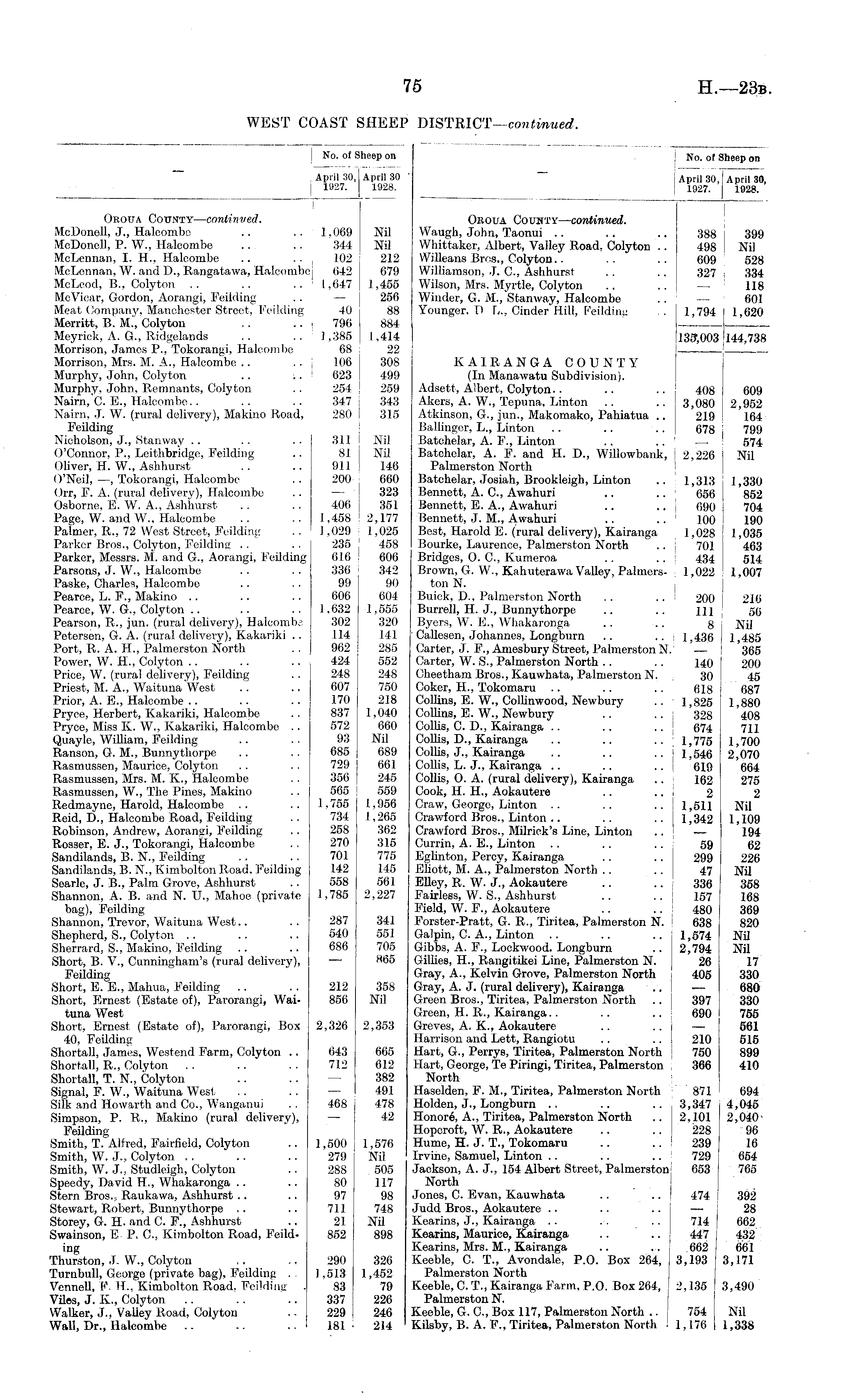 No. of Sheep on I April 30, April 30, 1927. 1928. , Oboua County—continued. Waugh, John, Taonui .. .. .. 388 j 399 Whittaker, Albert, Valley Road, Colyton .. 498 ! Nil Willeans Bros., Colyton.. .. .. 609 528 Williamson, J. C., Ashhurst .. .. 327 \ 334 Wilson, Mrs. Myrtle, Colyton .. .. — 118 Winder, G. M., Stanway, Halcombe .. —• { 601 Younger,!) L., Cinder Hill, Feilding , . 1,794 1,620 133;003 144,738 KAIEAN6A COUNTY (In Manawatu Subdivision). Adsett, Albert, Colyton.. .. .. 408 609 Akers, A. W., Tepuna, Linton .. .. 3,080 2,952 Atkinson, G., jun., Makomako, Pahiatua .. 219 164 Ballinger, L., Linton .. .. .. 678 799 Batchelar, A. F., Linton .. .. j — 574 Batchelar, A. F. and H. .D., Willowbank, ! 2,226 j Nil Palmerston North Batchelar, Josiah, Brookleigh, Linton .. 1,313 1,330 Bennett, A. C., Awahuri .. .. 656 '< 852 Bennett, E. A., Awahuri .. .. 690 I 704 Bennett, J. M., Awahuri .. .. 100 | 190 Best, Harold E. (rural delivery), Kairanga 1,028 1,035 Bourke, Laurence, Palmerston North .. 701 j 463 Bridges, 0. C., Kumeroa .. .. 434 j 514 Brown, G. W., Kahuterawa Valley, Palmers- 1,022 ' 1,007 ton N. Buick, D., Palmerston North .. .. 200 j 216 Burrell, H. J., Bunnythorpe .. .. m j 56 Byers, W. E., Whakaronga .. .. g Nil ' Callesen, Johannes, Longburn .. ... 1,436 I 1,485 Carter, J. E., Amesbury Street, Palmerston N. — ! 365 Carter, W. S., Palmerston North .. .. 140 ! 200 Cheetham Bros., Kauwhata, Palmerston N. 30 ! 45 Coker, H., Tokomaru .. .. . . 618 687 Collins, E. W., Collinwood, Newbury .. 1,825 1,880 Collins, E. W., Newbury .. .. 328 408 Collis, C. D., Kairanga .. . . .. j 674 711 Collis, D., Kairanga .. .. .. j 1,775 1,700 Collis, J., Kairanga .. .. .. 1,546 2,070 Collis, L. J., Kairanga .. .. . . 619 664 Collis, O. A. (rural delivery), Kairanga .. 162 275 Cook, H. H., Aokautere .. .. 2 2 Craw, George, Linton .. .. .. 1,511 Nil Crawford Bros., Linton .. .. .. 1,342 1,109 Crawford Bros., Milriok's Line, Linton .. — 194 Currin, A. E., Linton .. .. .. j 59 62 Eglinton, Percy, Kairanga . . .. 299 226 Elliott, M. A., Palmerston North .. .. 47 Nil Elley, R. W. J., Aokautere .. .. 1 336 358 Fairless, W. S., Ashhurst .. .. 157 168 Field, W. F., Aokautere .. .. 480 369 Forster-Pratt, G. R., Tiritea, Palmerston N. j 638 820 Galpin, C. A., Linton .. .. .. 1,574 Nil Gibbs, A. F., Lockwood. Longburn .. 2,794 Nil Gillies, H., Rangitikei Line, Palmerston N. 26 17 Gray, A., Kelvin Grove, Palmerston North 405 330 Gray, A. J. (rural delivery), Kairanga ... — 680 Green Bros., Tiritea, Palmerston North .. ! 397 330 Green, H. R., Kairanga.. .. .. J 690 755 Greves, A. K., Aokautere .. .. j — 561 Harrison and Lett, Rangiotu .. .. 210 515 Hart, G., Perrys, Tiritea, Palmerston North 750 899 Hart, George, Te Piringi, Tiritea, Palmerston 366 410 North Haselden, F. M., Tiritea, Palmerston North 871 694 Holden, J., Longburn .. .. .. 3,347 4,045 Honore, A., Tiritea, Palmerston North .. 2,101 2,040Hoperoft, W. R., Aokautere .. .. 228 96 Hume, H. J. T., Tokomaru .. .. 239 16 Irvine, Samuel, Linton .. .. .. 729 654 Jackson, A. J., 154 Albert Street, Palmerston 653 765 North Jones, C. Evan, Kauwhata .. .. 474 392 Judd Bros., Aokautere .. .. .. — 28 Kearins, J., Kairanga .. . . .. 714 662 Kearins, Maurice, Kairanga .. .. 447 J 432 Kearins, Mrs. M., Kairanga .. ... 662 j 661 Keeble, C. T., Avondale, P.O. Box 264, 3,193 j 3,171 Palmerston North Keeble, C. T., Kairanga Farm, P.O. Box 264, 2,135 3,490 Palmerston N. Keeble, G. C., Box 117, Palmerston North .. 754 Nil Kilsby, B. A. F., Tiritea, Palmerston North 1 1,176 1,338
