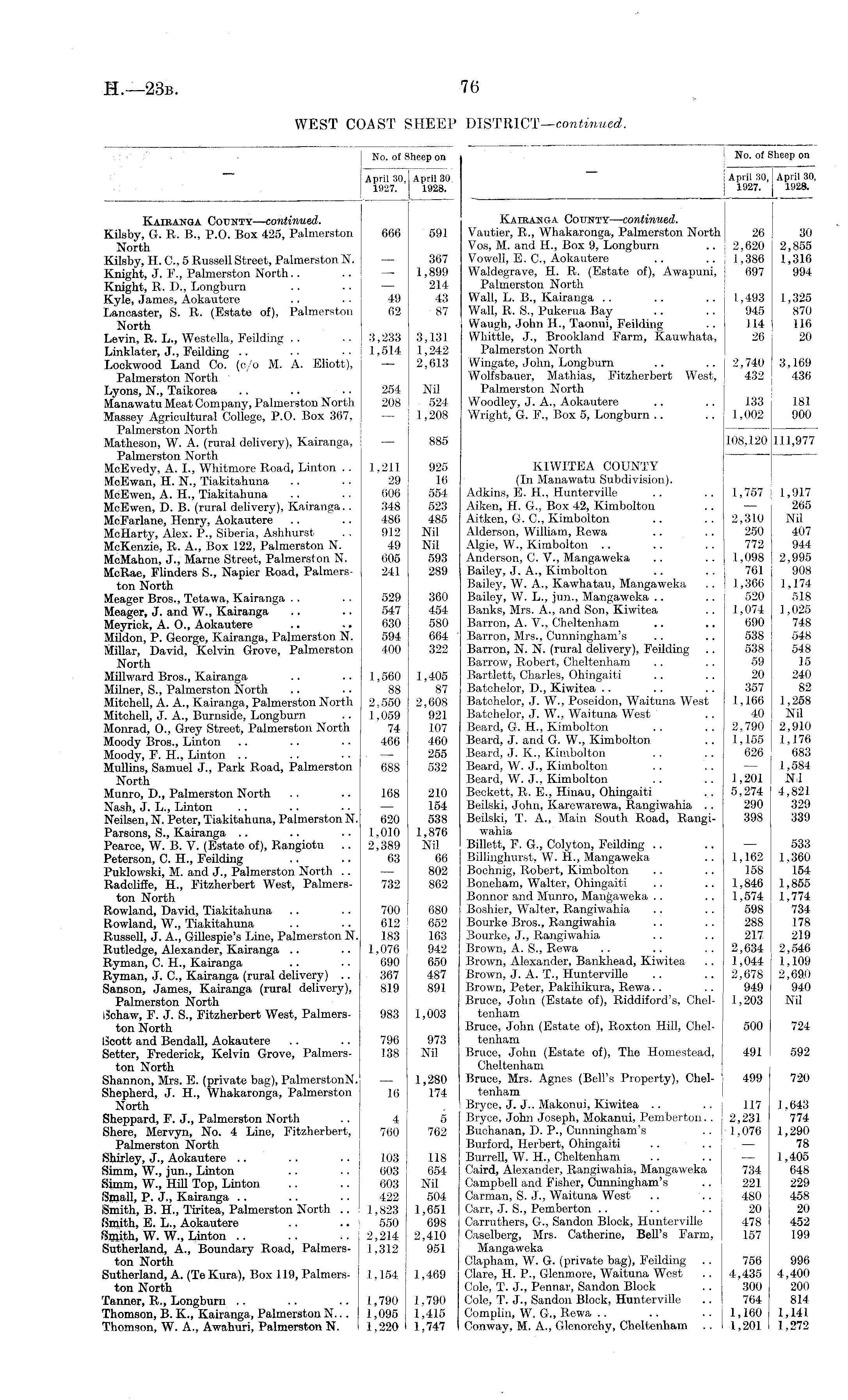 No. of Sheep on April 30, April 30 1927. 1928. Kairanga County—continued. Kilsby, G. R. B„ P.O. Box 425, Palmerston 666 591 North Kilsby, H. C., 5 Russell Street, Palmerston N. — 367 Knight, J. P., Palmerston North.. .. — 1,899 Knight, R. D., Longburn .. .. — 214 Kyle, James, Aokautere .. • • 49 43 Lancaster, S. R. (Estate of), Palmerston 62 87 North Levin, R. L., Westella, Peilding .. .. 3,233 3,131 Linklater, J., Feilding .. .. •• 1,514 1,242 Lockwood Land Co. (c/o M. A. Eliott), — 2,613 Palmerston North Lyons, N., Taikorea .. .. .. 254 Nil Manawatu Meat Company, Palmerston North 208 524 Massey Agricultural College, P.O. Box 367, — 1,208 Palmerston North Matheson, W. A. (rural delivery), Kairanga, — 885 Palmerston North McEvedy, A. I., Whitmore Road, Linton .. 1,211 925 McEwan, H. N., Tiakitahuna .. .. 29 16 McEwen, A. H., Tiakitahuna .. .. 606 554 McEwen, D. B. (rural delivery), Kairanga.. 348 523 McFarlane, Henry, Aokautere .. .. 486 485 McHarty, Alex. P., Siberia, Ashhurst .. 912 Nil McKenzie, R. A., Box 122, Palmerston N. 49 Nil McMahon, J., Marne Street, Palmerston N. 605 593 McRae, Flinders S., Napier Road, Palmers- 241 289 ton North Meager Bros., Tetawa, Kairanga .. .. 529 360 Meager, J. and W., Kairanga .. .. 547 454 Meyriek, A. O., Aokautere .. .. 630 580 Mildon, P. George, Kairanga, Palmerston N. 594 664 Millar, David, Kelvin Grove, Palmerston 400 322 North Millward Bros., Kairanga .. .. 1,560 1,405 Milner, S., Palmerston North .. .. 88 87 Mitchell, A. A., Kairanga, Palmerston North 2,550 2,608 Mitchell, J. A., Burnside, Longburn .. 1,059 921 Monrad, 0., Grey Street, Palmerston North 74 107 Moody Bros., Linton .. .. .. 466 460 Moody, F. H., Linton .. . . .. — 255 Mullins, Samuel J., Park Road, Palmerston 688 532 North Munro, D., Palmerston North . . .. 168 210 Nash, J. L., Linton .. .. .. — 154 Neilsen, N. Peter, Tiakitahuna, Palmerston N. 620 538 Parsons, S., Kairanga .. .. .. 1,010 1,876 Pearce, W. B. V. (Estate of), Rangiotu .. 2,389 Nil Peterson, C. H., Feilding .. .. 63 66 Puklowski, M. and J., Palmerston North .. — 802 Radcliffe, H., Fitzherbert West, Palmers- 732 862 ton North Rowland, David, Tiakitahuna .. .. 700 680 Rowland, W., Tiakitahuna .. .. 612 652 Russell, J. A., Gillespie's Line, Palmerston N. 183 163 Rutledge, Alexander, Kairanga .. .. 1,076 942 Ryman, C. H., Kairanga .. .. 690 650 Ryman, J. C., Kairanga (rural delivery) .. 367 487 Sanson, James, Kairanga (rural delivery), 819 891 Palmerston North l3chaw, F. J. S., Fitzherbert West, Palmers- 983 1,003 ton North Ifcott and Bendall, Aokautere .. .. 796 973 Setter, Frederick, Kelvin Grove, Palmers- 138 Nil ton North Shannon, Mrs. E. (private bag), PalmerstonN. — 1,280 Shepherd, J. H., Whakaronga, Palmerston 16 174 North Sheppard, F. J., Palmerston North .. 4 5 Shere, Mervyn, No. 4 Line, Fitzherbert, 760 762 Palmerston North Shirley, J., Aokautere .. .. .. 103 118 Simm, W., jun., Linton .. .. 603 654 Simm, W., Hill Top, Linton .. .. 603 Nil Small, P. J., Kairanga .. .. .. 422 504 Smith, B. H., Tiritea, Palmerston North .. 1,823 1,651 (Smith, E. L., Aokautere .. .. 1 550 698 Smith, W. W„ Linton .. .. .. 2,214 2,410 Sutherland, A., Boundary Road, Palmers- 1,312 951 ton North Sutherland, A. (Te Kura), Box 119, Palmers- 1,154 1,469 ton North Tanner, R., Longburn .. .. .. 1,790 1,790 Thomson, B. K., Kairanga, Palmerston N... 1,095; 1,415 Thomson, W. A., Awahuri, Palmerston N. 1,220 I 1,747