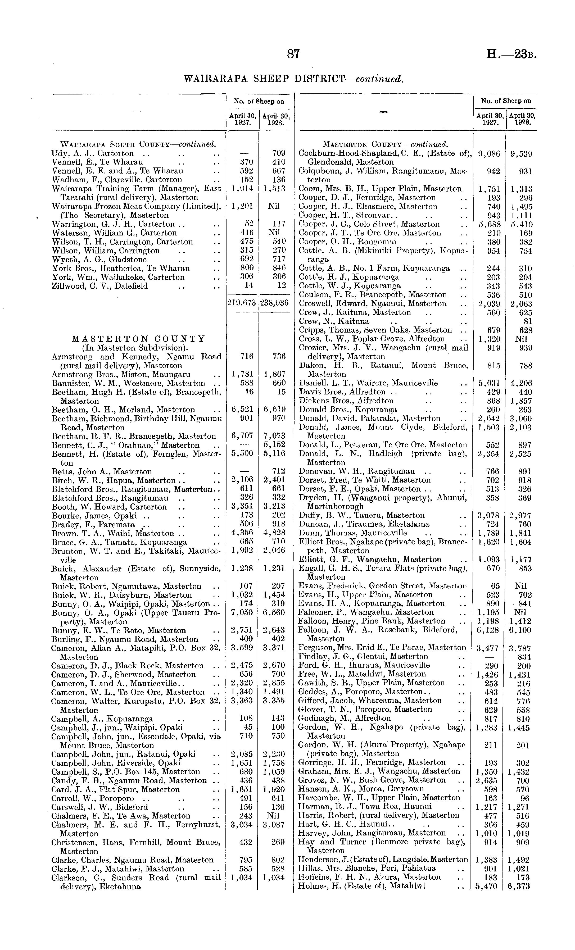 No. of Sheep on April 30, April 30, 1927. 1928. Waerarapa South County—continued. Udy, A. J., Carterton .. .. .. — 709 Vennell, E., Te Wharau .. .. 370 410 Vennell, E. E. and A., Te Wharau .. 592 667 Wadham, F., Clareville, Carterton .. 152 136 Wairarapa Training Farm (Manager), East 1,014 1,513 Taratahi (rural delivery), Masterton Wairarapa Frozen Meat Company (Limited), 1,201 Nil (The Secretary), Masterton Warrington, G. J. H., Carterton .. .. 52 117 Watersen, William G., Carterton .. 416 Nil Wilson, T. H., Carrington, Carterton .. 475 540 Wilson, William, Carrington .. .. 315 270 Wyeth, A. G., Gladstone .. .. 692 717 York Bros., Heatherlea, Te Wharau .. 800 846 York, Wm, Waihakeke, Carterton .. 306 306 Zillwood, C. V., Dalefield .. .. 14 12 219,673 238,036 MASTERTON COUNTY (In Masterton Subdivision). Armstrong and Kennedy, Ngamu Road 716 736 (rural mail delivery), Masterton Armstrong Bros., Miston, Maungaru .. 1,781 1,867 Bannister, W. M., Westmere, Masterton .. 588 660 Beetham, Hugh H. (Estate of), Brancepeth, 16 15 Masterton Beetham, O. H., Morland, Masterton .. 6,521 6,619 Beetham, Richmond, Birthday Hill, Ngaumu 901 970 Road, Masterton Beetham, R. F. R., Brancepeth, Masterton 6,707 7,073 Bennett, C. J., " Otahuao," Masterton .. — 5,152 Bennett, H. (Estate of), Fernglen, Master- 5,500 5,116 ton Betts, John A., Masterton .. .. — 712 Birch, W. R., Hapua, Masterton .. .. 2,106 2,401 Blatchford Bros., Rangitumau, Masterton.. 611 661 Blatchford Bros., Rangitumau .. .. 326 332 Booth, W. Howard, Carterton .. .. 3,351 3,213 Bourke, James, Opaki .. .. .. 173 202 Bradey, F., Paremata .. .. .. 506 918 Brown, T. A., Waihi, Masterton .. .. 4,356 4,828 Bruce, G. A., Tamata, Kopuaranga .. 665 710 Brunton, W. T. and E., Takitaki, Maurice- 1,992 2,046 ville Buiok, Alexander (Estate of), Sunnyside, 1,238 1,231 Masterton Buick, Robert, Ngamutawa, Masterton .. 107 207 Buick, W. H., Daisyburn, Masterton .. 1,032 1,454 Bunny, O. A., Waipipi, Opaki, Masterton .. 174 319 Bunny, O. A., Opaki (Upper Taueru Pro- 7,050 6,560 perty), Masterton Bunny, E. W., Te Roto, Masterton .. 2,751 2,643 Burling, F., Ngaumu Road, Masterton .. 400 402 Cameron, Allan A., Matapihi, P.O. Box 32, 3,599 3,371 Masterton Cameron, D. J., Black Rock, Masterton .. 2,475 2,670 Cameron, D. J., Sherwood, Masterton .. 656 700 Cameron, I. and A., Mauriceville.. .. 2,320 2,855 Cameron, W. L., Te Ore Ore, Masterton .. 1,340 1,491 Cameron, Walter, Kurupatu, P.O. Box 32, 3,363 3,355 Masterton Campbell, A., Kopuaranga .. .. 108 143 Campbell, J., jun., Waipipi, Opaki .. 45 100 Campbell, John,-jun., Essendale, Opaki. via 710 750 Mount Bruce, Masterton Campbell, John, jun., Ratanui, Opaki .. 2,085 2,230 Campbell, John, Riverside, Opaki .. 1,651 1,758 Campbell, S., P.O. Box 145, Masterton .. 680 1,059 Candy, F. H., Ngaumu Road, Masterton .. 436 438 Card, J. A., Flat Spur, Masterton .. 1,651 1,920 Carroll, W., Poroporo .. .. .. 491 641 Carswell, J. W., Bideford .. .. 156 136 Chalmers, F. E., Te Awa, Masterton .. 243 Nil Chalmers, M. E. and F. H., Fernyhurst, 3,034 3,087 Masterton Christensen, Hans, Fernhill, Mount Bruce, 432 269 Masterton Clarke, Charles, Ngaumu Road, Masterton 795 802 Clarke, F. J., Matahiwi, Masterton .. 585 528 Clarkson, G., Sunders Road (rural mail 1,034 1,034 delivery), Eketahuna