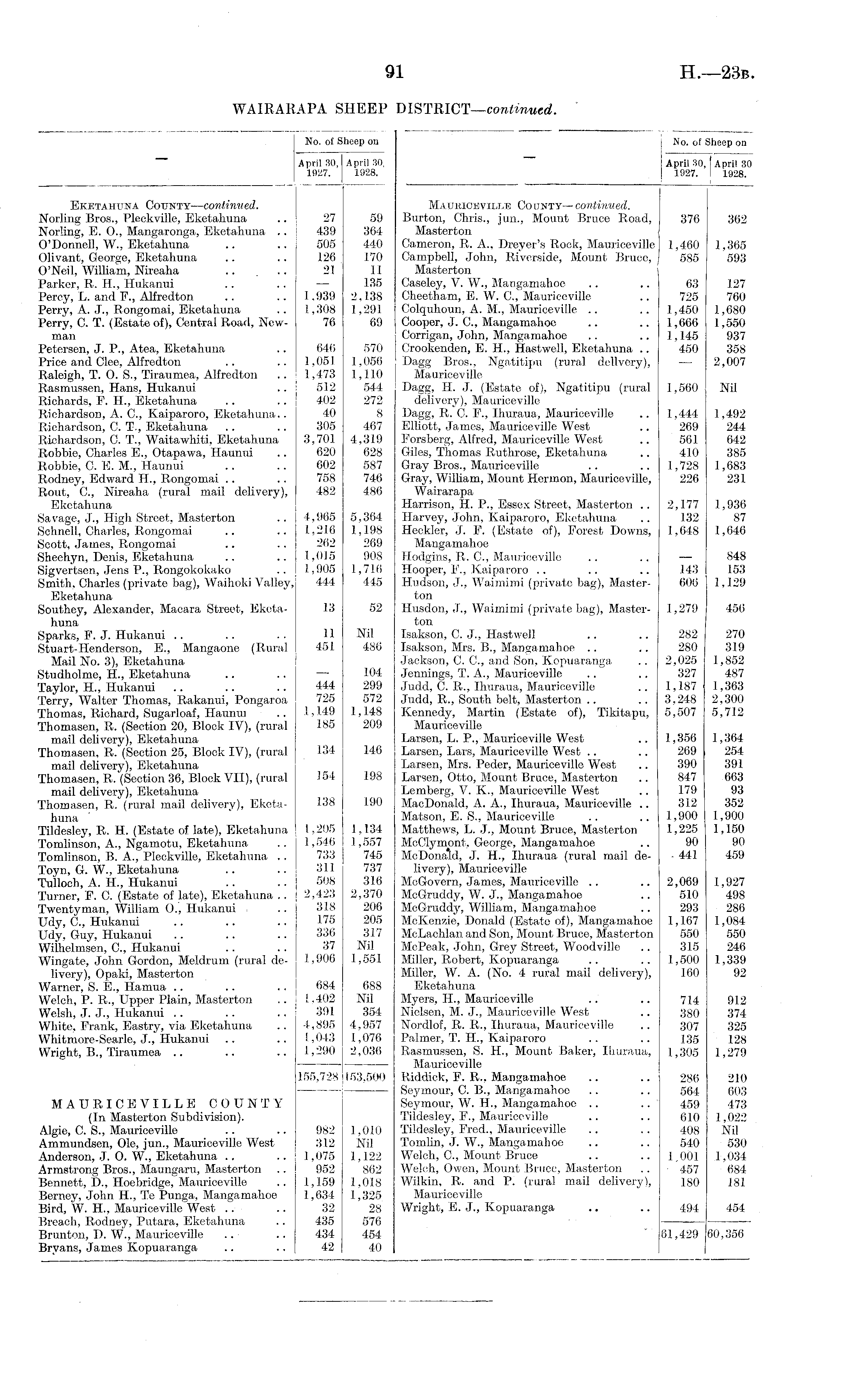 [ No. of Sheep on April 30, I April 30 1927. I 1928. Maubioeville County— continued. Burton, Chris., jun., Mount Bruce Road, 376 362 Masterton Cameron, R. A., Dreyer's Rook, Mauriceville 1,460 1,365 Campbell, John, Riverside, Mount Bruce, 585 593 Masterton Caseley, V. W., Mangamahoe .. .. 63 127 Cheetham, E. W. C., Mauriceville .. 725 760 Colquhoun, A. M., Mauriceville .. .. 1,450 1,680 Cooper, J. C., Mangamahoe .. .. 1,666 1,550 Corrigan, John, Mangamahoe .. .. 1,145 937 Crookenden, E. H., Hastwell, Eketahuna .. 450 358 Dagg Bros., Ngatitipu (rural delivery), — 2,007 Mauriceville Dagg, H. J. (Estate of), Ngatitipu (rural 1,560 Nil delivery), Mauriceville Dagg, R. C. E., Ihuraua, Mauriceville .. 1,444 1,492 Elliott, James, Mauriceville West .. 269 244 Forsberg, Alfred, Mauriceville West .. 561 642 Giles, Thomas Ruthrose, Eketahuna .. 410 385 Gray Bros., Mauriceville .. .. 1,728 1,683 Gray, William, Mount Hermon, Mauriceville, 226 231 Wairarapa Harrison, H. P., Essex Street, Masterton .. 2,177 1,936 Harvey, John. Kaiparoro, Eketahuna .. 132 87 Heckler, J. P. (Estate of), Forest Downs, 1,648 1,646 Mangamahoe Hodgins, R. C., Mauriceville .. .. — 848 Hooper, F., Kaiparoro .. .. .. 143 153 Hudson, J., Waimimi (private bag), Master- 606 1,129 ton Husdon, J., Waimimi (private bag), Master- 1,279 456 ton Isakson, C. J., Hastwell .. .. 282 270 Isakson, Mrs. B., Mangamahoe .. .. 280 319 Jackson, C. C., and Son, Kopuaranga .. 2,025 1,852 Jennings, T. A., Mauriceville .. .. 327 487 Judd, C. R., Ihuraua, Mauriceville .. 1,187 1,363 Judd, R., South belt, Masterton .. .. 3,248 2,300 Kennedy, Martin (Estate of), Tikitapu, 5,507 5,712 Mauriceville Larsen, L. P., Mauriceville West .. 1,356 1,364 Larsen, Lars, Mauriceville West .. .. 269 254 Larsen, Mrs. Peder, Mauriceville West .. 390 391 Larsen, Otto, Mount Bruce, Masterton .. 847 663 Lemberg, V. K., Mauriceville West .. 179 93 MacDonald, A. A., Ihuraua, Mauriceville .. 312 352 Matson, E. S., Mauriceville .. .. 1,900 1,900 Matthews, L. J., Mount Bruce, Masterton 1,225 1,150 McClymont, George, Mangamahoe .. 90 90 McDonald, J. H., Ihuraua (rural mail de- - 441 459 livery), Mauriceville McGovern, James, Mauriceville .. .. 2,069 1,927 McGruddy, W. J., Mangamahoe .. 510 498 MeGruddy, William, Mangamahoe .. 293 286 McKenzie, Donald (Estate of), Mangamahoe 1,167 1,084 McLachlan and Son, Mount Bruce, Masterton 550 550 McPeak, John, Grey Street, Woodville .. 315 246 Miller, Robert, Kopuaranga .. .. 1,500 1,339 Miller, W. A. (No. 4 rural mail delivery), 160 92 Eketahuna Myers, H., Mauriceville .. .. 714 912 Nielsen, M. J., Mauriceville West .. 380 374 Nordlof, R. R., Ihuraua, Mauriceville .. 307 325 Palmer, T. H., Kaiparoro .. .. 135 128 Rasmussen, S. H., Mount Baker, Ihuraua, 1,305 1,279 Mauriceville Riddick, F. R., Mangamahoe .. .. 286 210 Seymour, C. B., Mangamahoe .. .. 564 603 Seymour, W. H., Mangamahoe .. .. 459 473 Tildesley, F., Mauriceville .. .. 610 1,022 Tildesley, Fred., Mauriceville .. .. 408 Nil Tomlin, J. W., Mangamahoe .. .. 540 530 Welch, C., Mount Bruce .. .. 1,001 1,034 Welch, Owen, Mount Bruce, Masterton .. 457 684 Wilkin, R. and P. (rural mail delivery), 180 181 Mauriceville Wright, E. J., Kopuaranga .. .. 494 454 " 61,429 60,356