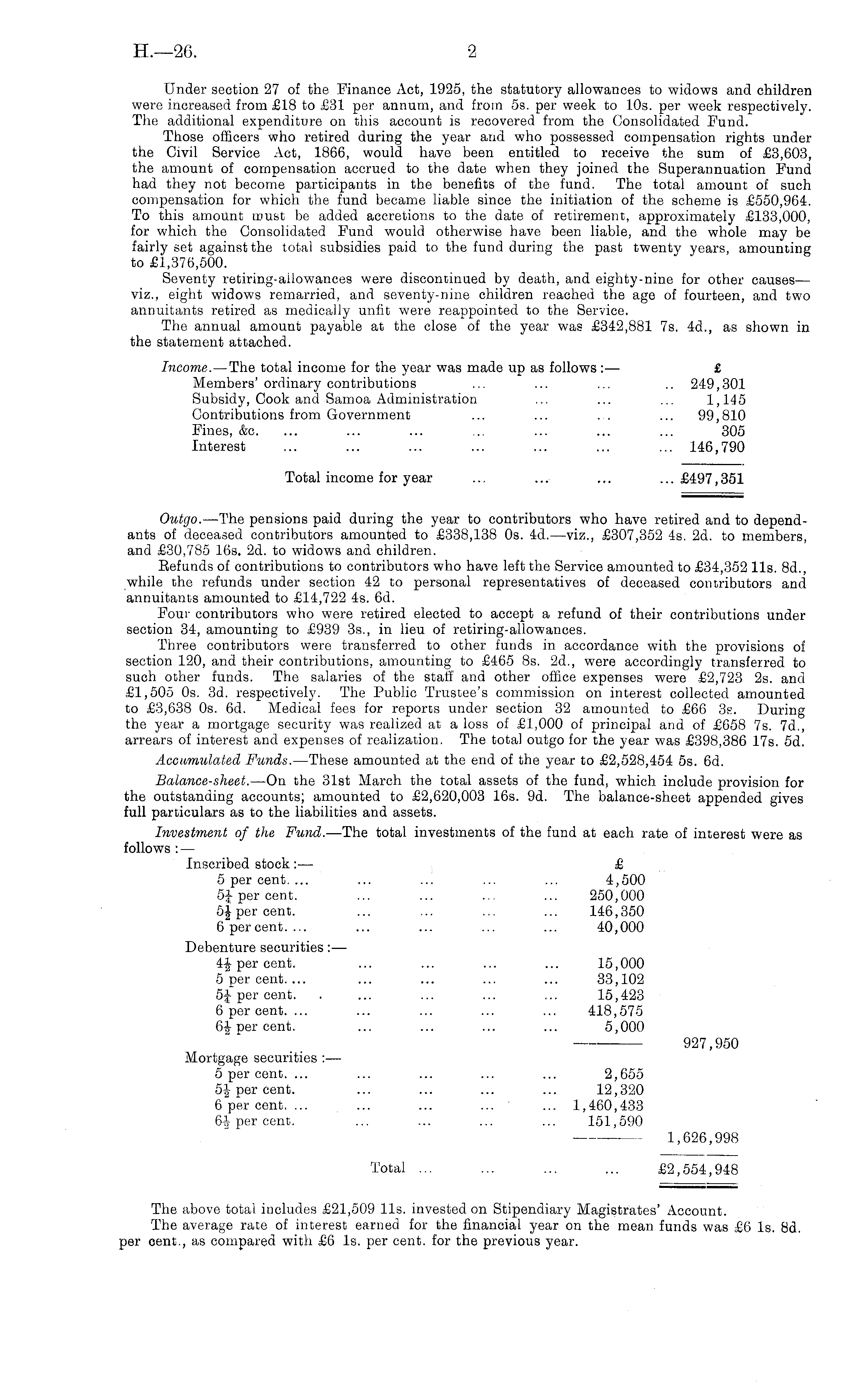 Under section 27 of the Finance Act, 1925, the statutory allowances to widows and children were increased from £18 to £31 per annum, and from ss. per week to 10s. per week respectively. The additional expenditure on this account is recovered from the Consolidated Fund. Those officers who retired during the year and who possessed compensation rights under the Civil Service Act, 1866, would have been entitled to receive the sum of £3,603, the amount of compensation accrued to the date when they joined the Superannuation Fund had they not become participants in the benefits of the fund. The total amount of such compensation for which the fund became liable since the initiation of the scheme is £550,964. To this amount must be added accretions to the date of retirement, approximately £133,000, for which the Consolidated Fund would otherwise have been liable, and the whole may be fairly set against the total subsidies paid to the fund during the past twenty years, amounting to £1,376,500. Seventy retiring-ailowances were discontinued by death, and eighty-nine for other causes— viz., eight widows remarried, and seventy-nine children reached the age of fourteen, and two annuitants retired as medically unfit were reappointed to the Service. The annual amount payable at the close of the year was £342,881 7s. 4d., as shown in the statement attached. Income.—The total income for the year was made up as follows :— £ Members'ordinary contributions ... ... ... .. 249,301 Subsidy, Cook and Samoa Administration ... ... ... 1,145 Contributions from Government ... ... . . ... 99,810 Fines, &c. ... ... ... ... ... ... ... 305 Interest ... ... ... ... ... ... ... 146,790 Total income for year ... ... ... ...£497,351 Outgo.—The pensions paid during the year to contributors who have retired and to dependants of deceased contributors amounted to £338,138 os. 4d.—viz., £307,352 4s. 2d. to members, and £30,785 16s. 2d. to widows and children. Refunds of contributions to contributors who have left the Service amounted to £34,352 lis. Bd., while the refunds under section 42 to personal representatives of deceased contributors and annuitants amounted to £14,722 4s. 6d. Four contributors who were retired elected to accept a refund of their contributions under section 34, amounting to £939 35., in lieu of retiring-allowances. Three contributors were transferred to other funds in accordance with the provisions of section 120, and their contributions, amounting to £465 Bs. 2d., were accordingly transferred to such other funds. The salaries of the staff and other office expenses were £2,723 2s. and £1,505 os. 3d. respectively. The Public Trustee's commission on interest collected amounted to £3,638 os. 6d. Medical fees for reports under section 32 amounted to £66 3s. During the year a mortgage security was realized at a loss of £1,000 of principal and of £658 7s. 7d., arrears of interest and expenses of realization. The total outgo for the year was £398,386 17s. sd. Accumulated Funds. —These amounted at the end of the year to £2,528,454 ss. 6d. Balance-sheet. —On the 31st March the total assets of the fund, which include provision for the outstanding accounts; amounted to £2,620,003 16s. 9d. The balance-sheet appended gives full particulars as to the liabilities and assets. Investment of the Fund.—The total investments of the fund at each rate of interest were as follows : — Inscribed stock :— £ 5 per cent. ... ... ... ... ... 4,500 5J per cent. ... ... .. ... 250,000 5| per cent. ... ... ... ... 146,350 6 percent. ... ... ... ... ... 40,000 Debenture securities:— 4\ per cent. ... ... ... ... 15,000 5 per cent.... ... ... ... ... 33,102 5J per cent. . ... ... ... ... 15,423 6 per cent. ... ... ... ... ... 418,575 6J per cent. ... ... ... ... 5,000 927,950 Mortgage securities : — 5 per cent. ... ... ... ... ... 2,655 5| per cent. ... ... ... ... 12,320 6 per cent. ... ... ... ... ... 1,460,433 6+ per cent. ... ... ... ... 151,590 1,626,998 Total ... ... ... ... £2,554,948 The above total includes £21,509 lis. invested on Stipendiary Magistrates' Account. The average rate of interest earned for the financial year on the mean funds was £6 Is. Bd. per cent., as compared with £6 Is. per cent, for the previous year.