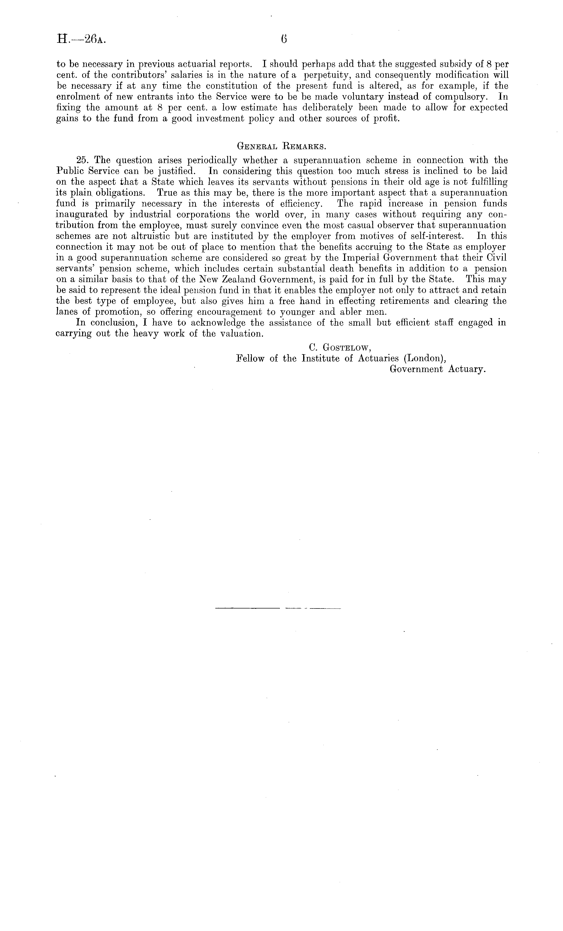 to be necessary in previous actuarial reports. I should perhaps add that the suggested subsidy of 8 per cent, of the contributors' salaries is in the nature of a perpetuity, and consequently modification will be necessary if at any time the constitution of the present fund is altered, as for example, if the enrolment of new entrants into the Service were to be be made voluntary instead of compulsory. In fixing the amount at 8 per cent, a low estimate has deliberately been made to allow for expected gains to the fund from a good investment policy and other sources of profit. General Remarks. 25. The question arises periodically whether a superannuation scheme in connection with the Public Service can be justified. In considering this question too much stress is inclined to be laid on the aspect that a State which leaves its servants without pensions in their old age is not fulfilling its plain obligations. True as this may be, there is the more important aspect that a superannuation fund is primarily necessary in the interests of efficiency. The rapid increase in pension funds inaugurated by industrial corporations the world over, in many cases without requiring any contribution from the employee, must surely convince even the most casual observer that superannuation schemes are not altruistic but are instituted by the employer from motives of self-interest. In this connection it may not be out of place to mention that the benefits accruing to the State as employer in a good superannuation scheme are considered so great by the Imperial Government that their Civil servants' pension scheme, which includes certain substantial death benefits in addition to a pension on a similar basis to that of the New Zealand Government, is paid for in full by the State. This may be said to represent the ideal pension fund in that it enables the employer not only to attract and retain the best type of employee, but also gives him a free hand in effecting retirements and clearing the lanes of promotion, so offering encouragement to younger and abler men. In conclusion, I have to acknowledge the assistance of the small but efficient staff engaged in carrying out the heavy work of the valuation. C. Gostelow, Fellow of the Institute of Actuaries (London), Government Actuary.