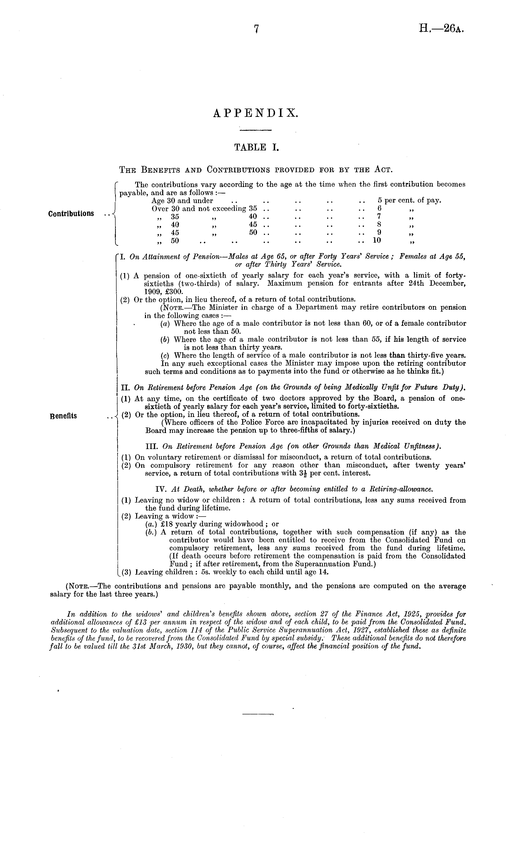 TABLE I. The Benefits and Contributions provided for by the Act. The contributions vary according to the age at the time when the first contribution becomes payable, and are as follows :— Age 30 and under .. .. .. .. 5 per cent, of pay. „ ... Over 30 and not exceeding 35 .. .. .. 6 „• Contributions ..J 35 40 .. 7 40 45 '.. !. ..8 " „ 45 „ 50 .. .. .. ..9 „ 50 .. .. .. .. .. .. 10 "I. On Attainment of Pension—Males at Age 65, or after Forty Years' Service ; Females at Age 55, or after Thirty Years' Service. (1) A pension of one-sixtieth of yearly salary for each year's service, with a limit of forty - sixtieths (two-thirds) of salary. Maximum pension for entrants after 24th Deoember, 1909, £300. (2) Or the option, in lieu thereof, of a return of total contributions. (Note. —The Minister in charge of a Department may retire contributors on pension in the following cases : — (а) Where the age of a male contributor is not less than 60, or of a female contributor not less than 50. (б) Where the age of a male contributor is not less than 55, if his length of service is not less than thirty years. (c) Where the length of service of a male contributor is not less than thirty-five years. In any such exceptional cases the Minister may impose upon the retiring contributor such terms and conditions as to payments into the fund or otherwise as he thinks fit.) 11. On Retirement before Pension Age (on the Grounds of being Medically Unfit for Future Duty). (1) At any time, on the certificate of two doctors approved by the Board, a pension of onesixtieth of yearly salary for each year's service, limited to forty-sixtieths. Benefits .. < (2) Or the option, in lieu thereof, of a return of total contributions. (Where officers of the Police Force are incapacitated by injuries received on duty the Board may increase the pension up to three-fifths of salary.) 111. On Retirement before Pension Age (on other Grounds than Medical Unfitness). (1) On voluntary retirement or dismissal for misconduct, a return of total contributions. (2) On compulsory retirement for any reason other than misconduct, after twenty years' service, a return of total contributions with 3J per cent, interest. IV. At Death, whether before or after becoming entitled to a Retiring-allowance. (1) Leaving no widow or children : A return of total contributions, less any sums received from the fund during lifetime. (2) Leaving a widow : — (a.) £18 yearly during widowhood ; or (b.) A return of total contributions, together with such compensation (if any) as the contributor would have been entitled to receive from the Consolidated Fund on compulsory retirement, less any sums received from the fund during lifetime. (If death occurs before retirement the compensation is paid from the Consolidated Fund ; if after retirement, from the Superannuation Fund.) (3) Leaving children : ss. weekly to each child until age 14. (Note. —The contributions and pensions are payable monthly, and the pensions are computed on the average salary for the last three years.) In addition to the widows' and children's benefits shown above, section 27 of the Finance Act, 1925, provides for additional allowances of £13 per annum in respect of the widow and of each child, to be paid from the Consolidated Fund. Subsequent to the valuation date, section 114 of the Public Service Superannuation Act, 1927, established these as definite benefits of the fund, to be recovered from the Consolidated Fund by special subsidy. These additional benefits do not therefore fall to be valued till the 31st March, 1930, but they cannot, of course, affect the financial position of the fund.