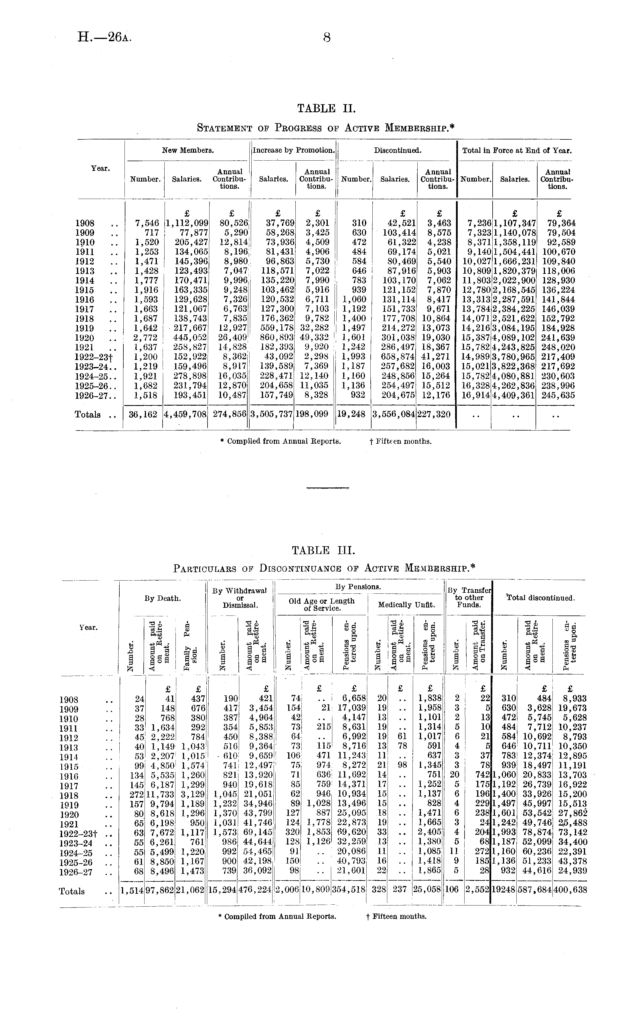 New Members. Increase by Promotion. Discontinued. Total in Force at End of Year. ear * Annual Annual Annual Annual Number. Salaries. Contribu- Salaries. Contribu- Number. Salaries. Contribu- Number. Salaries. Contributions. tions. tions. tions. Il £ £ I £ £ £ £ £ £ 1908 .. 7,546 1,112,099 80,526, 37,769 2,301 310 42,521 3,463 7,2361,107,347 79,364 1909 .. 717 77,877 5,290 58,268 3,425 630 103,414 8,575 7,3231,140,078 79,504 1910 .. 1,520 205,427 12,814 73,936 4,509 472 61,322 4,238 8,3711,358,119 92,589 1911 .. 1,253 134,065 8,196 81,431 4,906 484 69,174 5,021 9,1401,504,441 100,670 1912 .. 1,471 145,396 8,980 96,863 5,730 584 80,469 5,540 10,0271,666,231 109,840 1913 ., 1,428 123,493 7,047 118,571 7,022 646 87,916 5,903 10,8091,820,379 118,006 1914 .. 1,777 170,471 9,996 135,220 7,990 783 103,170 7,062 11,8032,022,900 128,930 1915 .. 1,916 163,335 9,248 103,462 5,916 939 121,152 7,870 12,7802,168,545 136,224 1916 .. 1,593 129,628 7,326 120,532 6,711 1,060 131,114 8,417 13,313 2,287,591 141,844 1917 .. 1,663 121,067 6,763 127,300 7,103 1,192 151,733 9,671 13,7842,384,225 146,039 1918 .. 1,687 138,743 7,835 176,362 9,782 1,400 177,708 10,864 14,0712,521,622 152,792 1919 .. 1,642 217,667 12,927 559,178 32,282 [ 1,497 214,272 13,073 14,2163,084,195 184,928 1920 .. 2,772 445,052 26,409' 860,893 49,332 |! 1,601 301,038 19,030 15,3874,089,102 241,639 1921 .. 1,637 258,827 14,828j 182,393 9,920 1,242 286,497 18,367 15,782 4,243,825 248,020 1922-23t 1,200 152,922 8,362 43,092 2,298 1,993 658,874 41,271 14,989 3,780,965 217,409 1923-24.. 1,219 159,496 8,917 139,589 7,369 1,187 257,682 16,003 15,0213,822,368 217,692 1924-25.. 1,921 278,898 16,035 228,471 12,140 1,160 248,856 15,264 15,7824,080,881 230,603 1925-26.. 1,682 231,794 12,870 204,658 11,035 1,136 254,497 15,512 16,328 4,262,836 238,996 1926-27.. 1,518 193,451 10,487 157,749 8,328 932 204,675 12,176 16,914 4,409,361 245,635 Totals .. 36,162 4,459,708 274,856 3,505,737 198,099 19,248 3,556,084 227,320 - 1 ■ I , j * Compiled from Annual Reports. t Fifteen months.