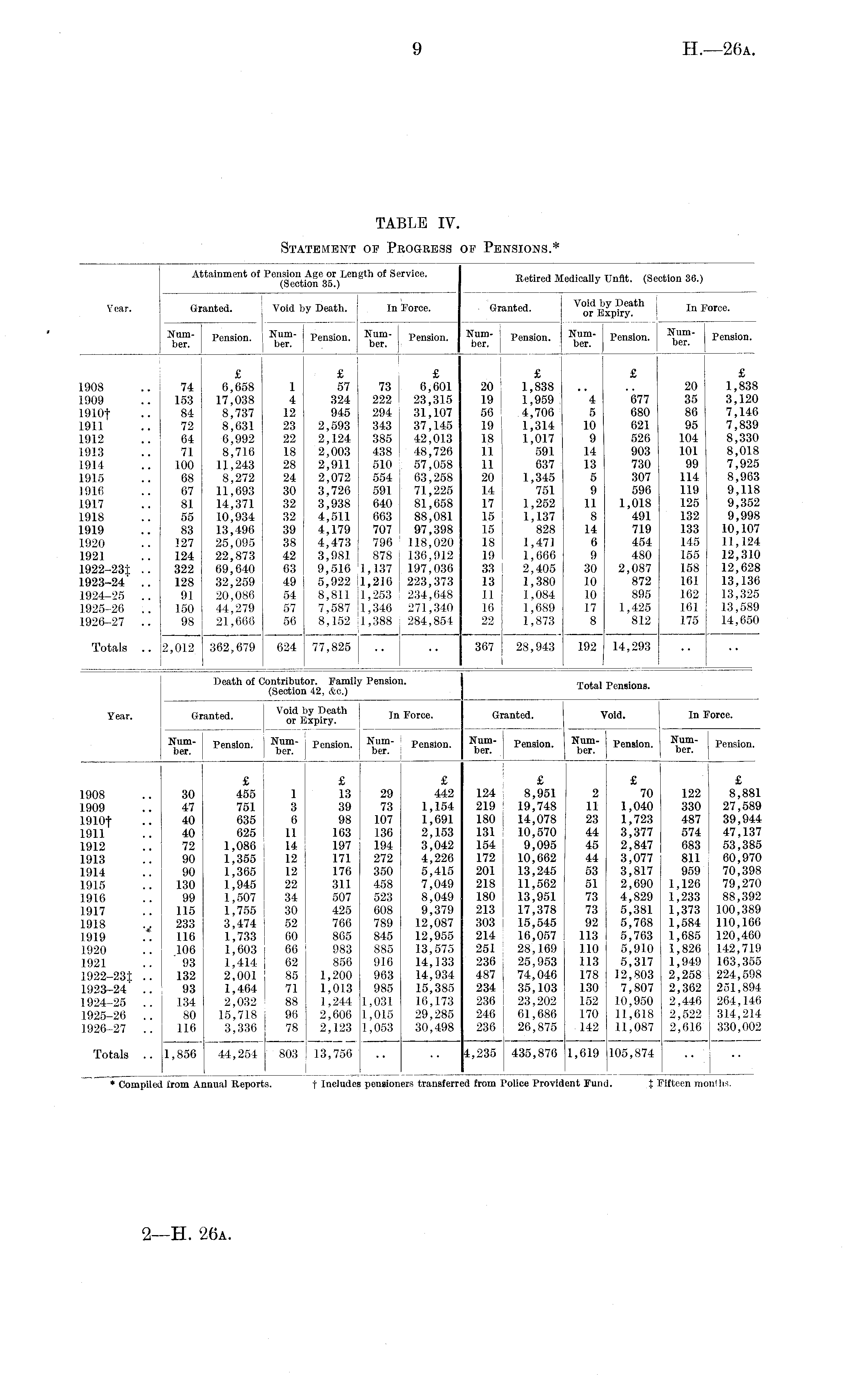 Attainment of Pen|on Length of Service. Retired Medically Unflfc . (Section 36<) Year. Granted. I Void by Death. In Force. Granted. In Force * Num- Pension. I um " Pension. Num- Pension. Num- Pension. Num- Pension. Pension, ber. ber. ber. ber. ber. «er. £ £ £ £ £ £ 1908 .. 74 6,658 1 57 73 6,601 20 1,838 .. .. 20 1,838 1909 .. 153 17,038 4 324 222 23,315 19 1,959 4 677 35 3,120 1910f 84 8,737 12 945 294 31,107 56 4,706 5 680 86 7,146 1911 .. 72 8,631 23 2,593 343 37,145 19 1,314 10 621 95 7,839 1912 .. 64 6,992 22 2,124 385 42,013 18 1,017 9 526 104 8,330 1913 .. 71 8,716 18 2,003 438 48,726 11 591 14 903 101 8,018 1914 .. 100 11,243 28 2,911 510 57,058 11 637 13 730 99 7,925 1915 .. 68 8,272 24 2,072 554 63,258 20 1,345 5 307 114 8,963 1916 .. 67 11,693 30 3,726 591 71,225 14 751 9 596 119 9,118 1917 .. 81 14,371 32 3,938 640 81,658 17 1,252 11 1,018 125 9,352 1918 .. 55 10,934 32 4,511 663 88,081 15 1,137 8 491 132 9,998 1919 .. 83 13,496 39 4,179 707 97,398 15 828 14 719 133 10,107 1920 .. 127 25,095 38 4,473 796 118,020 18 1,471 6 454 145 11,124 1921 .. 124 22,873 42 3,981 878 136,912 19 1,666 9 480 155 12,310 1922-23J .. 322 69,640 63 9,516 1,137 197,036 33 I 2,405 30 2,087 158 12,628 1923-24 .. 128 32,259 49 5,922 1,216 223,373 13 1,380 10 872 161 13,136 1924-25 .. 91 20,086 54 8,811 1,253 234,648 11 1,084 10 895 162 13,325 1925-26 .. 150 44,279 57 7,587 1,346 271,340 16 1,689 17 1,425 161 13,589 1926-27 .. 98 21,666 56 8,152 1,388 284,854 22 1,873 8 812 175 14,650 Totals .. 2,012 362,679 624 77,825 .. .. 367 28,943 192 14,293 1 Death of Contributor. Family Pension. P[iT1 -, ma (Section 42, &c.) ic " ;a ' r "- nsI0ns - Year. Granted. V °or Expiry 1 ' 11 In Force. Granted. Void. In Force. Num- pension. Num- pension. Num- Pension. Num- Pension. Num- p enB i on . Pension, ber. ber. ber. ber. ber. ber. £ £ £ £ £ £ 1908 .. 30 455 1 13 29 442 124 8,951 2 70 122 8,881 1909 .. 47 751 3 39 73 1,154 219 19,748 11 1,040 330 27,589 1910f .. 40 635 6 98 107 1,691 180 14,078 23 1,723 487 39,944 1911 .. 40 625 11 163 136 2,153 131 10,570 44 3,377 574 47,137 1912 .. 72 1,086 14 197 194 3,042 154 9,095 45 2,847 683 53,385 1913 .. 90 1,355 12 171 272 4,226 172 10,662 44 3,077 811 60,970 1914 .. 90 1,365 12 176 350 5,415 201 13,245 53 3,817 959 70,398 1915 .. 130 1,945 22 311 458 7,049 218 11,562 51 2,690 1,126 79,270 1916 .. 99 1,507 34 507 523 8,049 180 13,951 73 4,829 1,233 88,392 1917 .. 115 1,755 30 425 608 9,379 213 17,378 73 5,381 1,373 100,389 1918 .. 233 3,474 52 766 789 12,087 303 15,545 92 5,768 1,584 110,166 1919 .. 116 1,733 60 865 845 12,955 214 16,057 113 5,763 1,685 120,460 1920 .. 106 1,603 66 983 885 13,575 251 28,169 110 5,910 1,826 142,719 1921 .. 93 1,414 62 856 916 14,133 236 25,953 113 5,317 1,949 163,355 1922-23J .. 132 2,001 ! 85 1,200 963 14,934 487 74,046 178 12,803 2,258 224,598 1923-24 .. 93 1,464 71 1,013 985 15,385 234 35,103 130 7,807 2,362 251,894 1924-25 .. 134 2,032 ' 88 1,244 1,031 16,173 236 23,202 152 10,950 2,446 264,146 1925-26 .. 80 15,718 96 2,606 1,015 29,285 246 61,686 170 11,618 2,522 314,214 1926-27 .. .116 3,336 78 2,123 1,053 30,498 236 26,875 142 11,087 2,616 330,002 Totals .. 1,856 44,254 803 13,756 .. .. 4,235 435,876 1,619 105,874 * Compiled from Annual Reports. f Includes pensioners transferred from Police Provident Fund. J Fifteen monlhs.