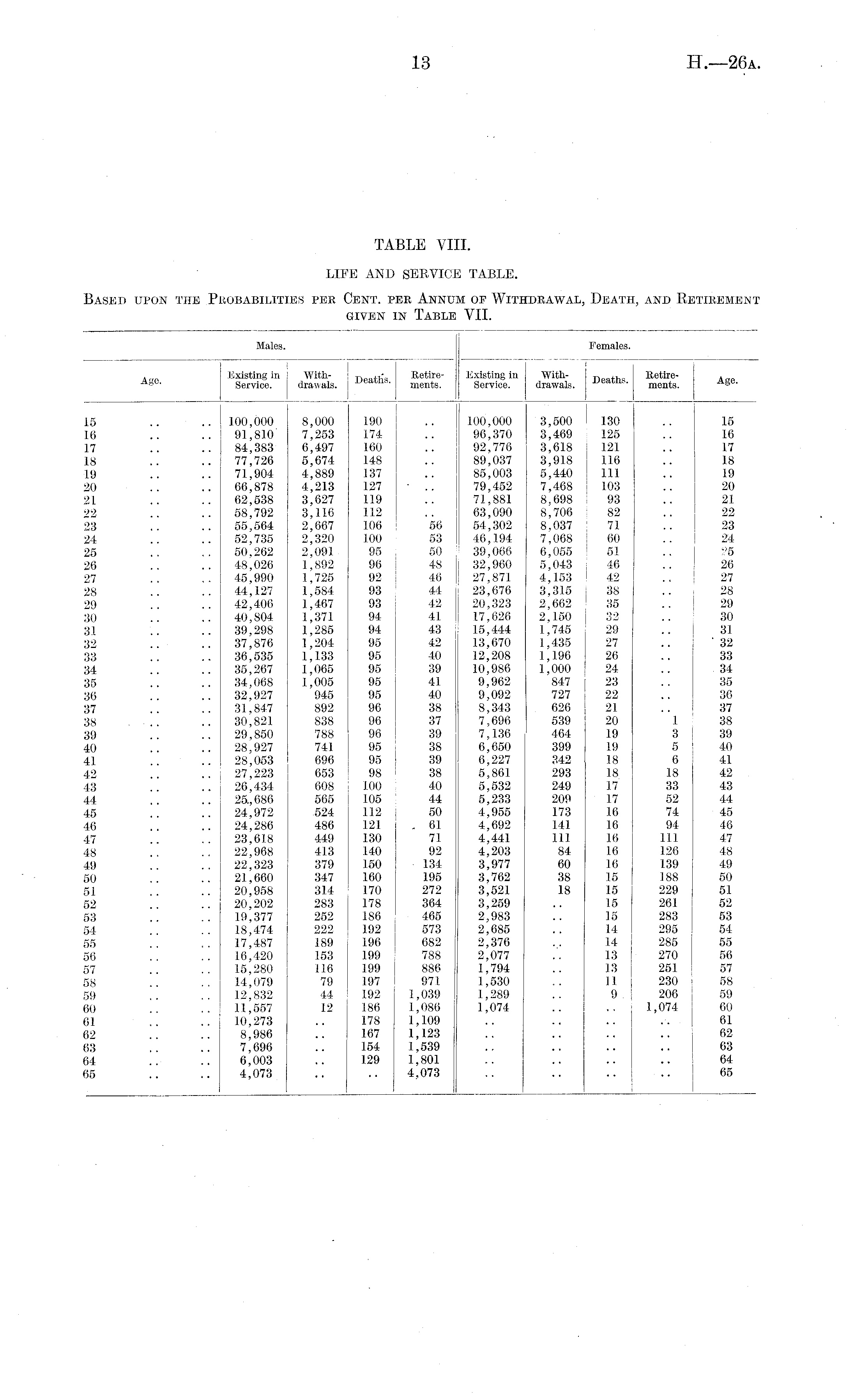 TABLE VIII. LIFE AND SERVICE TABLE. Based upon the Probabilities per Cent. per Annum of Withdrawal, Death, and Retirement given in Table VII.