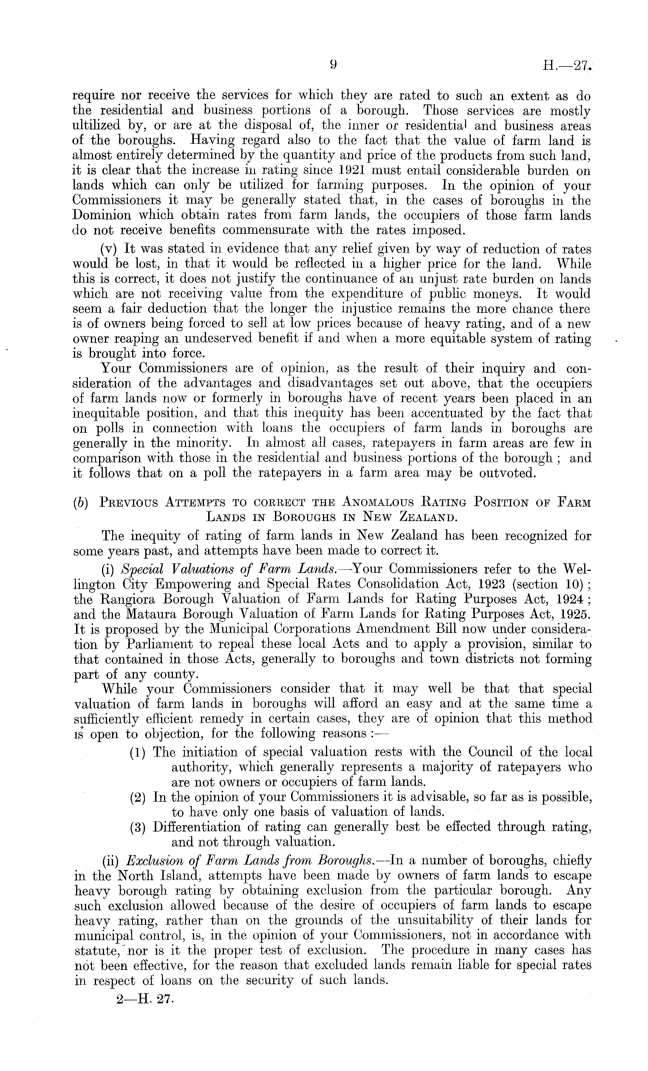 require nor receive the services for which they are rated to such an extent as do the residential and business portions of a borough. Those services are mostly ultilized by, or are at the disposal of, the inner or residential and business areas of the boroughs. Having regard also to the fact that the value of farm land is almost entirely determined by the quantity and price of the products from such land, it is clear that the increase in rating since 1921 must entail considerable burden on lands which can only be utilized for farming purposes. In the opinion of your Commissioners it may be generally stated that, in the cases of boroughs in the Dominion which obtain rates from farm lands, the occupiers of those farm lands do not receive benefits commensurate with the rates imposed. (v) It was stated in evidence that any relief given by way of reduction of rates would be lost, in that it would be reflected in a higher price for the land. While this is correct, it does not justify the continuance of an unjust rate burden on lands which are not receiving value from the expenditure of public moneys. It would seem a fair deduction that the longer the injustice remains the more chance there is of owners being forced to sell at low prices because of heavy rating, and of a new owner reaping an undeserved benefit if and when a more equitable system of rating is brought into force. Your Commissioners are of opinion, as the result of their inquiry and consideration of the advantages and disadvantages set out above, that the occupiers of farm lands now or formerly in boroughs have of recent years been placed in an inequitable position, and that this inequity has been accentuated by the fact that on polls in connection with loans the occupiers of farm lands in boroughs are generally in the minority. In almost all cases, ratepayers in farm areas are few in comparison with those in the residential and business portions of the borough ; and it follows that on a poll the ratepayers in a farm area may be outvoted. (b) Previous Attempts to correct the Anomalous Eating Position of Farm Lands in Boroughs in New Zealand. The inequity of rating of farm lands in New Zealand has been recognized for some years past, and attempts have been made to correct it. (i) Special Valuations of Farm, Lands. —Your Commissioners refer to the Wellington City Empowering and Special Rates Consolidation Act, 1923 (section 10) ; the Rangiora Borough Valuation of Farm Lands for Rating Purposes Act, 1924 ; and the Mataura Borough Valuation of Farm Lands for Rating Purposes Act, 1925. It is proposed by the Municipal Corporations Amendment Bill now under consideration by Parliament to repeal these local Acts and to apply a provision, similar to that contained in those Acts, generally to boroughs and town districts not forming part of any county. While your Commissioners consider that it may well be that that special valuation of farm lands in boroughs will afford an easy and at the same time a sufficiently efficient remedy in certain cases, they are of opinion that this method is open to objection, for the following reasons : — (1) The initiation of special valuation rests with the Council of the local authority, which generally represents a majority of ratepayers who are not owners or occupiers of farm lands. (2) In the opinion of your Commissioners it is advisable, so far as is possible, to have only one basis of valuation of lands. (3) Differentiation of rating can generally best be effected through rating, and not through valuation. (ii) Exclusion of Farm Lands from Boroughs.—ln a number of boroughs, chiefly in the North Island, attempts have been made by owners of farm lands to escape heavy borough rating by obtaining exclusion from the particular borough. Any such exclusion allowed because of the desire of occupiers of farm lands to escape heavy rating, rather than on the grounds of the unsuitahility of their lands for municipal control, is, in the opinion of your Commissioners, not in accordance with statute, nor is it the proper test of exclusion. The procedure in many cases has not been effective, for the reason that excluded lands remain liable for special rates in respect of loans on the security of such lands.