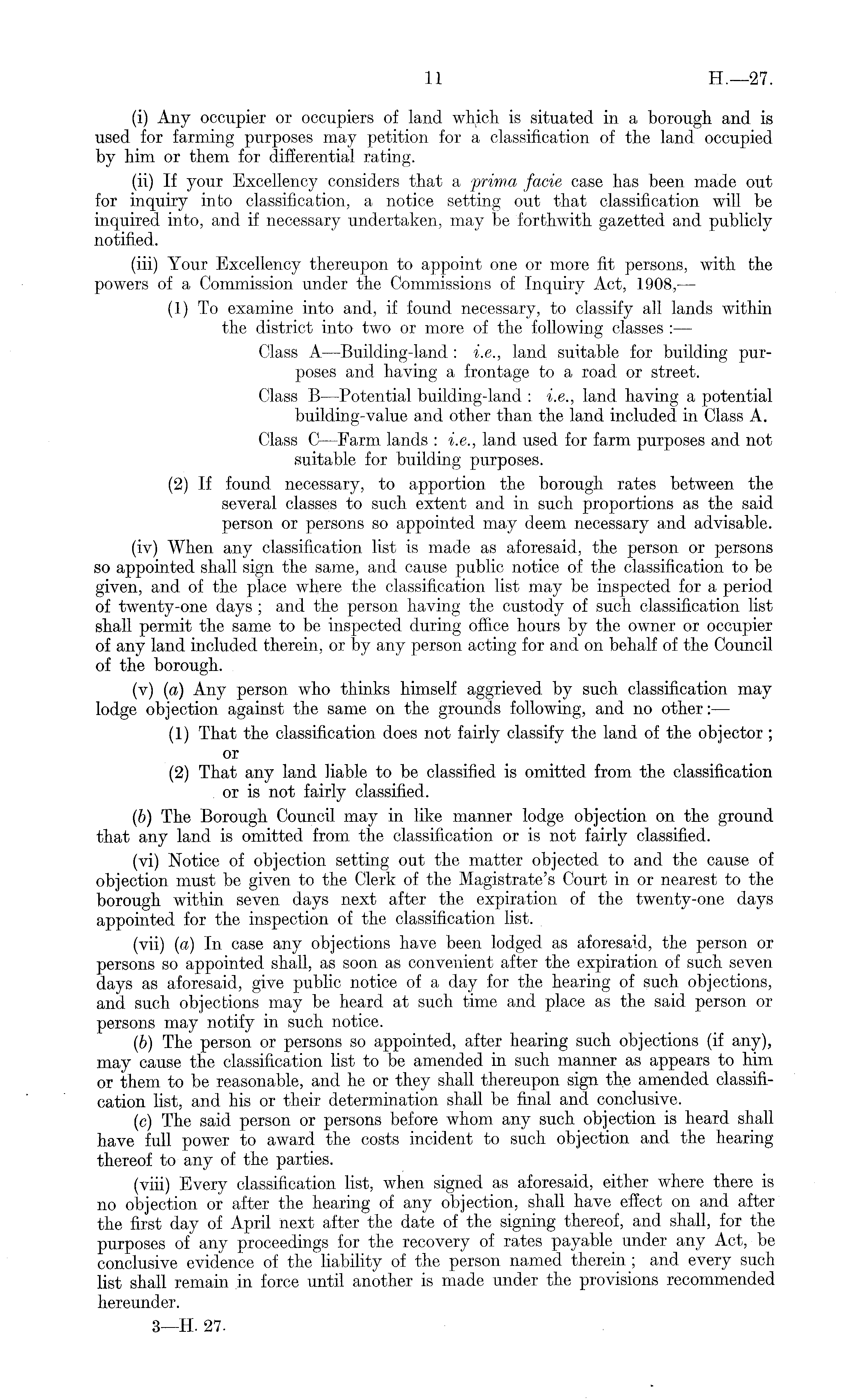 (i) Any occupier or occupiers of land which is situated in a borough and is used for farming purposes may petition for a classification of the land occupied by him or them for differential rating. (ii) If your Excellency considers that a prima facie case has been made out for inquiry into classification, a notice setting out that classification will be inquired into, and if necessary undertaken, may be forthwith gazetted and publicly notified. (iii) Your Excellency thereupon to appoint one or more fit persons, with the powers of a Commission under the Commissions of Inquiry Act, 1908, — (1) To examine into and, if found necessary, to classify all lands within the district into two or more of the following classes : — Class A—Building-land : i.e., land suitable for building purposes and having a frontage to a road or street. Class B —Potential building-land : i.e., land having a potential building-value and other than the land included in Class A. Class C—Farm lands : i.e., land used for farm purposes and not suitable for building purposes. (2) If found necessary, to apportion the borough rates between the several classes to such extent and in such proportions as the said person or persons so appointed may deem necessary and advisable. (iv) When any classification list is made as aforesaid, the person or persons so appointed shall sign the same, and cause public notice of the classification to be given, and of the place where the classification list may be inspected for a period of twenty-one days ; and the person having the custody of such classification list shall permit the same to be inspected during office hours by the owner or occupier of any land included therein, or by any person acting for and on behalf of the Council of the borough. (v) (a) Any person who thinks himself aggrieved by such classification may lodge objection against the same on the grounds following, and no other: — (1) That the classification does not fairly classify the land of the objector ; or (2) That any land liable to be classified is omitted from the classification or is not fairly classified. (b) The Borough Council may in like manner lodge objection on the ground that any land is omitted from the classification or is not fairly classified. (vi) Notice of objection setting out the matter objected to and the cause of objection must be given to the Clerk of the Magistrate's Court in or nearest to the borough within seven days next after the expiration of the twenty-one days appointed for the inspection of the classification list. (vii) (a) In case any objections have been lodged as aforesaid, the person or persons so appointed shall, as soon as convenient after the expiration of such seven days as aforesaid, give public notice of a day for the hearing of such objections, and such objections may be heard at such time and place as the said person or persons may notify in such notice. (b) The person or persons so appointed, after hearing such objections (if any), may cause the classification list to be amended in such manner as appears to him or them to be reasonable, and he or they shall thereupon sign the amended classification list, and his or their determination shall be final and conclusive. (c) The said person or persons before whom any such objection is heard shall have full power to award the costs incident to such objection and the hearing thereof to any of the parties. (viii) Every classification list, when signed as aforesaid, either where there is no objection or after the hearing of any objection, shall have effect on and after the first day of April next after the date of the signing thereof, and shall, for the purposes of any proceedings for the recovery of rates payable under any Act, be conclusive evidence of the liability of the person named therein ; and every such list shall remain in force until another is made under the provisions recommended hereunder.