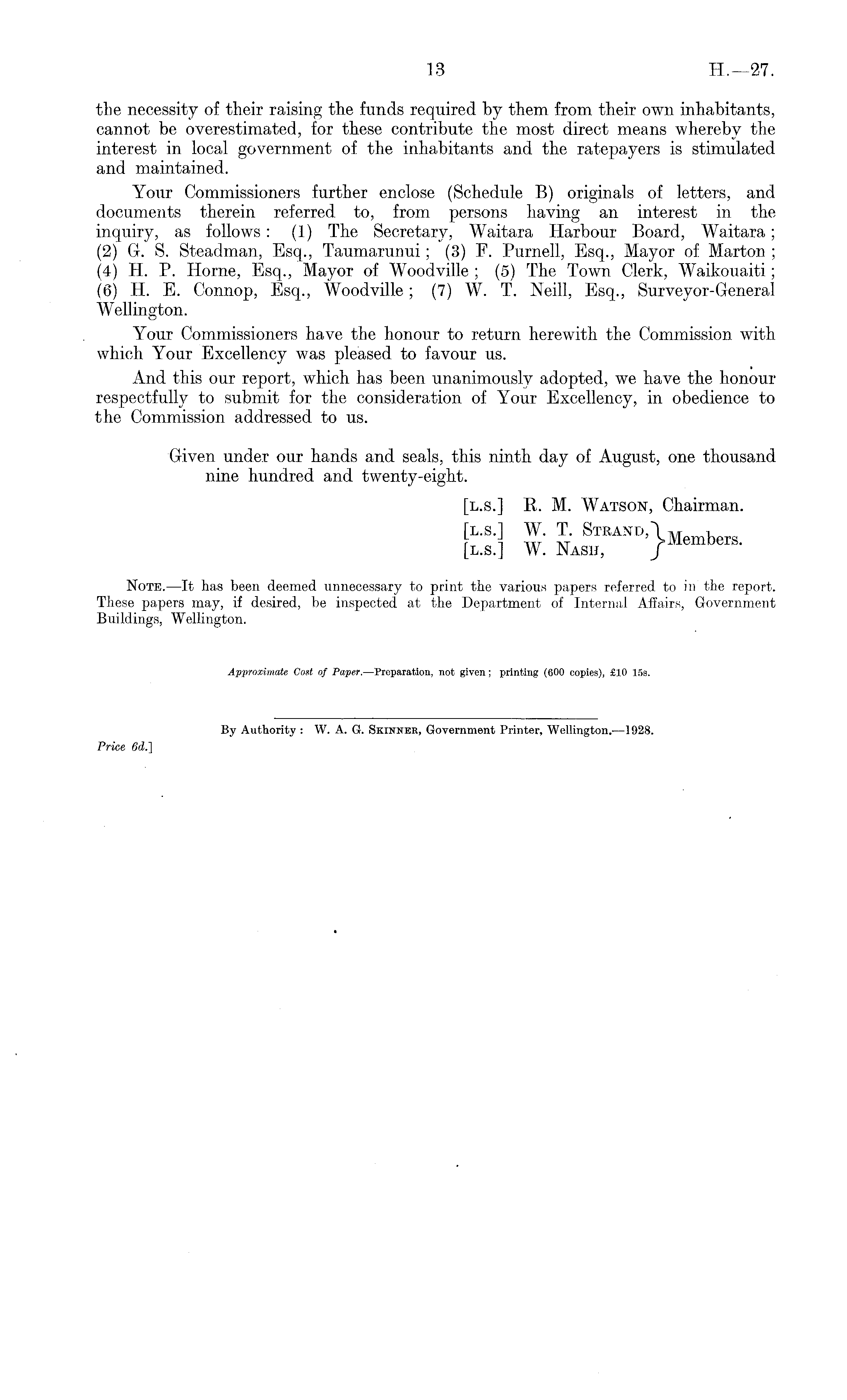 the necessity of their raising the funds required by them from their own inhabitants, cannot be overestimated, for these contribute the most direct means whereby the interest in local government of the inhabitants and the ratepayers is stimulated and maintained. Your Commissioners further enclose (Schedule B) originals of letters, and documents therein referred to, from persons having an interest in the inquiry, as follows : (1) The Secretary, Waitara Harbour Board, Waitara; (2) G. S. Steadman, Esq., Taumarunui; (3) F. Purnell, Esq., Mayor of Marton ; (4) H. P. Home, Esq., Mayor of Woodville ; (5) The Town Clerk, Waikouaiti; (6) H. E. Connop, Esq., Woodville ; (7) W. T. Neill, Esq., Surveyor-General Wellington. Your Commissioners have the honour to return herewith the Commission with which Your Excellency was pleased to favour us. And this our report, which has been unanimously adopted, we have the honour respectfully to submit for the consideration of Your Excellency, in obedience to the Commission addressed to us. Given under our hands and seals, this ninth day of August, one thousand nine hundred and twenty-eight. [l.s.] R. M. Watson, Chairman. [l.s.] W. T. Strand,\ M b [l.s.] W. Nash, j> Members. Note.—lt has been deemed unnecessary to print the various papers referred to in the report. These papers may, if desired, be inspected at the Department of Internal Affairs, Government Buildings, Wellington.