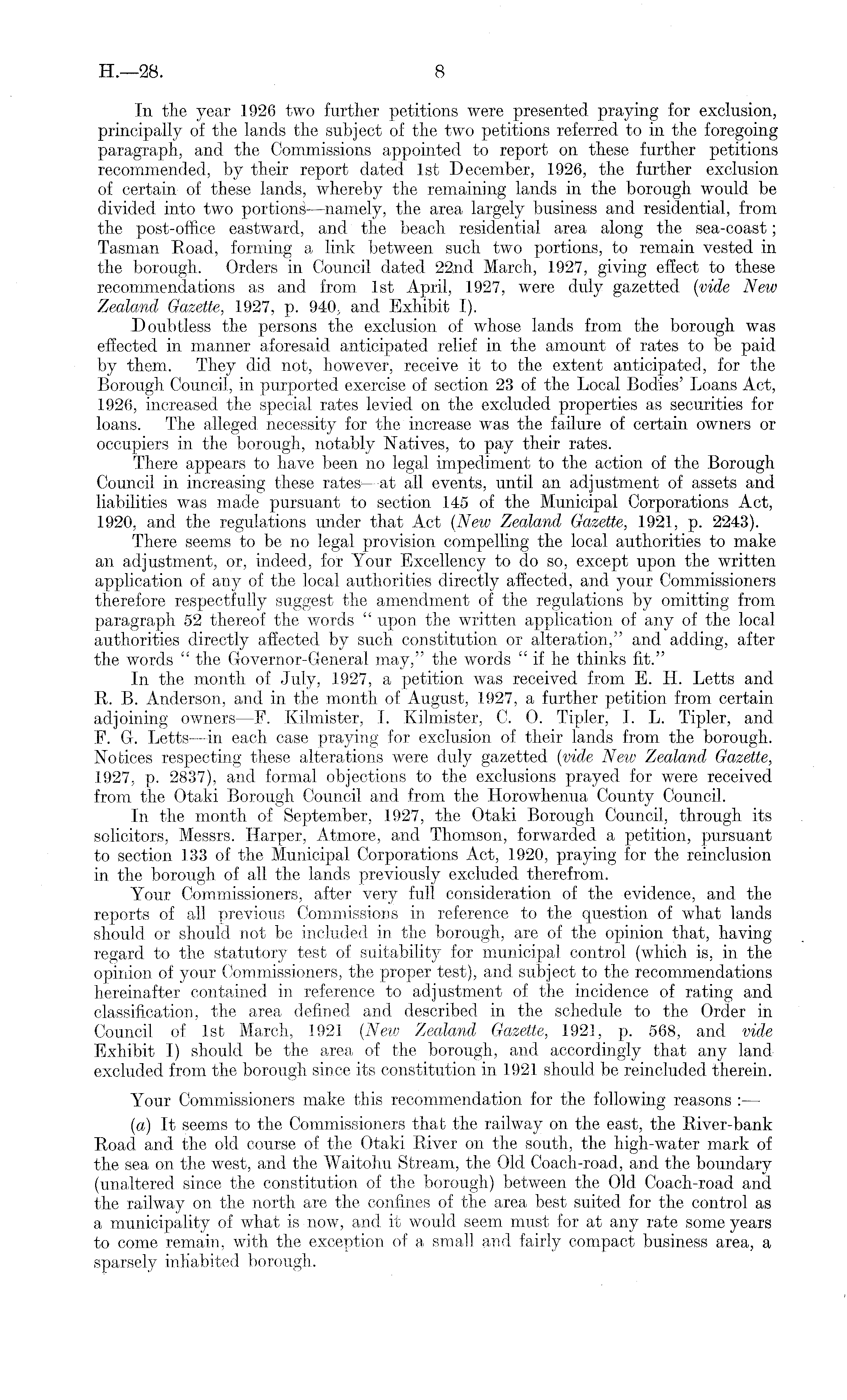 In tlie year 1926 two further petitions were presented praying for exclusion, principally of the lands the subject of the two petitions referred to in the foregoing paragraph, and the Commissions appointed to report on these further petitions recommended, by their report dated Ist December, 1926, the further exclusion of certain of these lands, whereby the remaining lands in the borough would be divided into two portions —namely, the area largely business and residential, from the post-office eastward, and the beach residential area along the sea-coast; Tasman Road, forming a link between such two portions, to remain vested in the borough. Orders in Council dated 22nd March, 1927, giving effect to these recommendations as and from Ist April, 1927, were duly gazetted (vide New Zealand Gazette, 1927, p. 940 } and Exhibit I). Doubtless the persons the exclusion of whose lands from the borough was effected in manner aforesaid anticipated relief in the amount of rates to be paid by them. They did not, however, receive it to the extent anticipated, for the Borough Council, in purported exercise of section 23 of the Local Bodies' Loans Act, 1926, increased the special rates levied on the excluded properties as securities for loans. The alleged necessity for the increase was the failure of certain owners or occupiers in the borough, notably Natives, to pay their rates. There appears to have been no legal impediment to the action of the Borough Council in increasing these rates— -at all events, until an adjustment of assets and liabilities was made pursuant to section 145 of the Municipal Corporations Act, 1920, and the regulations under that Act (New Zealand Gazette, 1921, p. 2243). There seems to be no legal provision compelling the local authorities to make an adjustment, or, indeed, for Your Excellency to do so, except upon the written application of any of the local authorities directly affected, and your Commissioners therefore respectfully suggest the amendment of the regulations by omitting from paragraph 52 thereof the words " upon the written application of any of the local authorities directly affected by such constitution or alteration," and adding, after the words " the Governor-General may," the words " if he thinks fit." In the month of July, 1927, a petition was received from E. H. Letts and R. B. Anderson, and in the month of August, 1927, a further petition from certain adjoining owners —F. Kilmister, I. Kilmister, C. 0. Tipler, I. L. Tipler, and E. G. Letts —in each case praying for exclusion of their lands from the borough. Notices respecting these alterations were duly gazetted (vide New Zealand Gazette, 1927, p. 2837), and formal objections to the exclusions prayed for were received from the Otaki Borough Council and from the Horowhenua County Council. In the month of September, 1927, the Otaki Borough Council, through its solicitors, Messrs. Harper, Atmore, and Thomson, forwarded a petition, pursuant to section 133 of the Municipal Corporations Act, 1920, praying for the reinclusion in the borough of all the lands previously excluded therefrom. Your Commissioners, after very full consideration of the evidence, and the reports of all previous Commissions in reference to the question of what lands should or should not be included in the. borough, are of the opinion that, having regard to the statutory test of suitability for municipal control (which is, in the opinion of your Commissioners, the proper test), and. subject to the recommendations hereinafter contained in reference to adjustment of the incidence of rating and classification, the area defined and described in the schedule to the Order in Council of Ist March, 1921 (New- Zealand Gazette, 1921, p. 568, and vide Exhibit I) should be the area of the borough, and accordingly that any land excluded from the borough since its constitution in 1921 should be reincluded therein. Your Commissioners make this recommendation for the following reasons : — (a) It seems to the Commissioners that the railway on the east, the River-bank Road and the old course of the Otaki River on the south, the high-water mark of the sea on the west, and the Waitohu Stream, the Old Coach-road, and the boundary (unaltered since the constitution of the borough) between the Old Coach-road and the railway on the north are the confines of the area best suited for the control as a municipality of what is now, and it would seem must for at any rate some years to come remain, with the exception of a small and fairly compact business area, a sparsely inhabited borough.