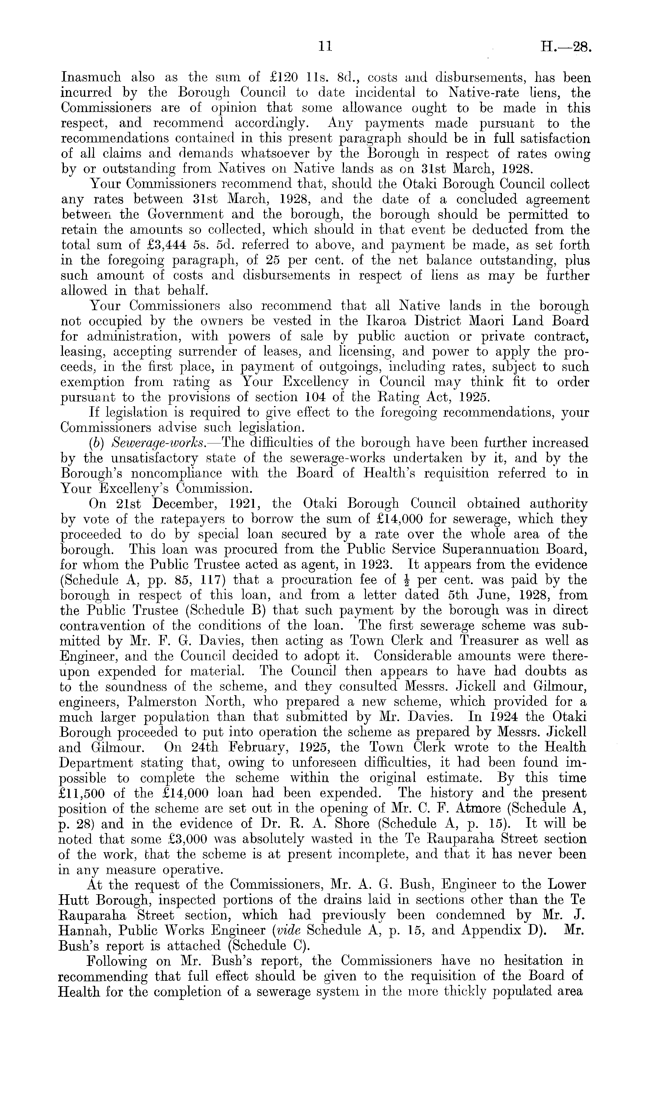 Inasmuch also as the sum of £120 lis. Bc!., costs and disbursements, has been incurred by the Borough Council to date incidental to Native-rate liens, the Commissioners are of opinion that some allowance ought to be made in this respect, and recommend accordingly. Any payments made pursuant to the recommendations contained in this present paragraph should be in full satisfaction of all claims and demands whatsoever by the Borough in respect of rates owing by or outstanding from Natives on Native lands as on 31st March, 1928. Your Commissioners recommend that, should the Otaki Borough Council collect any rates between 31st March, 1928, and the date of a concluded agreement between the Government and the borough, the borough should be permitted to retain the amounts so collected, which should in that event be deducted from the total sum of £3,444 ss. sd. referred to above, and payment be made, as set forth in the foregoing paragraph, of 25 per cent, of the net balance outstanding, plus such amount of costs and disbursements in respect of liens as may be further allowed in that behalf. Your Commissioners also recommend that all Native lands in the borough not occupied by the owners be vested in the Ikaroa District Maori Land Board for administration, with powers of sale by public auction or private contract, leasing, accepting surrender of leases, and licensing, and power to apply the proceeds, in the first place, in payment of outgoings, including rates, subject to such exemption from rating as Your Excellency in Council may think fit to order pursuant to the provisions of section 104 of the Bating Act, 1925. If legislation is required to give effect to the foregoing recommendations, your Commissioners advise such legislation. (b) Sewerage-works. —The difficulties of the borough have been further increased by the unsatisfactory state of the sewerage-works undertaken by it, and by the Borough's noncompliance with the Board of Health's requisition referred to in Your Excelleny's Commission. On 21st December, 1921, the Otaki Borough Council obtained authority by vote of the ratepayers to borrow the sum of £14,000 for sewerage, which they proceeded to do by special loan secured by a rate over the whole area of the borough. This loan was procured from the Public Service Superannuation Board, for whom the Public Trustee acted as agent, in 1923. It appears from the evidence (Schedule A, pp. 85, 117) that a procuration fee of \ per cent, was paid by the borough in respect of this loan, and from a letter dated sth June, 1928, from the Public Trustee (Schedule B) that such payment by the borough was in direct contravention of the conditions of the loan. The first sewerage scheme was submitted by Mr. F. G. Davies, then acting as Town Clerk and Treasurer as well as Engineer, and the Council decided to adopt it. Considerable amounts were thereupon expended for material. The Council then appears to have had doubts as to the soundness of the scheme, and they consulted Messrs. Jickell and Gilmour, engineers, Palmerston North, who prepared a new scheme, which provided for a much larger population than that submitted by Mr. Davies. In 1924 the Otaki Borough proceeded to put into operation the scheme as prepared by Messrs. Jickell and Gilmour. On 24th February, 1925, the Town Clerk wrote to the Health Department stating that, owing to unforeseen difficulties, it had been found impossible to complete the scheme within the original estimate. By this time £11,500 of the £14.000 loan had been expended. The history and the present position of the scheme are set out in the opening of Mr. C. P. Atmore (Schedule A, p. 28) and in the evidence of Dr. R. A. Shore (Schedule A, p. 15). It will be noted, that some £3,000 was absolutely wasted in the Te Rauparaha Street section of the work, that the scheme is at present incomplete, and that it has never been in any measure operative. At the request of the Commissioners, Mr. A. G. Bush, Engineer to the Lower Hutt Borough, inspected portions of the drains laid in sections other than the Te Rauparaha Street section, which had previously been condemned by Mr. J. Hannah, Public Works Engineer (vide Schedule A, p. 15, and Appendix D). Mr. Bush's report is attached (Schedule C). Following on Mr. Bush's report, the Commissioners have no hesitation in recommending that full effect should be given to the requisition of the Board of Health for the completion of a sewerage system in the more thickly populated area
