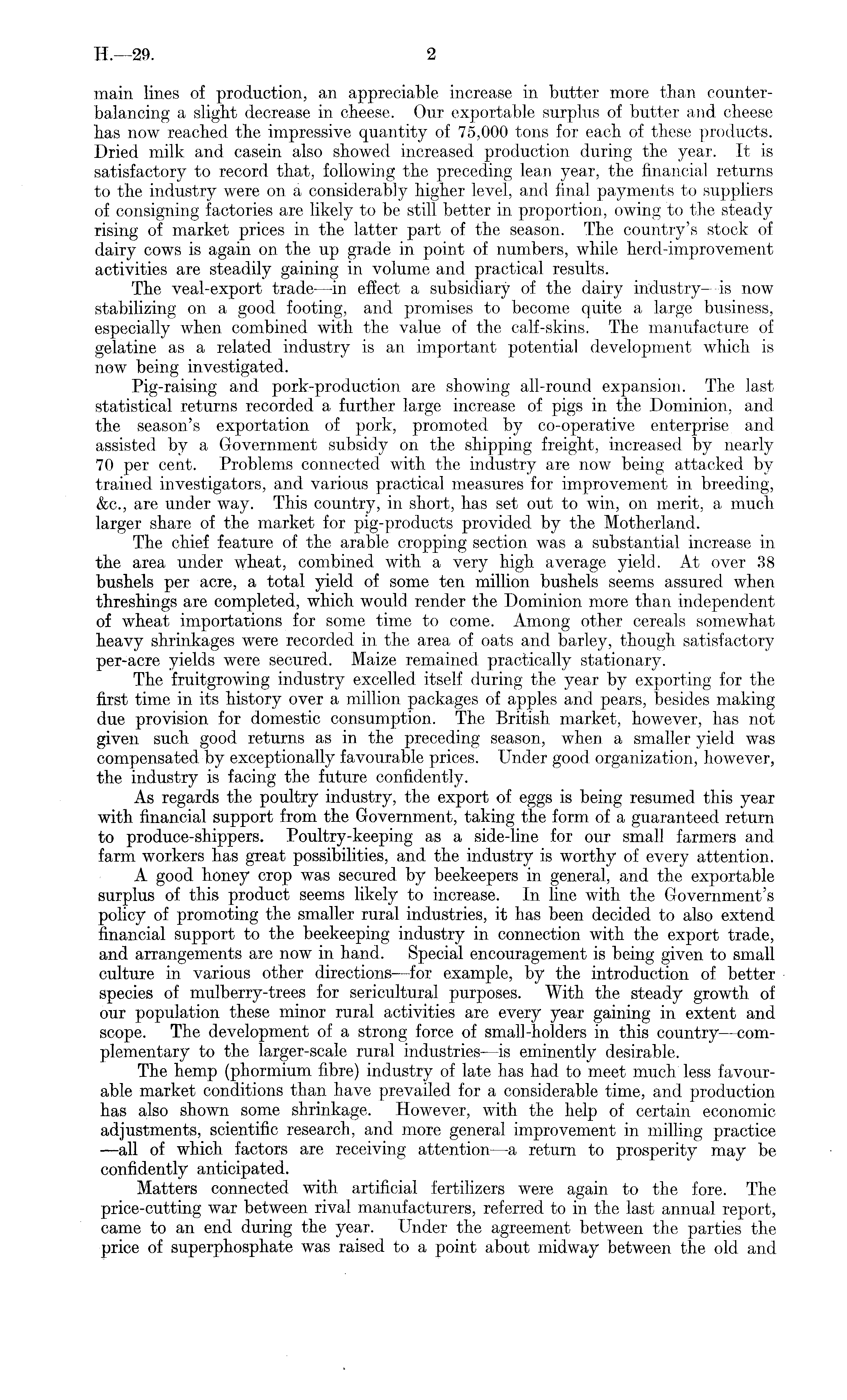 main lines of production, an appreciable increase in butter more than counterbalancing a slight decrease in cheese. Our exportable surplus of butter and cheese has now reached the impressive quantity of 75,000 tons for each of these products. Dried milk and casein also showed increased production during the year. It is satisfactory to record that, following the preceding lean year, the financial returns to the industry were on a considerably higher level, and final payments to suppliers of consigning factories are likely to be still better in proportion, owing to the steady rising of market prices in the latter part of the season. The country's stock of dairy cows is again on the up grade in point of numbers, while herd-improvement activities are steadily gaining in volume and practical results. The veal-export trade —in effect a subsidiary of the dairy industry —is now stabilizing on a good footing, and promises to become quite a large business, especially when combined with the value of the calf-skins. The manufacture of gelatine as a related industry is an important potential development which is now being investigated. Pig-raising and pork-production are showing all-round expansion. The last statistical returns recorded a further large increase of pigs in the Dominion, and the season's exportation of pork, promoted by co-operative enterprise and assisted by a Government subsidy on the shipping freight, increased by nearly 70 per cent. Problems connected with the industry are now being attacked by trained investigators, and various practical measures for improvement in breeding, &c., are under way. This country, in short, has set out to win, on merit, a much larger share of the market for pig-products provided by the Motherland. The chief feature of the arable cropping section was a substantial increase in the area under wheat, combined with a very high average yield. At over 38 bushels per acre, a total yield of some ten million bushels seems assured when threshings are completed, which would render the Dominion more than independent of wheat importations for some time to come. Among other cereals somewhat heavy shrinkages were recorded in the area of oats and barley, though satisfactory per-acre yields were secured. Maize remained practically stationary. The fruitgrowing industry excelled itself during the year by exporting for the first time in its history over a million packages of apples and pears, besides making due provision for domestic consumption. The British market, however, has not given such good returns as in the preceding season, when a smaller yield was compensated by exceptionally favourable prices. Under good organization, however, the industry is facing the future confidently. As regards the poultry industry, the export of eggs is being resumed this year with financial support from the Government, taking the form of a guaranteed return to produce-shippers. Poultry-keeping as a side-line for our small farmers and farm workers has great possibilities, and the industry is worthy of every attention. A good honey crop was secured by beekeepers in general, and the exportable surplus of this product seems likely to increase. In line with the Government's policy of promoting the smaller rural industries, it has been decided to also extend financial support to the beekeeping industry in connection with the export trade, and arrangements are now in hand. Special encouragement is being given to small culture in various other directions —for example, by the introduction of better species of mulberry-trees for sericultural purposes. With the steady growth of our population these minor rural activities are every year gaining in extent and scope. The development of a strong force of small-holders in this country —complementary to the larger-scale rural industries—is eminently desirable. The hemp (phormium fibre) industry of late has had to meet much less favourable market conditions than have prevailed for a considerable time, and production has also shown some shrinkage. However, with the help of certain economic adjustments, scientific research, and more general improvement in milling practice —all of which factors are receiving attention —a return to prosperity may be confidently anticipated. Matters connected with artificial fertilizers were again to the fore. The price-cutting war between rival manufacturers, referred to in the last annual report, came to an end during the year. Under the agreement between the parties the price of superphosphate was raised to a point about midway between the old and