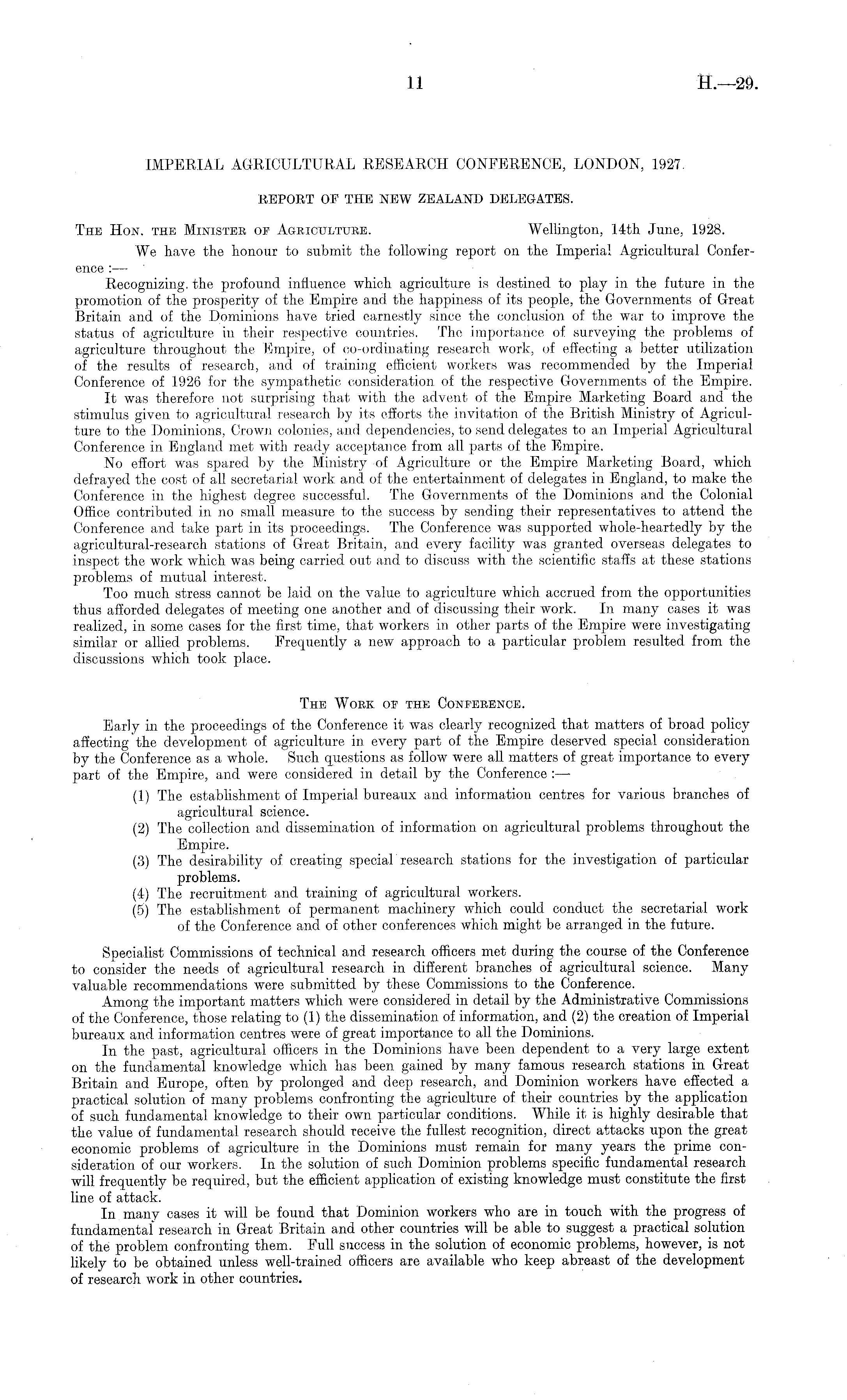 IMPERIAL AGRICULTURAL RESEARCH CONFERENCE, LONDON, 1927. REPORT OP THE NEW ZEALAND DELEGATES. The Hon. the Minister of Agriculture. Wellington, 14th June, 1928. We have the honour to submit the following report on the Imperial Agricultural Conference :— ' Recognizing, the profound influence which agriculture is destined to play in the future in the promotion of the prosperity of the Empire and the happiness of its people, the Governments of Great Britain and of the Dominions have tried earnestly since the conclusion of the war to improve the status of agriculture in their respective countries. The importance of surveying the problems of agriculture throughout the Empire, of co-ordinating research work, of effecting a better utilization of the results of research, and of training efficient workers was recommended by the Imperial Conference of 1926 for the sympathetic consideration of the respective Governments of the Empire. It was therefore not surprising that with the advent of the Empire Marketing Board and the stimulus given to agricultural research by its efforts the invitation of the British Ministry of Agriculture to the Dominions, Crown colonies, and dependencies, to send delegates to an Imperial Agricultural Conference in England met with ready acceptance from all parts of the Empire. No effort was spared by the Ministry of Agriculture or the Empire Marketing Board, which defrayed the cost of all secretarial work and of the entertainment of delegates in England, to make the Conference in the highest degree successful. The Governments of the Dominions and the Colonial Office contributed in no small measure to the success by sending their representatives to attend the Conference and take part in its proceedings. The Conference was supported whole-heartedly by the agricultural-research stations of Great Britain, and every facility was granted overseas delegates to inspect the work which was being carried out and to discuss with the scientific staffs at these stations problems of mutual interest. Too much stress cannot be laid on the value to agriculture which accrued from the opportunities thus afforded delegates of meeting one another and of discussing their work. In many cases it was realized, in some cases for the first time, that workers in other parts of the Empire were investigating similar or allied problems. Frequently a new approach to a particular problem resulted from the discussions which took place. The Work op the Conference. Early in the proceedings of the Conference it was clearly recognized that matters of broad policy affecting the development of agriculture in every part of the Empire deserved special consideration by the Conference as a whole. Such questions as follow were all matters of great importance to every part of the Empire, and were considered in detail by the Conference : — (1) The establishment of Imperial bureaux and information centres for various branches of agricultural science. (2) The collection and dissemination of information on agricultural problems throughout the Empire. (3) The desirability of creating special research stations for the investigation of particular problems. (4) The recruitment and training of agricultural workers. (5) The establishment of permanent machinery which could conduct the secretarial work of the Conference and of other conferences which might be arranged in the future. Specialist Commissions of technical and research officers met during the course of the Conference to consider the needs of agricultural research in different branches of agricultural science. Many valuable recommendations were submitted by these Commissions to the Conference. Among the important matters which were considered in detail by the Administrative Commissions of the Conference, those relating to (1) the dissemination of information, and (2) the creation of Imperial bureaux and information centres were of great importance to all the Dominions. In the past, agricultural officers in the Dominions have been dependent to a very large extent on the fundamental knowledge which has been gained by many famous research stations in Great Britain and Europe, often by prolonged and deep research, and Dominion workers have effected a practical solution of many problems confronting the agriculture of their countries by the application of such fundamental knowledge to their own particular conditions. While it is highly desirable that the value of fundamental research should receive the fullest recognition, direct attacks upon the great economic problems of agriculture in the Dominions must remain for many years the prime consideration of our workers. In the solution of such Dominion problems specific fundamental research will frequently be required, but the efficient application of existing knowledge must constitute the first line of attack. In manv cases it will be found that Dominion workers who are in touch with the progress of fundamental research in Great Britain and other countries will be able to suggest a practical solution of the problem confronting them. Full success in the solution of economic problems, however, is not likely to be obtained unless well-trained officers are available who keep abreast of the development of research work in other countries.