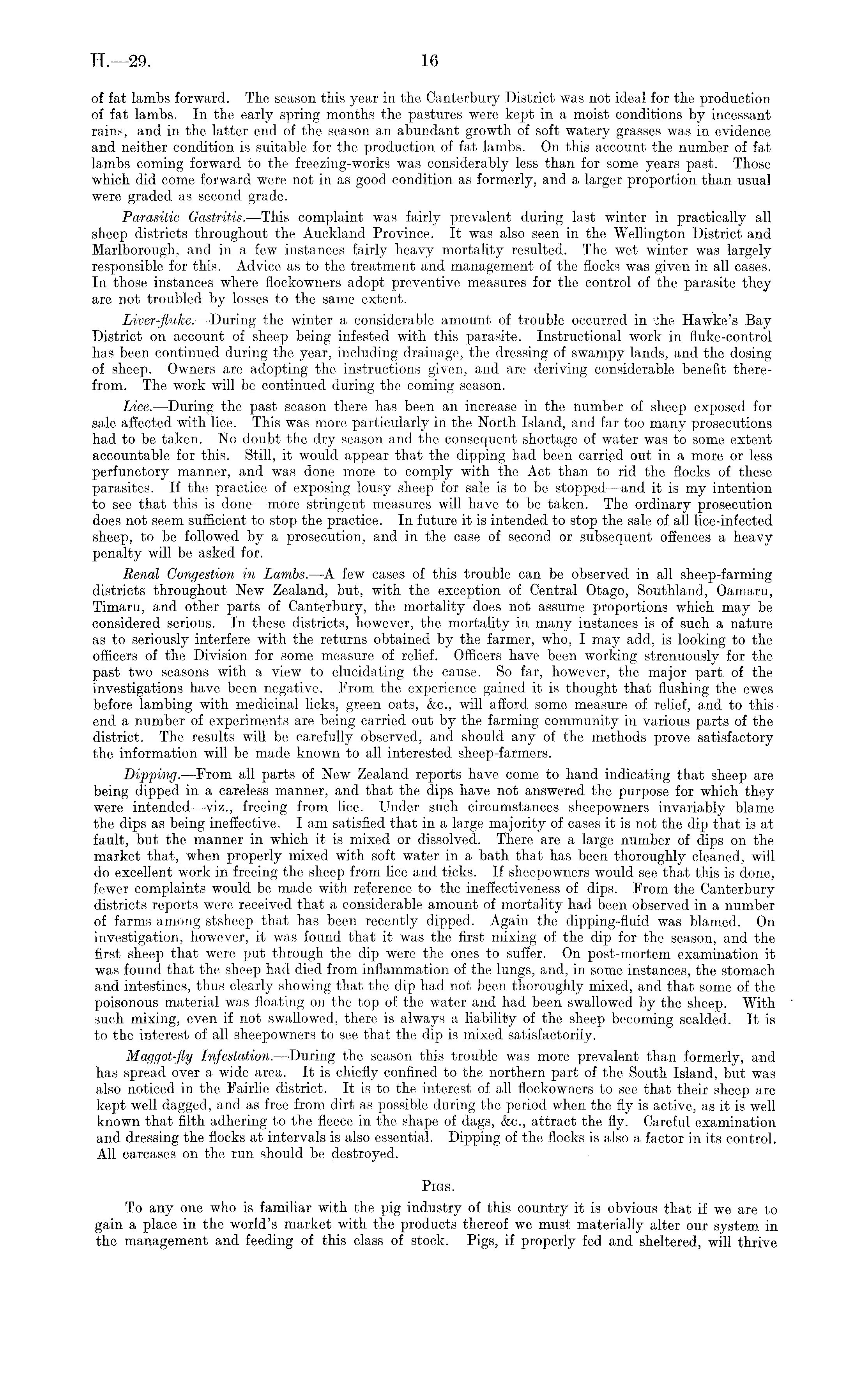 of fat lambs forward. Tie season, this year in the Canterbury District was not ideal for the production of fat lambs. In the early spring months the pastures were kept in a moist conditions by incessant rains, and in the latter end of the season an abundant growth of soft watery grasses was in evidence and neither condition is suitable for the production of fat lambs. On this account the number of fat lambs coming forward to the freezing-works was considerably less than for some years past. Those which did come forward were not in as good condition as formerly, and a larger proportion than usual were graded as second grade. Parasitic Gastritis.—This complaint was fairly prevalent during last winter in practically all sheep districts throughout the Auckland Province. It was also seen in the Wellington District and Marlborough, and in a few instances fairly heavy mortality resulted. The wet winter was largely responsible for this. Advice as to the treatment and management of the flocks was given in all cases. In those instances where flockowners adopt preventive measures for the control of the parasite they are not troubled by losses to the same extent. Liver-fluke. —During the winter a considerable amount of trouble occurred in \ihe Hawke's Bay District on account of sheep being infested with this parasite. Instructional work in fluke-control has been continued during the year, including drainage, the dressing of swampy lands, and the dosing of sheep. Owners are adopting the instructions given, and are deriving considerable benefit therefrom. The work will be continued during the coming season. Lice. —During the past season there has been an increase in the number of sheep exposed for sale affected with lice. This was more particularly in the North Island, and far too many prosecutions had to be taken. No doubt the dry season and the consequent shortage of water was to some extent accountable for this. Still, it would appear that the dipping had been carried out in a more or less perfunctory manner, and was done more to comply with the Act than to rid the flocks of these parasites. If the practice of exposing lousy sheep for sale is to be stopped—and it is my intention to see that this is done—more stringent measures will have to be taken. The ordinary prosecution does not seem sufficient to stop the practice. In future it is intended to stop the sale of all lice-infected sheep, to be followed by a prosecution, and in the case of second or subsequent offences a heavy penalty will be asked for. Renal Congestion in Lambs.—A few cases of this trouble can be observed in all sheep-farming districts throughout New Zealand, but, with the exception of Central Otago, Southland, Oamaru, Timaru, and other parts of Canterbury, the mortality does not assume proportions which may be considered serious. In these districts, however, the mortality in many instances is of such a nature as to seriously interfere with the returns obtained by the farmer, who, I may add, is looking to the officers of the Division for some measure of relief. Officers have been working strenuously for the past two seasons with a view to elucidating the cause. So far, however, the major part, of the investigations have been negative. From the experience gained it is thought that flushing the ewes before lambing with medicinal licks, green oats, &c., will afford some measure of relief, and to this end a number of experiments are being carried out by the farming community in various parts of the district. The results will be carefully observed, and should any of the methods prove satisfactory the information will be made known to all interested sheep-farmers. Dipping. —From all parts of New Zealand reports have come to hand indicating that sheep are being dipped in a careless manner, and that the dips have not answered the purpose for which they were intended—viz., freeing from lice. Under such circumstances sheepowners invariably blame the dips as being ineffective. lam satisfied that in a large majority of cases it is not the dip that is at fault, but the manner in which it is mixed or dissolved. There are a large number of dips on the market that, when properly mixed with soft water in a bath that has been thoroughly cleaned, will do excellent work in freeing the sheep from lice and ticks. If sheepowners would see that this is done, fewer complaints would be made with reference to the ineffectiveness of dips. From the Canterbury districts reports were received that a considerable amount of mortality had been observed in a number of farms among stsheep that has been recently dipped. Again the dipping-fluid was blamed. On investigation, however, it was found that it was the first mixing of the dip for the season, and the first sheep that were put through the dip were the ones to suffer. On post-mortem examination it was found that the sheep had died from inflammation of the lungs, and, in some instances, the stomach and intestines, thus clearly showing that the dip had not been thoroughly mixed, and that some of the poisonous material was floating on the top of the water and had been swallowed by the sheep. With such mixing, oven if not swallowed, there is always a liability of the sheep becoming scalded. It is to the interest of all sheepowners to see that the dip is mixed satisfactorily. Maggot-fly Infestation. —During the season this trouble was more prevalent than formerly, and has spread over a wide area. It is chiefly confined to the northern part of the South Island, but was also noticed in the Fairlie district. It is to the interest of all flockowners to see that their sheep are kept well dagged, and as free from dirt as possible during the period when the fly is active, as it is well known that filth adhering to the fleece in the shape of dags, &c., attract the fly. Careful examination and dressing the flocks at intervals is also essential. Dipping of the flocks is also a factor in its control. All carca