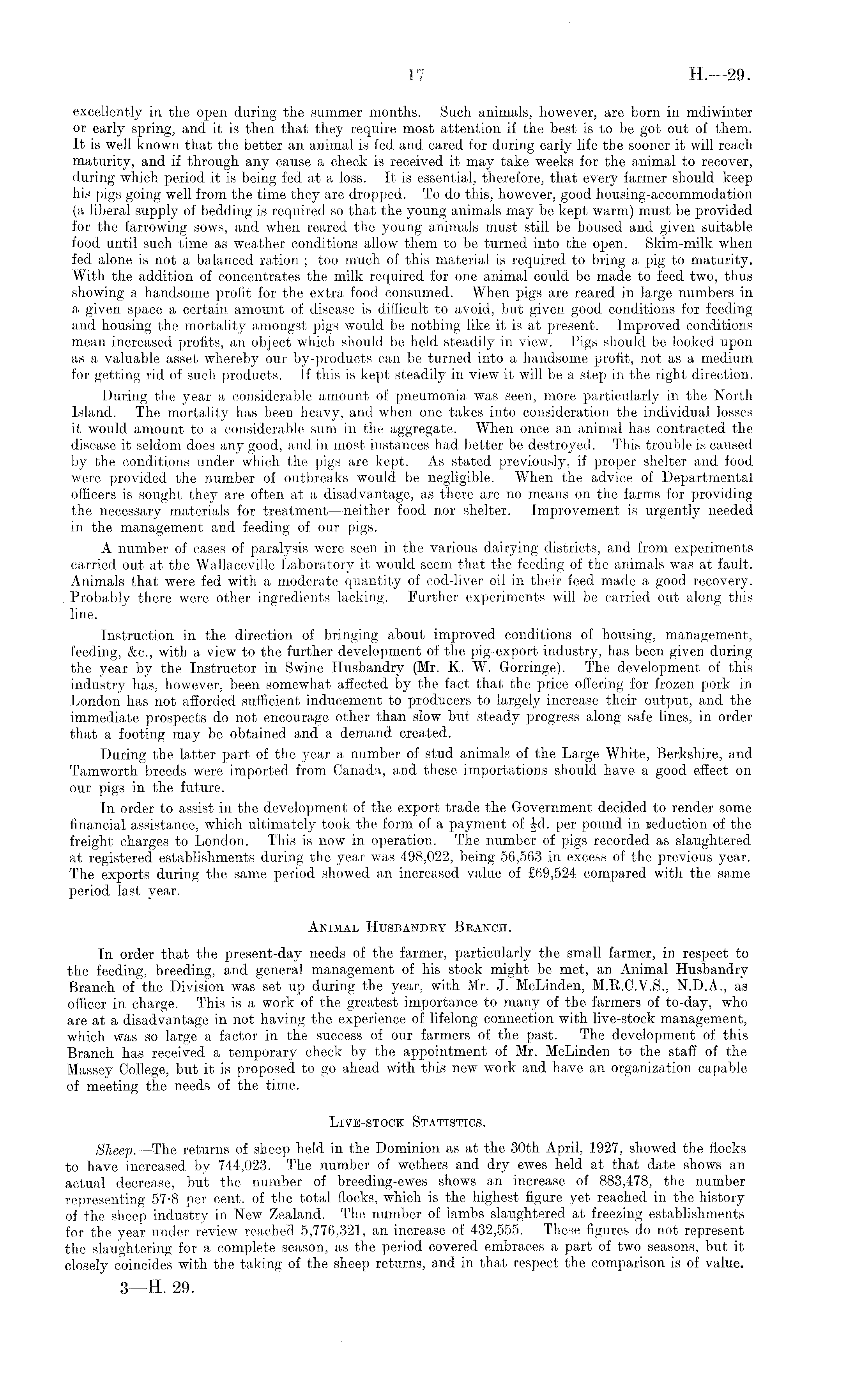 excellently in the open during the summer months. Such animals, however, are born in mdiwinter or early spring, and it is then that they require most attention if the best is to be got out of them. It is well known that the better an animal is fed and oared for during early life the sooner it will reach maturity, and if through any cause a check is received it may take weeks for the animal to recover, during which period it is being fed at a loss. It is essential, therefore, that every farmer should keep his pigs going well from the time they are dropped. To do this, however, good housing-accommodation (a liberal supply of bedding is required so that the young animals may be kept warm) must be provided for the farrowing sows, and when reared the young animals must still be housed and given suitable food until such time as weather conditions allow them to be turned into the open. Skim-milk when fed alone is not a balanced ration ; too much of this material is required to bring a pig to maturity. With the addition of concentrates the milk required for one animal could be made to feed two, thus showing a handsome profit for the extra food consumed. When pigs are reared in large numbers in a given space a certain amount of disease is difficult to avoid, but given good conditions for feeding and housing the mortality amongst pigs would be nothing like it is at present. Improved conditions mean increased profits, an object which should be held steadily in view. Pigs should be looked upon as a valuable asset whereby our by-products can be turned into a handsome profit, not as a medium for getting rid of such products. If this is kept steadily in view it will be a step in the right direction. During the year a considerable amount of pneumonia was seen, more particularly in the North Island. The mortality has been heavy, and when one takes into consideration the individual losses it would amount to a considerable sum in the aggregate. When once an animal has contracted the disease it seldom does any good, and in most instances had better be destroyed. This trouble is caused by the conditions under which the pigs are kept. As stated previously, if proper shelter and food were provided the number of outbreaks would be negligible. When the advice of Departmental officers is sought they are often at a disadvantage, as there are no means on the farms for providing the necessary materials for treatment —neither food nor shelter. Improvement is urgently needed in the management and feeding of our pigs. A number of cases of paralysis were seen in the various dairying districts, and from experiments carried out at the Wallaceville Laboratory it would seem that the feeding of the animals was at fault. Animals that were fed with a moderate quantity of cod-liver oil in their feed made a good recovery. . Probably there were other ingredients lacking. Further experiments will be carried out along this line. Instruction in the direction of bringing about improved conditions of housing, management, feeding, &c., with a view to the further development of the pig-export industry, has been given during the year by the Instructor in Swine Husbandry (Mr. K. W. Gorringe). The development of this industry has, however, been somewhat affected by the fact that the price offering for frozen pork in London has not afforded sufficient inducement to producers to largely increase their output, and the immediate prospects do not encourage other than slow but steady progress along safe lines, in order that a footing may be obtained and a demand created. During the latter part of the year a number of stud animals of the Large White, Berkshire, and Tamworth breeds were imported from Canada, and these importations should have a good effect on our pigs in the future. In order to assist in the development of the export trade the Government decided to render some financial assistance, which ultimately took the form of a payment of Jd. per pound in seduction of the freight charges to London. This is now in operation. The number of pigs recorded as slaughtered at registered establishments during the year was 498,022, being 56,563 in excess of the previous year. The exports during the same period showed an increased value of £69,524 compared with the same period last year. Animal Husbandry Branch. In order that the present-day needs of the farmer, particularly the small farmer, in respect to the feeding, breeding, and general management of his stock might be met, an Animal Husbandry Branch of the Division was set up during the year, with Mr. J. McLinden, M.R.C.V.S., N.D.A., as officer in charge. This is a work of the greatest importance to many of the farmers of to-day, who are at a disadvantage in not having the experience of lifelong connection with live-stock management, which was so large a factor in the success of our farmers of the past. The development of this Branch has received a temporary check by the appointment of Mr. McLinden to the staff of the Massey College, but it is proposed to go ahead with this new work and have an organization capable of meeting the needs of the time. Live-stock Statistics. Sheep. —The returns of sheep held in the Dominion as at the 30th April, 1927, showed the flocks to have increased by 744,023. The number of wethers and dry ewes held at that date shows an actual decrease, but the number of breeding-ewes shows an increase of 883,478, the number representing 57-8 per cent, of the total flocks, which is the highest figure yet reached in the history of the sheep industry in New Zealand. The number of lambs slaughtered at freezing establishments for the year under review reached 5,776,321, an increase of 432,555. These figures do not represent the slaughtering for a complete season, as the period covered embraces a part of two seasons, but it closely coincides with the taking of the sheep returns, and in that respect the comparison is of value.
