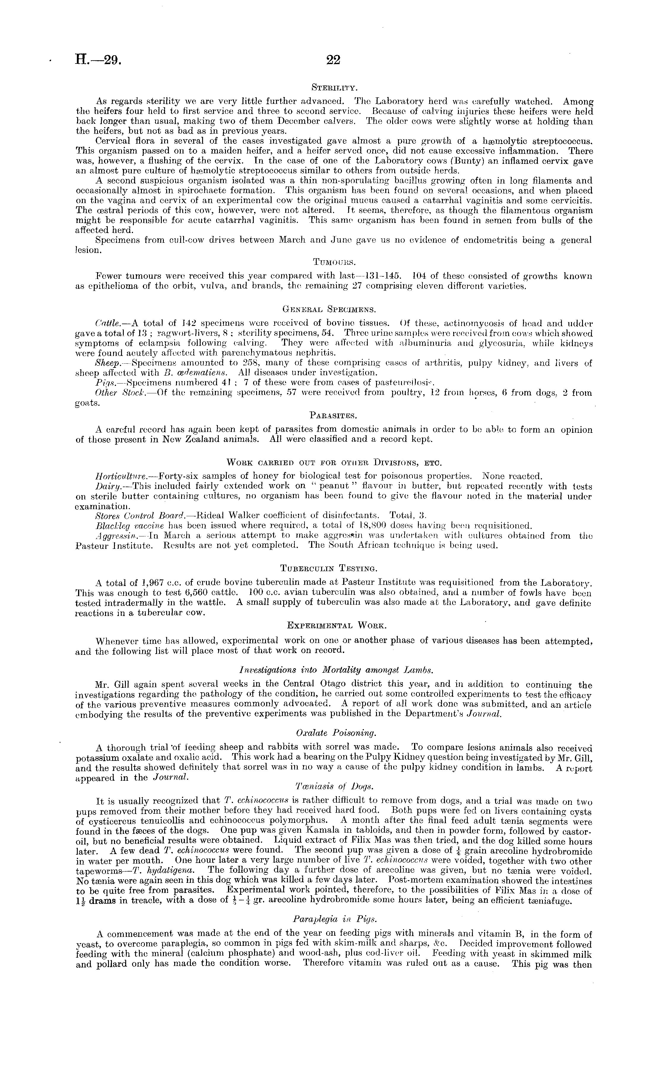 Sterility. As regards sterility we are very little further advanced. The Laboratory herd was carefully watched. Among the heifers four held to first service and three to second service. Because of calving injuries these heifers were held back longer than usual, making two of them December calvers. The older cows were slightly worse at holding than the heifers, but not as bad as in previous years. Cervical flora in several of the cases investigated gave almost a pure growth of a hemolytic streptococcus. This organism passed on to a maiden heifer, and a heifer served once, did not cause excessive inflammation. There was, however, a flushing of the cervix. In the case of one of the Laboratory cows (Bunty) an inflamed cervix gave an almost pure culture of hemolytic streptococcus similar to others from outside herds. A second suspicious organism isolated was a thin non-sporulating bacillus growing often in long filaments and occasionally almost in spirochaete formation. This organism has been found on several occasions, and when placed on the vagina and cervix of an experimental cow the original mucus caused a catarrhal vaginitis and some cervicitis. The cestral periods of this cow, however, were not altered. It seems, therefore, as though the filamentous organism might be responsible for acute catarrhal vaginitis. This same organism has been found in semen from bulls of the affected herd. Specimens from cull-cow drives between March and June gave us no evidence of endometritis being a general lesion. Tumours. Fewer tumours were received this year compared with last—l3l-145. 104 of these consisted of growths known as epithelioma of the orbit, vulva, and brands, the remaining 27 comprising eleven different varieties. General Specimens. Cattle. —A total of 142 specimens were received of bovine tissues. Of these, actinomycosis of head and udder gave a total of 13 ; ragwort-livers, 8 ; sterility specimens, 54. Three urine samples were received from cows which showed symptoms of eclampsia following calving. They were affected with albuminuria and glycosuria, while kidneys were found acutely affected with parenchymatous nephritis. Sheep.—Specimens amounted to 258, many of these comprising cases of arthritis, pulpy kidney, and livers of sheep affected with B. cedematiens. All diseases under investigation. Pi; 7,?. —Specimens numbered 4! ; 7 of these were from cases of pasteurellosi-'. Other Stock. —Of the remaining specimens, 57 were received from poultry, 12 from horses, (i from dogs, 2 from goats. Parasites. A careful record has again been kept of parasites from domestic animals in order to be able to form an opinion of those present in New Zealand animals. All were classified and a record kept. Work carried out for other Divisions, etc. Horticulture. —Forty-six samples of honey for biological test for poisonous properties. None reacted. Dairy.—This included fairly extended work on " peanut " flavour in butter, but repeated recently with tests on sterile butter containing cultures, no organism has been found to give the flavour noted in the material under examination. Stores Control Board. —Rideal Walker coefficient of disinfectants. Total, 3. jßlackleg vaccine has been issued where required, a total of 18,800 doses having been requisitioned. Aggressin.—ln March a serious attempt to make aggressin was undertaken with cultures obtained from the Pasteur Institute. Results are not yet completed. The South African technique is being used. Tuberculin Testing. A total of 1,967 c.c. of crude bovine tuberculin made at Pasteur Institute was requisitioned from the Laboratory. This was enough to test 6,560 cattle. 100 c.c. avian tuberculin was also obtained, and a number of fowls have been tested intradermally in the wattle. A small supply of tuberculin was ako made at the Laboratory, and gave definite reactions in a tubercular cow. Experimental Work. Whenever time has allowed, experimental work on one or another phase of various diseases has been attempted, and the following list will place most of that work on record. Investigations into Mortality amongst Lambs. Mr. Gill again spent several weeks in the Central Otago district this year, and in addition to continuing the investigations regarding the pathology of the condition, he carried out some controlled experiments to test the efficacy of the various preventive measures commonly advocated. A report of all work done was submitted, and an article embodying the results of the preventive experiments was published in the Department's Journal. Oxalate Poisoning. A thorough trial "of feeding sheep and rabbits with sorrel was made. To compare lesions animals also received potassium oxalate and oxalic acid. This work had a bearing on the Pulpy Kidney question being investigated by Mr. Gill, and the results showed definitely that sorrel was in no way a cause of the pulpy kidney condition in lambs. A report appeared in the Journal. Tasniasis of Dogs. It is usually recognized that T. echinococcus is rather difficult to remove from dogs, and a trial was made on two pups removed from their mother before they had received hard food. Both pups were fed on livers containing cysts of cysticercus tenuicollis and echinococcus polymorphus. A month after the final feed adult taenia segments were found in the fseces of the dogs. One pup was given Kamala in tabloids, and then in powder form, followed by castoroil, but no beneficial results were obtained. Liquid extract of Filix Mas was then tried, and the dog killed some hours later. A few dead T. echinococcus were found. The second pup was given a dose of J grain areeoline hydrobromide in water per mouth. One hour later a very large number of live T. echinococcus were voided, together with two other tapeworms —T. hydatigena. The following day a further dose of areeoline was given, but no taenia were voided. No taenia were again seen in this dog which was killed a few days later. Post-mortem examination sh