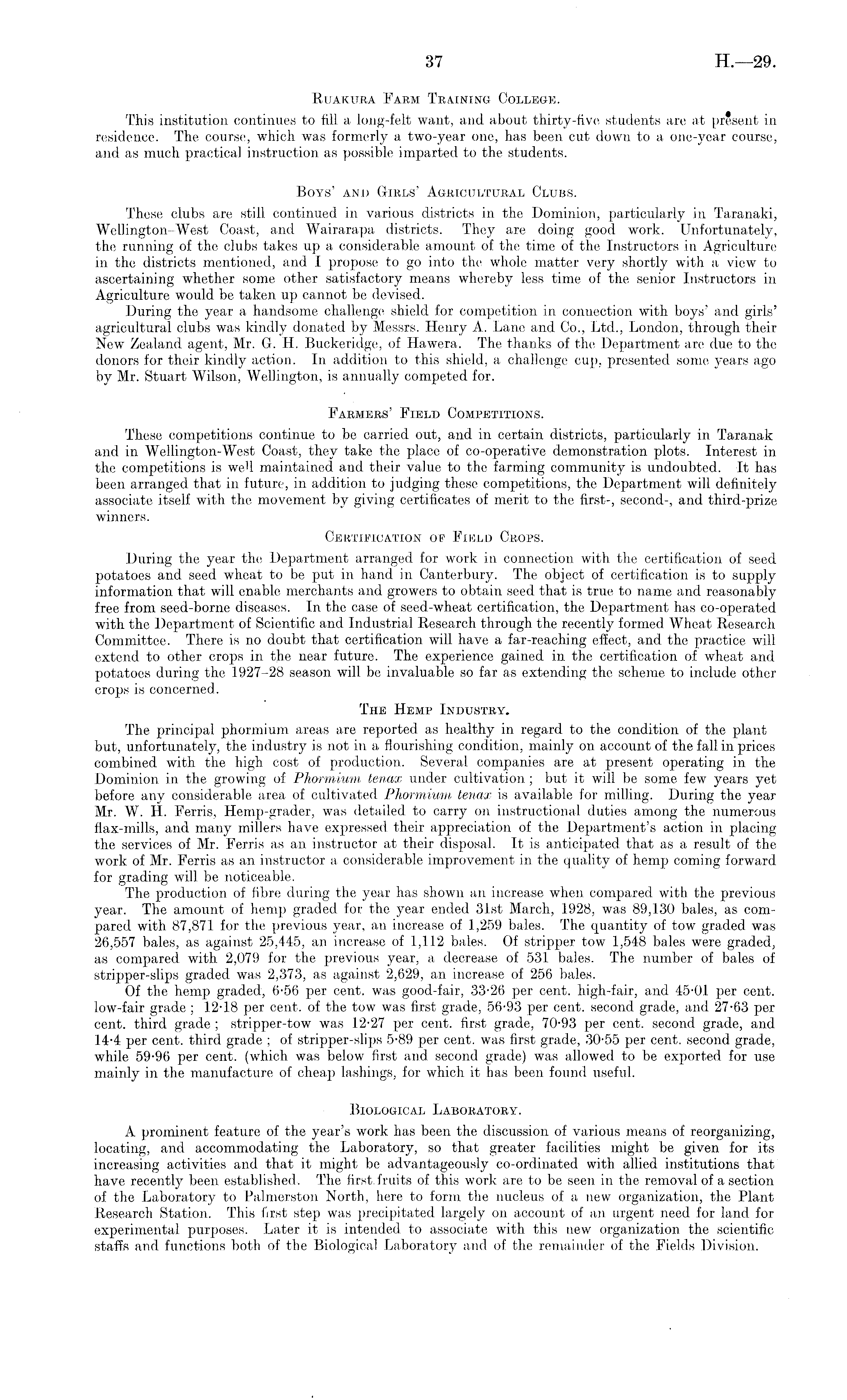 Ruakura Farm Training College. This institution continues to fill a long-felt want, and about thirty-five students are at present in residence. The course, which was formerly a two-year one, has been cut down to a one-year course, and as much practical instruction as possible imparted to the students. Boys' and Girls' Agricultural Clubs. These clubs are still continued in various districts in the Dominion, particularly in Taranaki, Wellington-West Coast, and Wairarapa districts. They are doing good work. Unfortunately, the running of the clubs takes up a considerable amount of the time of the Instructors in Agriculture in the districts mentioned, and I propose to go into the whole matter very shortly with a view to ascertaining whether some other satisfactory means whereby less time of the senior Instructors in Agriculture would be taken up cannot be devised. During the year a handsome challenge shield for competition in connection with boys' and girls' agricultural clubs was kindly donated by Messrs. Henry A. Lane and Co., Ltd., London, through their New Zealand agent, Mr. G. H. Buckeridge, of Hawera. The thanks of the Department are due to the donors for their kindly action. In addition to this shield, a challenge cup, presented some years ago by Mr. Stuart Wilson, Wellington, is annually competed for. Farmers' Field Competitions. These competitions continue to be carried out, and in certain districts, particularly in Taranak and in Wellington-West Coast, they take the place of co-operative demonstration plots. Interest in the competitions is well maintained and their value to the farming community is undoubted. It has been arranged that in future, in addition to judging these competitions, the Department will definitely associate itself with the movement by giving certificates of merit to the first-, second-, and third-prize winners. Certification of Field Crops. During the year the Department arranged for work in connection with the certification of seed potatoes and seed wheat to be- put in hand in Canterbury. The object of certification is to supply information that will enable merchants and growers to obtain seed that is true to name and reasonably free from seed-borne diseases. In the case of seed-wheat certification, the Department has co-operated with the Department of Scientific and Industrial Research through the recently formed Wheat Research Committee. There is no doubt that certification will have a far-reaching effect, and the practice will extend to other crops in the near future. The experience gained in the certification of wheat and potatoes during the 1927-28 season will be invaluable so far as extending the scheme to include other crops is concerned. The Hemp Industry. The principal phormium areas are reported as healthy in regard to the condition of the plant but, unfortunately, the industry is not in a flourishing condition, mainly on account of the fall in prices combined with the high cost of production. Several companies are at present operating in the Dominion in the growing of Phormium tenax under cultivation ; but it will be some few years yet before any considerable area of cultivated Phormium tenax is available for milling. During the year Mr. W. H. Ferris, Hemp-grader, was detailed to carry on instructional duties among the numerous flax-mills, and many millers have expressed their appreciation of the Department's action in placing the services of Mr. Ferris as an instructor at their disposal. It is anticipated that as a result of the work of Mr. Ferris as an instructor a considerable improvement in the quality of hemp coming forward for grading will be noticeable. The production of fibre during the year has shown an increase when compared with the previous year. The amount of hemp graded for the year ended 31st March, 1928., was 89,130 bales, as compared with 87,871 for the previous year, an increase of 1,259 bales. The quantity of tow graded was 26,557 bales, as against 25,445, an increase of 1,112 bales. Of stripper tow 1,548 bales were graded, as compared with 2,079 for the previous year, a decrease of 531 bales. The number of bales of stripper-slips graded was 2,373, as against 2,629, an increase of 256 bales. Of the hemp graded, 6-56 per cent, was good-fair, 33-26 per cent, high-fair, and 45-01 per cent, low-fair grade ; 12-18 per cent, of the tow was first grade, 56-93 per cent, second grade, and 27-63 per cent, third grade ; stripper-tow was 12-27 per cent, first grade, 70-93 per cent, second grade, and 14-4 per cent, third grade ; of stripper-slips 5-89 per cent, was first grade, 30-55 per cent, second grade, while 59-96 per cent, (which was below first and second grade) was allowed to be exported for use mainly in the manufacture of cheap lashings, for which it has been found useful. Biological Laboratory. A prominent feature of the year's work has been the discussion of various means of reorganizing, locating, and accommodating the Laboratory, so that greater facilities might be given for its increasing activities and that it might be advantageously co-ordinated with allied institutions that have recently been established. The first.fruits of this work' are to be seen in the removal of a section of the Laboratory to Palmerston North, here to form the nucleus of a new organization, the Plant Research. Station. This first step was precipitated largely on account of an urgent need for land for experimental purposes. Later it is intended to associate with this uew organization the scientific staffs and functions both of the Biological Laboratory and of the remainder of the Fields Division.