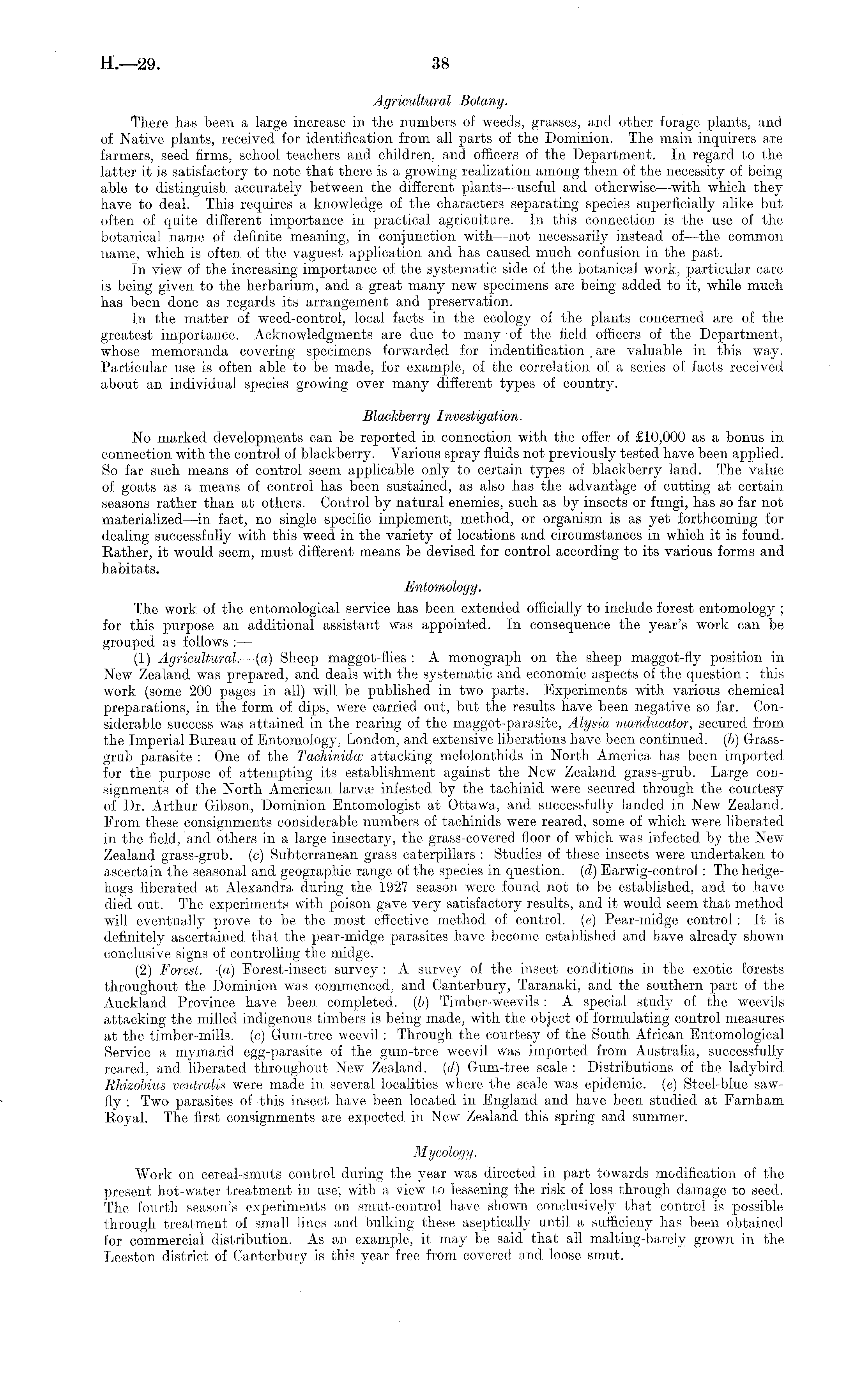 Agricultural Botany. There has been a large increase in the numbers of weeds, grasses, ancl other forage plants, and of Native plants, received for identification from all parts of the Dominion. The main inquirers are farmers, seed firms, school teachers and children, and officers of the Department. In regard to the latter it is satisfactory to note that there is a growing realization among them of the necessity of being able to distinguish accurately between the different plants—useful and otherwise —with which they have to deal. This requires a knowledge of the characters separating species superficially alike but often of quite different importance in practical agriculture. In this connection is the use of the botanical name of definite meaning, in conjunction with —not necessarily instead of —the common name, which is often of the vaguest application and has caused much confusion in the past. In view of the increasing importance of the systematic side of the botanical work, particular care is being given to the herbarium, and a great many new specimens are being added to it, while much has been done as regards its arrangement and preservation. In the matter of weed-control, local facts in the ecology of the plants concerned are of the greatest importance. Acknowledgments are due to many of the field officers of the Department, whose memoranda covering specimens forwarded for indentification , are valuable in this way. Particular use is often able to be made, for example, of the correlation of a series of facts received about an individual species growing over many different types of country. Blackberry Investigation. No marked developments can be reported in connection with the offer of £10,000 as a bonus in connection with the control of blackberry. Various spray fluids not previously tested have been applied. So far such means of control seem applicable only to certain types of blackberry land. The value of goats as a means of control has been sustained, as also has the advantage of cutting at certain seasons rather than at others. Control by natural enemies, such as by insects or fungi, has so far not materialized—in fact, no single specific implement, method, or organism is as yet forthcoming for dealing successfully with this weed in the variety of locations and circumstances in which it is found. Rather, it would seem, must different means be devised for control according to its various forms and habitats. Entomology. The work of the entomological service has been extended officially to include forest entomology ; for this purpose an additional assistant was appointed. In consequence the year's work can be grouped as follows : — (1) Agricultural. —(a) Sheep maggot-flies : A monograph on the sheep maggot-fly position in New Zealand was prepared, and deals with the systematic and economic aspects of the question : this work (some 200 pages in all) will be published in two parts. Experiments with various chemical preparations, in the form of dips, were carried out, but the results have been negative so far. Considerable success was attained in the rearing of the maggot-parasite, Alysia manducator, secured from the Imperial Bureau of Entomology, London, and extensive liberations have been continued. (b) Grassgrub parasite : One of the Tachinidce attacking melolonthids in North America has been imported for the purpose of attempting its establishment against the New Zealand grass-grub. Large consignments of the North American larva; infested by the tachinid were secured through the courtesy of Dr. Arthur Gibson, Dominion Entomologist at Ottawa, and successfully landed in New Zealand. Erom these consignments considerable numbers of tachinids were reared, some of which were liberated in the field, and others in a large insectary, the grass-covered floor of which was infected by the New Zealand grass-grub, (c) Subterranean grass caterpillars : Studies of these insects were undertaken to ascertain the seasonal and geographic range of the species in question, (d) Earwig-control: The hedgehogs liberated at Alexandra during the 1927 season were found not to be established, and to have died out. The experiments with poison gave very satisfactory results, and it would seem that method will eventually prove to be the most effective method of control, (e) Pear-midge control : It is definitely ascertained that the pear-midge parasites have become established and have already shown conclusive signs of controlling the midge. (2) Forest. —(a) Eorest-insect survey : A survey of the insect conditions in the exotic forests throughout the Dominion was commenced, and Canterbury, Taranaki, and the southern part of the Auckland Province have been completed. (b) Timber-weevils : A special study of the weevils attacking the milled indigenous timbers is being made, with the object of formulating control measures at the timber-mills, (c) Gum-tree weevil: Through the courtesy of the South African Entomological Service a mymarid egg-parasite of the gum-tree weevil was imported from Australia, successfully reared, and liberated throughout New Zealand, (d) Gum-tree scale : Distributions of the ladybird Rhizobius ventralis were made in several localities where the scale was epidemic, (e) Steel-blue sawfly : Two parasites of this insect have been located in England and have been studied at Farnham Royal. The first consignments are expected in New Zealand this spring and summer. Mycology. Work on cereal-smuts control during the year was directed in part towards modification of the present hot-water treatment in use; with a view to lessening the risk of loss through damage to seed. The fourth season's experiments on smut-control have shown conclusively that control is possible through treatment of small lines and bulking these aseptically until a sufficieny has been obtained for commercial distribution. As an example, it may be said that all malting-barely grown in the Leeston district of Canterbury