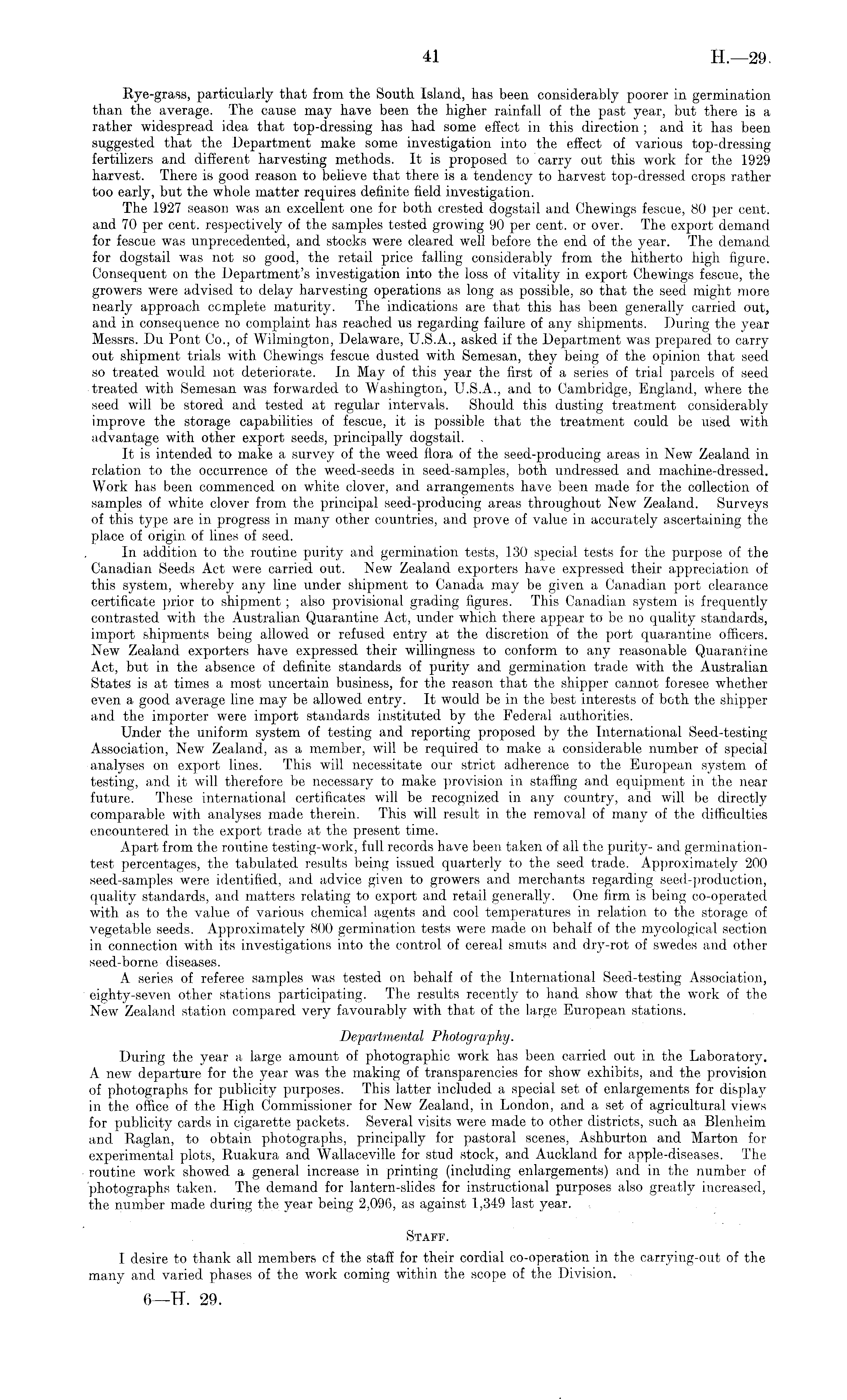 Rye-grass, particularly that from the South Island, has been considerably poorer in germination than the average. The cause may have been the higher rainfall of the past year, but there is a rather widespread idea that top-dressing has had some effect in this direction ; and it has been suggested that the Department make some investigation into the effect of various top-dressing fertilizers and different harvesting methods. It is proposed to carry out this work for the 1929 harvest. There is good reason to believe that there is a tendency to harvest top-dressed crops rather too early, but the whole matter requires definite field investigation. The 1927 season was an excellent one for both crested dogstail and Chewings fescue, 80 per cent, and 70 per cent, respectively of the samples tested growing 90 per cent, or over. The export demand for fescue was unprecedented, and stocks were cleared well before the end of the year. The demand for dogstail was not so good, the retail price falling considerably from the hitherto high figure. Consequent on the Department's investigation into the loss of vitality in export Chewings fescue, the growers were advised to delay harvesting operations as long as possible, so that the seed might more nearly approach complete maturity. The indications are that this has been generally carried out, and in consequence no complaint has reached us regarding failure of any shipments. During the year Messrs. Du Pont Co., of Wilmington, Delaware, U.S.A., asked if the Department was prepared to carry out shipment trials with Chewings fescue dusted with Semesan, they being of the opinion that seed so treated would not deteriorate. In May of this year the first of a series of trial parcels of seed treated with Semesan was forwarded to Washington, U.S.A., and to Cambridge, England, where the seed will be stored and tested at regular intervals. Should this dusting treatment considerably improve the storage capabilities of fescue, it is possible that the treatment could be used with advantage with other export seeds, principally dogstail. . It is intended to make a survey of the weed flora of the seed-producing areas in New Zealand in relation to the occurrence of the weed-seeds in seed-samples, both undressed and machine-dressed. Work has been commenced on white clover, and arrangements have been made for the collection of samples of white clover from the principal seed-producing areas throughout New Zealand. Surveys of this type are in progress in many other countries, and prove of value in accurately ascertaining the place of origin of lines of seed. In addition to the routine purity and germination tests, 130 special tests for the purpose of the Canadian Seeds Act were carried out. New Zealand exporters have expressed their appreciation of this system, whereby any line under shipment to Canada may be given a Canadian port clearance certificate prior to shipment ; also provisional grading figures. This Canadian system is frequently contrasted with the Australian Quarantine Act, under which there appear to be no quality standards, import shipments being allowed or refused entry at the discretion of the port quarantine officers. New Zealand exporters have expressed their willingness to conform to any reasonable Quarantine Act, but in the absence of definite standards of purity and germination trade with the Australian States is at times a most uncertain business, for the reason that the shipper cannot foresee whether even a good average line may be allowed entry. It would be in the best interests of both the shipper and the importer were import standards instituted by the Federal authorities. Under the uniform system of testing and reporting proposed by the International Seed-testing Association, New Zealand, as a member, will be required to make a considerable number of special analyses on export lines. This will necessitate our strict adherence to the European system of testing, and it will therefore be necessary to make provision in staffing and equipment in the near future. These international certificates will be recognized in any country, and will be directly comparable with analyses made therein. This will result in the removal of many of the difficulties encountered in the export trade at the present time. Apart from the routine testing-work, full records have been taken of all the purity- and germinationtest percentages, the tabulated results being issued quarterly to the seed trade. Approximately 200 seed-samples were identified, and advice given to growers and merchants regarding seed-production, quality standards, and matters relating to export and retail generally. One firm is being co-operated with as to the value of various chemical agents and cool temperatures in relation to the storage of vegetable seeds. Approximately 800 germination tests were made on behalf of the mycological section in connection with its investigations into the control of cereal smuts and dry-rot of swedes and other seed-borne diseases. A series of referee samples was tested on behalf of the International Seed-testing Association, eighty-seven other stations participating. The results recently to hand show that the work of the New Zealand station compared very favourably with that of the large European stations. Departmental Photography. During the year a large amount of photographic work has been carried out in the Laboratory. A new departure for the year was the making of transparencies for show exhibits, and the provision of photographs for publicity purposes. This latter included a special set of enlargements for display in the office of the High Commissioner for New Zealand, in London, and a set of agricultural views for publicity cards in cigarette packets. Several visits were made to other districts, such aa Blenheim and Raglan, to obtain photographs, principally for pastoral scenes, Ashburton and Marton for experimental plots, Ruakura and Wallaceville for stud stock, and Auckl