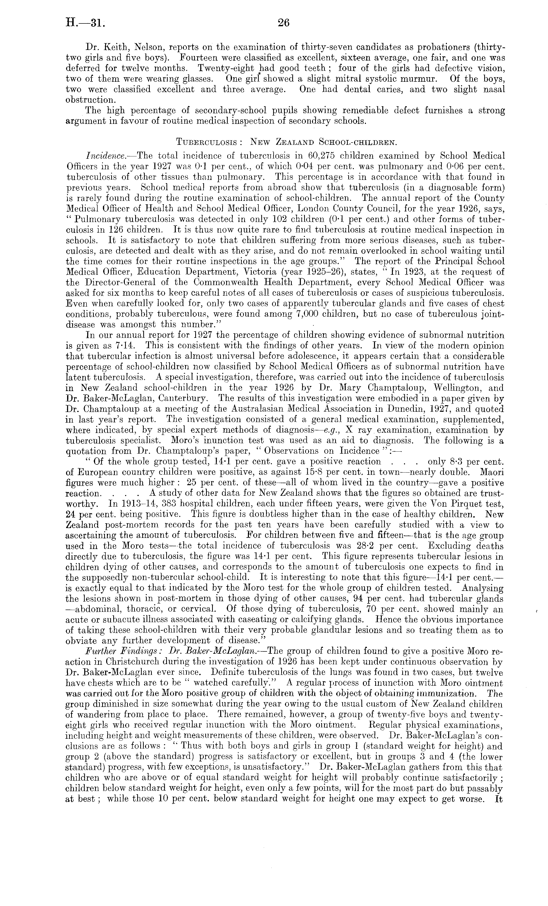 Dr. Keith, Nelson, reports on the examination of thirty-seven candidates as probationers (thirtytwo girls and five boys). Fourteen were classified as excellent, sixteen average, one fair, and one was deferred for twelve months. Twenty-eight had good teeth ; four of the girls had defective vision, two of them were wearing glasses. One girf showed a slight mitral systolic murmur. Of the boys, two were classified excellent and three average. One had dental caries, and two slight nasal obstruction. The high percentage of secondary-school pupils showing remediable defect furnishes a strong argument in favour of routine medical inspection of secondary schools. Tuberculosis : New Zealand School-children. Incidence. —The total incidence of tuberculosis in 60,275 children examined by School Medical Officers in the year 1927 was OT per cent., of which 0-04 per cent, was pulmonary and 0-06 per cent, tuberculosis of other tissues than pulmonary. This percentage is in accordance with that found in previous years. School medical reports from abroad show that tuberculosis (in a diagnosable form) is rarely found during the routine examination of school-children. The annual report of the County Medical Officer of Health and School Medical Officer, London County Council, for the year 1926, says, " Pulmonary tuberculosis was detected in only 102 children (0-1 per cent.) and other forms of tuberculosis in 126 children. It is thus now quite rare to find tuberculosis at routine medical inspection in schools. It is satisfactory to note that children suffering from more serious diseases, such as tuberculosis, are detected and dealt with as they arise, and do not remain overlooked in school waiting until the time comes for their routine inspections in the age groups." The report of the Principal School Medical Officer, Education Department, Victoria (year 1925-26), states, " In 1923, at the request of the Director-General of the Commonwealth Health Department, every School Medical Officer was asked for six months to keep careful notes of all cases of tuberculosis or cases of suspicious tuberculosis. Even when carefully looked for, only two cases of apparently tubercular glands and five cases of chest conditions, probably tuberculous, were found among 7,000 children, but no case of tuberculous jointdisease was amongst this number." In our annual report for 1927 the percentage of children showing evidence of subnormal nutrition is given as 7-14. This is consistent with the findings of other years. In view of the modern opinion that tubercular infection is almost universal before adolescence, it appears certain that a considerable percentage of school-children now classified by School Medical Officers as of subnormal nutrition have latent tuberculosis. A special investigation, therefore, was carried out into the incidence of tuberculosis in New Zealand school-children in the year 1926 by Dr. Mary Champtaloup, Wellington, and Dr. Baker-McLaglan, Canterbury. The results of this investigation were embodied in a paper given by Dr. Champtaloup at a meeting of the Australasian Medical Association in Dunedin, 1927, and quoted in last year's report. The investigation consisted of a general medical examination, supplemented, where indicated, by special expert methods of diagnosis—e.g., X ray examination, examination by tuberculosis specialist. Moro's inunction test was used as an aid to diagnosis. The following is a quotation from Dr. Champtaloup's paper, " Observations on Incidence ": — "Of the whole group tested, 14-1 per cent, gave a positive reaction . . . only 8-3 per cent, of European country children were positive, as against 15-8 per cent, in town —nearly double. Maori figures were much higher : 25 per cent, of these —all of whom lived in the country —gave a positive reaction. ... A study of other data for New Zealand shows that the figures so obtained are trustworthy. In 1913-14, 383 hospital children, each under fifteen years, were given the Yon Pirquet test, 24 per cent, being positive. This figure is doubtless higher than in the case of healthy children. New Zealand post-mortem records for the past ten years have been carefully studied with a view to ascertaining the amount of tuberculosis. For children between five and fifteen—that is the age group used in the Moro tests—the total incidence of tuberculosis was 28-2 per cent. Excluding deaths directly due to tuberculosis, the figure was 14-1 per cent. This figure represents tubercular lesions in children dying of other causes, and corresponds to the amount of tuberculosis one expects to find in the supposedly non-tubercular school-child. It is interesting to note that this figure—l 4-1 per cent. — is exactly equal to that indicated by the Moro test for the whole group of children tested. Analysing the lesions shown in post-mortem in those dying of other causes, 94 per cent, had tubercular glands —abdominal, thoracic, or cervical. Of those dying of tuberculosis, 70 per cent, showed mainly an acute or subacute illness associated with caseating or calcifying glands. Hence the obvious importance of taking these school-children with their very probable glandular lesions and so treating them as to obviate any further development of disease." Further Findings: Dr. Baker-McLaglan.—The group of children found to give a positive Moro reaction in Christchurch during the investigation of 1926 has been kept under continuous observation by Dr. Baker-McLaglan ever since. Definite tuberculosis of the lungs was found in two cases, but twelve have chests which are to be " watched carefully." A regular process of inunction with Moro ointment was carried out for the Moro positive group of children with the object of obtaining immunization. The group diminished in size somewhat during the year owing to the usual custom of New Zealand children of wandering from place to place. There remained, however, a group of twenty-five boys and twenty - eight girls who re