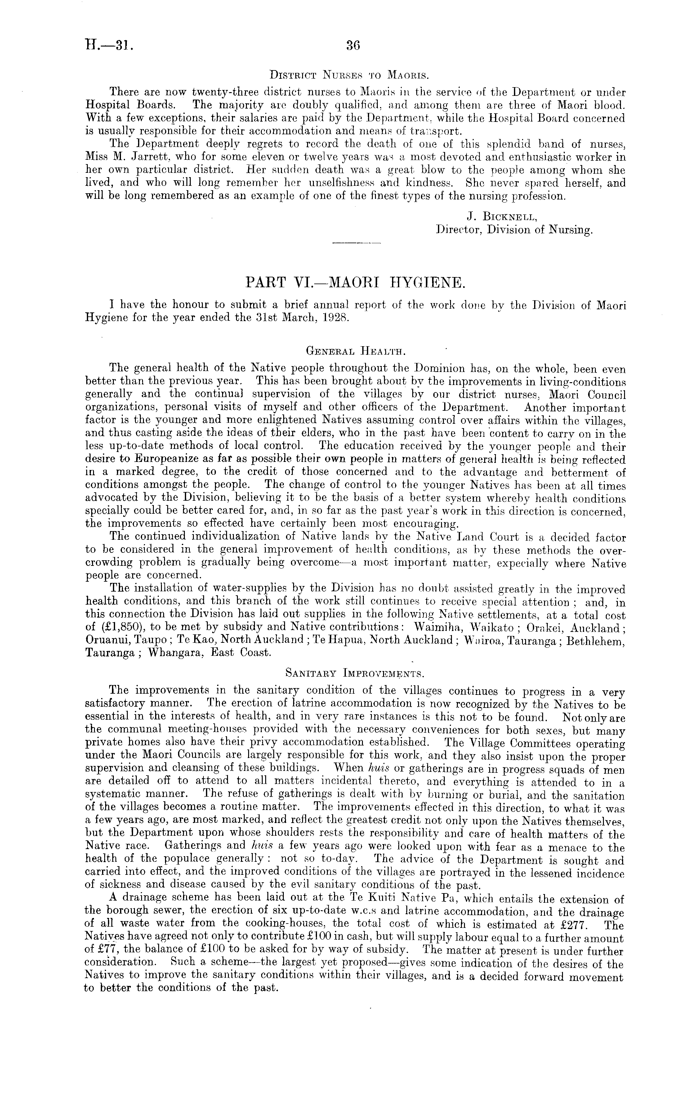 District Nurses to Maoris. There are now twenty-three district nurses to Maoris in the service of the Department or under Hospital Boards. The majority are doubly qualified, and among them are three of Maori blood. With a few exceptions, their salaries are paid by the Department, while the Hospital Board concerned is usually responsible for their accommodation and means of transport. The Department deeply regrets to record the death of one of this splendid band of nurses, Miss M. Jarrett, who for some eleven or twelve years was a most devoted and enthusiastic worker in her own particular district. Her sudden death was a great blow to the people among whom she lived, and who will long remember her unselfishness and kindness. She never spared herself, and will be long remembered as an example of one of the finest types of the nursing profession. J. Bicknell, Director, Division of Nursing. PART VI.—MAORI HYGIENE. I have the honour to submit a brief annual report of the work done by the Division of Maori Hygiene for the year ended the 31st March, 1928. General Health. The general health of the Native people throughout the Dominion has, on the whole, been even better than the previous year. This has been brought about by the improvements in living-conditions generally and the continual supervision of the villages by our district nurses, Maori Council organizations, personal visits of myself and other officers of the Department. Another important factor is the younger and more enlightened Natives assuming control over affairs within the villages, and thus casting aside the ideas of their elders, who in the past have been content to carry on in the less up-to-date methods of local control. The education received by the younger people and their desire to Europeanize as far as possible their own people in matters of general health is being reflected in a marked degree, to the credit of those concerned and to the advantage and betterment of conditions amongst the people. The change of control to the younger Natives has been at all times advocated by the Division, believing it to be the basis of a better system whereby health conditions specially could be better cared for, and, in so far as the past year's work in this direction is concerned, the improvements so effected have certainly been most encouraging. The continued individualization of Native lands by the Native Land Court is a decided factor to be considered in the general improvement of health conditions, as by these methods the overcrowding problem is gradually being overcome—a most important matter, expecially where Native people are concerned. The installation of water-supplies by the Division has no doubt assisted greatly in the improved health conditions, and this branch of the work still continues to receive special attention ; and, in this connection the Division has laid out supplies in the following Native settlements, at a total cost of (£1,850), to be met by subsidy and Native contributions: Waimiha, Waikato ; Orakei, Auckland; Oruanui, Taupo ; Te Kao, North Auckland ; Te Hapua, North Auckland ; Wairoa, Tauranga ; Bethlehem, Tauranga ; Whangara, East Coast. Sanitary Improvements. The improvements in the sanitary condition of the villages continues to progress in a very satisfactory manner. The erection of latrine accommodation is now recognized by the Natives to be essential in the interests of health, and in very rare instances is this not to be found. Not only are the communal meeting-houses provided with the necessary conveniences for both sexes, but many private homes also have their privy accommodation established. The Village Committees operating under the Maori Councils are largely responsible for this work, and they also insist upon the proper supervision and cleansing of these buildings. When huis or gatherings are in progress squads of men are detailed off to attend to all matters incidental thereto, and everything is attended to in a systematic manner. The refuse of gatherings is dealt with by burning or burial, and the sanitation of the villages becomes a routine, matter. The improvements effected in this direction, to what it was a few years ago, are most marked, and reflect the greatest credit not only upon the Natives themselves, but the Department upon whose shoulders rests the responsibility and" care of health matters of the Native race. Gatherings and huis a few years ago were looked upon with fear as a menace to the health of the populace generally : not so to-day. The advice of the Department is sought and carried into effect, and the improved conditions of the villages are portrayed in the lessened incidence of sickness and disease caused by the evil sanitary conditions of the past. A drainage scheme has been laid out at the Te Kuiti Native Pa, which entails the extension of the borough sewer, the erection of six up-to-date w.c.s and latrine accommodation, and the drainage of all waste water from the cooking-houses, the total cost of which is estimated at £277. The Natives have agreed not only to contribute £100 in cash, but will supply labour equal to a further amount of £77, the balance of £100 to be asked for by way of subsidy. The matter at present is under further consideration. Such a scheme—the largest yet proposed—gives some indication of the desires of the Natives to improve the sanitary conditions within their villages, and is a decided forward movement to better the conditions of the past.