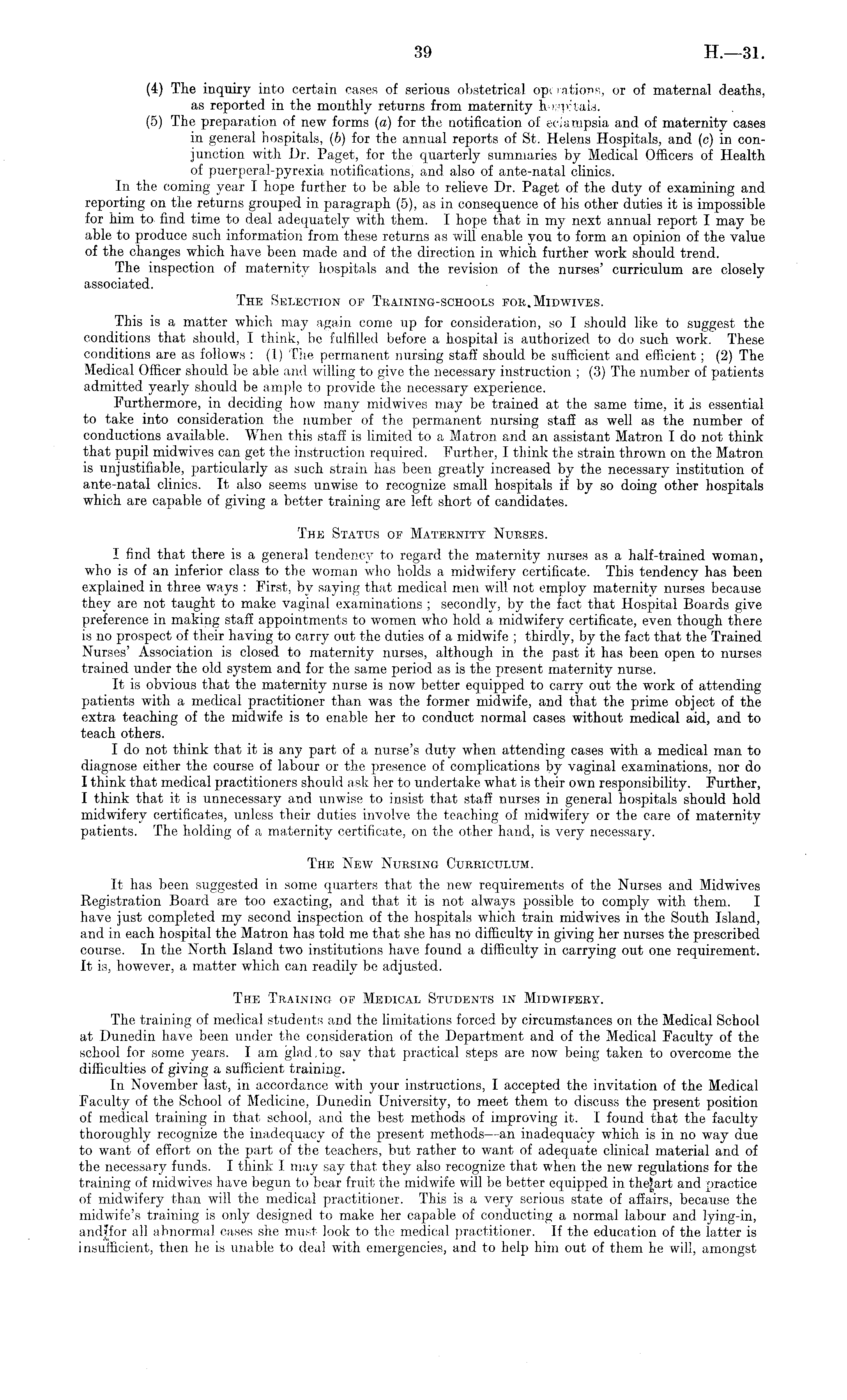 (4) The inquiry into certain cases of serious obstetrical operations, or of maternal deaths, as reported in the monthly returns from maternity hospitals. (5) The preparation of new forms (a) for the notification of eclampsia and of maternity cases in general hospitals, (b) for the annual reports of St. Helens Hospitals, and (c) in conjunction with Dr. Paget, for the quarterly summaries by Medical Officers of Health of puerperal-pyrexia notifications, and also of ante-natal clinics. In the coming year I hope further to be able to relieve Dr. Paget of the duty of examining and reporting on the returns grouped in paragraph (5), as in consequence of his other duties it is impossible for him to find time to deal adequately with them. I hope that in my next annual report I may be able to produce such information from these returns as will enable you to form an opinion of the value of the changes which have been made and of the direction in which further work should trend. The inspection of maternity hospitals and the revision of the nurses' curriculum are closely associated. The Selection op Training-schools for. Midwives. This is a matter which may again come up for consideration, so I should like to suggest the conditions that should, I think, be fulfilled before a hospital is authorized to do such work. These conditions are as follows : (1) The permanent nursing staff should be sufficient and efficient; (2) The Medical Officer should be able and willing to give the necessary instruction ; (3) The number of patients admitted yearly should be ample to provide the necessary experience. Furthermore, in deciding how many midwives may be trained at the same time, it is essential to take into consideration the number of the permanent nursing staff as well as the number of conductions available. When this staff is limited to a Matron and an assistant Matron Ido not think that pupil midwives can get the instruction required. Further, I think the strain thrown on the Matron is unjustifiable, particularly as such strain has been greatly increased by the necessary institution of ante-natal clinics. It also seems unwise to recognize small hospitals if by so doing other hospitals which are capable of giving a better training are left short of candidates. The Status of Maternity Nurses. I find that there is a general tendency to regard the maternity nurses as a half-trained woman, who is of an inferior class to the Woman who holds a midwifery certificate. This tendency has been explained in three ways : First, by saying that medical men will not employ maternity nurses because they are not taught to make vaginal examinations ; secondly, by the fact that Hospital Boards give preference in making staff appointments to women who hold a midwifery certificate, even though there is no prospect of their having to carry out the duties of a midwife ; thirdly, by the fact that the Trained Nurses' Association is closed to maternity nurses, although in the past it has been open to nurses trained under the old system and for the same period as is the present maternity nurse. It is obvious that the maternity nurse is now better equipped to carry out the work of attending patients with a medical practitioner than was the former midwife, and that the prime object of the extra teaching of the midwife is to enable her to conduct normal cases without medical aid, and to teach others. I do not think that it is any part of a nurse's duty when attending cases with a medical man to diagnose either the course of labour or the presence of complications by vaginal examinations, nor do I think that medical practitioners should ask her to undertake what is their own responsibility. Further, I think that it is unnecessary and unwise to insist that staff nurses in general hospitals should hold midwifery certificates, unless their duties involve the teaching of midwifery or the care of maternity patients. The holding of a maternity certificate, on the other hand, is very necessary. The New Nursing Curriculum. It has been suggested in some quarters that the new requirements of the Nurses and Midwives Registration Board are too exacting, and that it is not always possible to comply with them. I have just completed my second inspection of the hospitals which train midwives in the South Island, and in each hospital the Matron has told me that she has no difficulty in giving her nurses the prescribed course. In the North Island two institutions have found a difficulty in carrying out one requirement. It is, however, a matter which can readily be adjusted. The Training of Medical Students in Midwifery. The training of medical students and the limitations forced by circumstances on the Medical School at Dunedin have been under the consideration of the Department and of the Medical Faculty of the school for some years. lam glad,to say that practical steps are now being taken to overcome the difficulties of giving a sufficient training. In November last, in accordance with your instructions, I accepted the invitation of the Medical Faculty of the School of Medicine, Dunedin University, to meet them to discuss the present position of medical training in that school, and the best methods of improving it. I found that the faculty thoroughly recognize the inadequacy of the present methods —an inadequacy which is in no way due to want of effort on the part of the teachers, but rather to want of adequate clinical material and of the necessary funds. I think I may say that they also recognize that when the new regulations for the training of midwives have begun to bear fruit the midwife will be better equipped in the|art and practice of midwifery than will the medical practitioner. This is a very serious state of affairs, because the midwife's training is only designed to make her capable of conducting a normal labour and lying-in, andffor all abnormal cases she must look to the medical practitioner. If the education of the latter is insufficient, t