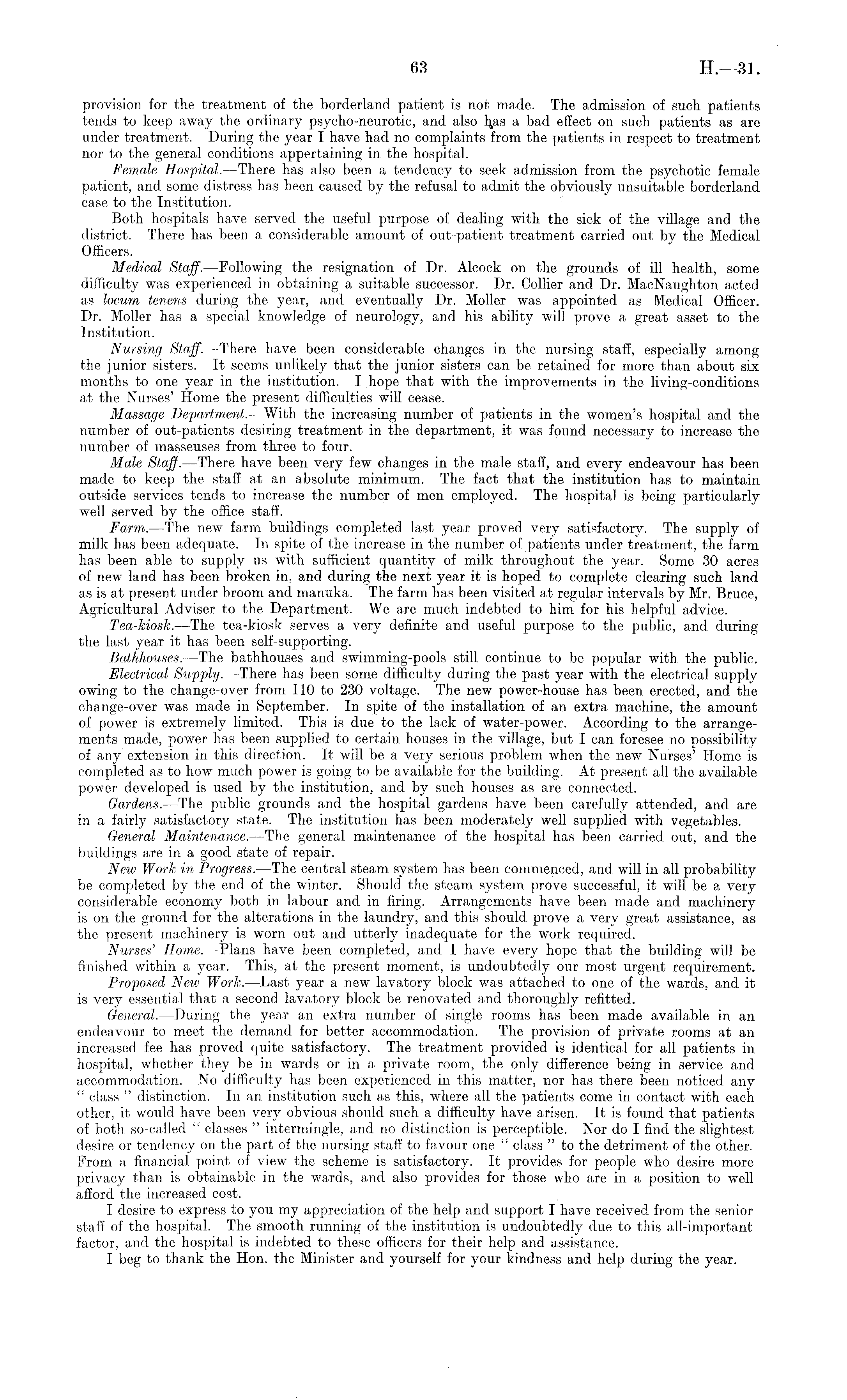 provision for the treatment of the borderland patient is not made. The admission of such patients tends to keep away the ordinary psycho-neurotic, and also a bad effect on such patients as are under treatment. During the year I have had no complaints from the patients in respect to treatment nor to the general conditions appertaining in the hospital. Female Hospital.—There has also been a tendency to seek admission from the psychotic female patient, and some distress has been caused by the refusal to admit the obviously unsuitable borderland case to the Institution. Both hospitals have served the useful purpose of dealing with the sick of the village and the district. There has been a considerable amount of out-patient treatment carried out by the Medical Officers. Medical Staff. —Following the resignation of Dr. Alcock on the grounds of ill health, some difficulty was experienced in obtaining a suitable successor. Dr. Collier and Dr. MacNaughton acted as locum, tenens during the year, and eventually Dr. Moller was appointed as Medical Officer. Dr. Moller has a special knowledge of neurology, and his ability will prove a great asset to the Institution. Nursing Staff. —There have been considerable changes in the nursing staff, especially among the junior sisters. It seems unlikely that the junior sisters can be retained for more than about six months to one year in the institution. I hope that with the improvements in the living-conditions at the Nurses' Home the present difficulties will cease. Massage Department.—With the increasing number of patients in the women's hospital and the number of out-patients desiring treatment in the department, it was found necessary to increase the number of masseuses from three to four. Male Staff. —There have been very few changes in the male staff, and every endeavour has been made to keep the staff at an absolute minimum. The fact that the institution has to maintain outside services tends to increase the number of men employed. The hospital is being particularly well served by the office staff. Farm. —The new farm buildings completed last year proved very satisfactory. The supply of milk has been adequate. In spite of the increase in the number of patients under treatment, the farm has been able to supply us with sufficient quantity of milk throughout the year. Some 30 acres of new land has been broken in, and during the next year it is hoped to complete clearing such land as is at present under broom and manuka. The farm has been visited at regular intervals by Mr. Bruce, Agricultural Adviser to the Department. We are much indebted to him for his helpful advice. Tea-kiosk.—The tea-kiosk serves a very definite and useful purpose to the public, and during the last year it has been self-supporting. Bathhouses. —The bathhouses and swimming-pools still continue to be popular with the public. Electrical Supply. —There has been some difficulty during the past year with the electrical supply owing to the change-over from 110 to 230 voltage. The new power-house has been erected, and the change-over was made in September. In spite of the installation of an extra machine, the amount of power is extremely limited. This is due to the lack of water-power. According to the arrangements made, power has been supplied to certain houses in the village, but I can foresee no possibility of any extension in this direction. It will be a very serious problem when the new Nurses' Home is completed as to how much power is going to be available for the building. At present all the available power developed is used by the institution, and by such houses as are connected. Gardens.—The public grounds and the hospital gardens have been carefully attended, and are in a fairly satisfactory state. The institution has been moderately well supplied with vegetables. General Maintenance. —The general maintenance of the hospital has been carried out, and the buildings are in a good state of repair. New Work in Progress.—The central steam system has been commenced, and will in all probability be completed by the end of the winter. Should the steam system prove successful, it will be a very considerable economy both in labour and in firing. Arrangements have been made and machinery is on the ground for the alterations in the laundry, and this should prove a very great assistance, as the present machinery is worn out and utterly inadequate for the work required. Nurses' Home. —Plans have been completed, and I have every hope that the building will be finished within a year. This, at the present moment, is undoubtedly our most urgent requirement. Proposed New Work. —Last year a new lavatory block was attached to one of the wards, and it is verj r essential that a second lavatory block be renovated and thoroughly refitted. General. —During the year an extra number of single rooms has been made available in an endeavour to meet the demand for better accommodation. The provision of private rooms at an increased fee has proved quite satisfactory. The treatment provided is identical for all patients in hospital, whether they be in wards or in a private room, the only difference being in service and accommodation. No difficulty has been experienced in this matter, nor has there been noticed any " class " distinction. In an institution such as this, where all the patients come in contact with each other, it would have been very obvious should such a difficulty have arisen. It is found that patients of both so-called " classes " intermingle, and no distinction is perceptible. Nor do I find the slightest desire or tendency on the part of the nursing staff to fa vour one " class " to the detriment of the other. From a financial point of view the scheme is satisfactory. It provides for people who desire more privacy thah is obtainable in the wards, and also provides for those who are in a position to well afford the increased cost. I desire to express to you my appreciati