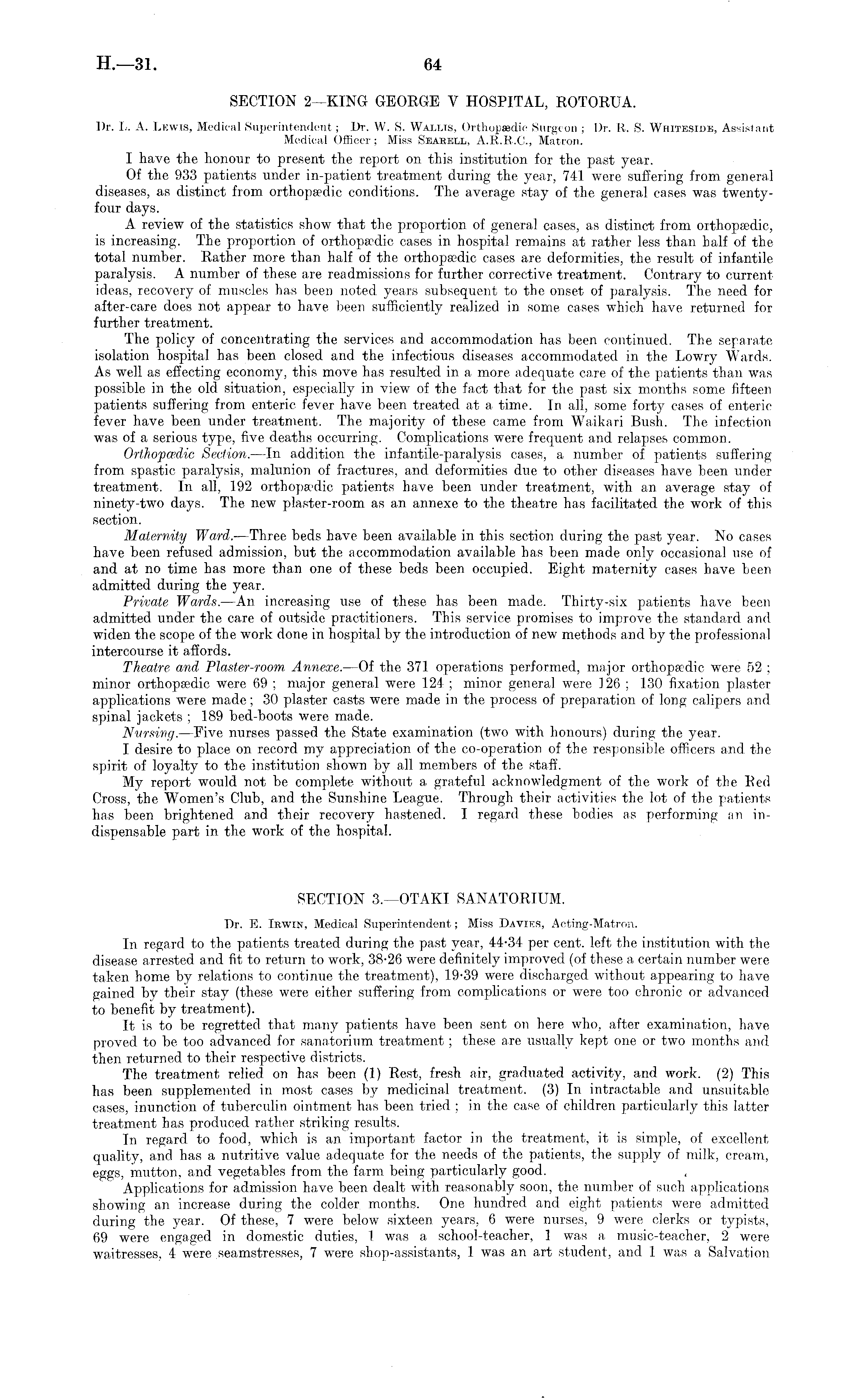 SECTION 2—KING GEORGE V HOSPITAL, ROTORUA. Dr. L. A. Lewis, Medical Superintendent; Dr. W. S. Wallis, Orthopaedic Surgeon ; Dr. R. S. Whiteside, Assistant Medical Officer; Miss Seakell, A.R.R.C., Matron. I have the honour to present the report on this institution for the past year. Of the 933 patients under in-patient treatment during the year, 741 were suffering from general diseases, as distinct from orthopaedic conditions. The average stay of the general cases was twentyfour days. A review of the statistics show that the proportion of general cases, as distinct from orthopaedic, is increasing. The proportion of orthopaedic cases in hospital remains at rather less than half of the total number. Rather more than half of the orthopaedic cases are deformities, the result of infantile paralysis. A number of these are readmissions for further corrective treatment. Contrary to current ideas, recovery of muscles has been noted years subsequent to the onset of paralysis. The need for after-care does not appear to have been sufficiently realized in some cases which have returned for further treatment. The policy of concentrating the services and accommodation has been continued. The separate isolation hospital has been closed and the infectious diseases accommodated in the Lowry Wards. As well as effecting economy, this move has resulted in a more adequate care of the patients than was possible in the old situation, especially in view of the fact that for the past six months some fifteen patients suffering from enteric fever have been treated at a time. In all, some forty cases of enteric fever have been under treatment. The majority of these came from Waikari Bush. The infection was of a serious type, five deaths occurring. Complications were frequent and relapses common. Orthopcedic Section.—ln addition, the infantile-paralysis cases, a number of patients suffering from spastic paralysis, malunion of fractures, and deformities due to other diseases have been under treatment. In all, 192 orthopaedic patients have been under treatment, with an average stay of ninety-two days. The new plaster-room as an annexe to the theatre has facilitated the work of this section. Maternity Ward. —Three beds have been available in this section during the past year. No cases have been refused admission, but the accommodation available has been made only occasional use of and at no time has more than one of these beds been occupied. Eight maternity cases have been admitted during the year. Private Wards. —An increasing use of these has been made. Thirty-six patients have been admitted under the care of outside practitioners. This service promises to improve the standard and widen the scope of the work done in hospital by the introduction of new methods and by the professional intercourse it affords. Theatre and Plaster-room Annexe. —Of the 371 operations performed, major orthopaedic were 52 ; minor orthopaedic were 69 ; major general were 124 ; minor general were 126 ; 130 fixation plaster applications were made; 30 plaster casts were made in the process of preparation of long calipers and spinal jackets ; 189 bed-boots were made. Nvrsivg. —Five nurses passed the State examination (two with honours) during the year. I desire to place on record my appreciation of the co-operation of the responsible officers and the spirit of loyalty to the institution shown by all members of the staff. My report would not be complete without a grateful acknowledgment of the work of the Red Cross, the Women's Club, and the Sunshine League. Through their activities the lot of the patients has been brightened and their recovery hastened. I regard these bodies as performing an indispensable part in the work of the hospital. SECTION 3.—OTAKI SANATORIUM. Dr. E. Ibwin, Medical Superintendent; Miss Davies, Acting-Matron. In regard to the patients treated during the past year, 44-34 per cent, left the institution with the disease arrested and fit to return to work, 38-26 were definitely improved (of these a certain number were taken home by relations to continue the treatment), 19-39 were discharged without appearing to have gained by their stay (these were either suffering from complications or were too chronic or advanced to benefit by treatment). It is to be regretted that many patients have been sent on here who, after examination, have proved to be too advanced for sanatorium treatment; these are usually kept one or two months and then returned to their respective districts. The treatment relied on has been (1) Rest, fresh air, graduated activity, and work. (2) This has been supplemented in most cases by medicinal treatment. (3) In intractable and unsuitable cases, inunction of tuberculin ointment has been tried ; in the case of children particularly this latter treatment has produced rather striking results. In regard to food, which .is an important factor in the treatment, it is simple, of excellent quality, and has a nutritive value adequate for the needs of the patients, the supply of milk, cream, eggs, mutton, and vegetables from the farm being particularly good. Applications for admission have been dealt with reasonably soon, the number of such applications showing an increase during the colder months. One hundred and eight patients were admitted during the year. Of these, 7 were below sixteen years, 6 were nurses, 9 were clerks or typists, 69 were engaged in domestic duties, 1 was a school-teacher, 1 was a music-teacher, 2 were waitresses, 4 were seamstresses, 7 were shop-assistants, 1 was an art student, and 1 was a Salvation