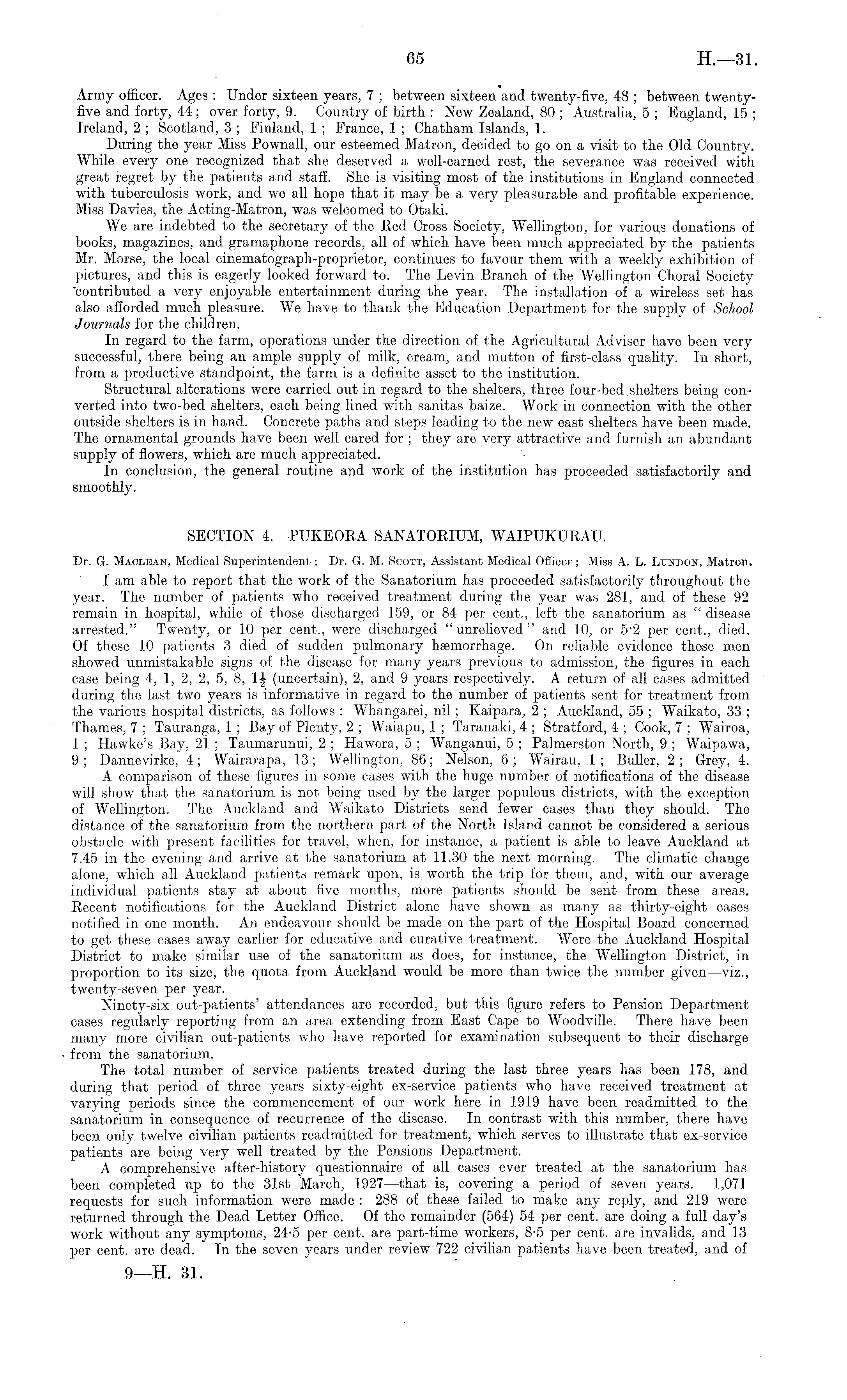 Army officer. Ages : Under sixteen years, 7 ; between sixteen and twenty-five, 48 ; between twentyfive and forty, 44; over forty, 9. Country of birth : New Zealand, 80 ; Australia, 5 ; England, 15 ; Ireland, 2 ; Scotland, 3 ; Finland, 1 ; France, 1 ; Chatham Islands, 1. During the year Miss Pownall, our esteemed Matron, decided to go on a visit to the Old Country. While every one recognized that she deserved a well-earned rest, the severance was received with great regret by the patients and staff. She is visiting most of the institutions in England connected with tuberculosis work, and we all hope that it may be a very pleasurable and profitable experience. Miss Davies, the Acting-Matron, was welcomed to Otaki. We are indebted to the secretary of the Red Cross Society, Wellington, for various donations of books, magazines, and gramaphone records, all of which have been much appreciated by the patients Mr. Morse, the local cinematograph-proprietor, continues to favour them with a weekly exhibition of pictures, and this is eagerly looked forward to. The Levin Branch of the Wellington Choral Society 'contributed a very enjoyable entertainment during the year. The installation of a wireless set has also afforded much pleasure. We have to thank the Education Department for the supply of School Journals for the children. In regard to the farm, operations under the direction of the Agricultural Adviser have been very successful, there being an ample supply of milk, cream, and mutton of first-class quality. In short, from a productive standpoint, the farm is a definite asset to the institution. Structural alterations were carried out in regard to the shelters, three four-bed. shelters being converted into two-bed shelters, each being lined with sanitas baize. Work in connection with the other outside shelters is in hand. Concrete paths and steps leading to the new east shelters have been made. The ornamental grounds have been well cared for ; they are very attractive and furnish an abundant supply of flowers, which are much appreciated. In conclusion, the general routine and work of the institution has proceeded satisfactorily and smoothly. SECTION 4.—PUKEORA SANATORIUM, WAIPUKURAU. Dr. G. Maclean, Medical Superintendent; Dr. G. M. Scott, Assistant Medical Officer; Miss A. L. Lundon, Matron. I am able to report that the work of the Sanatorium has proceeded satisfactorily throughout the year. The number of patients who received treatment during the year was 281, and of these 92 remain in hospital, while of those discharged 159, or 84 per cent., left the sanatorium as " disease arrested." Twenty, or 10 per cent., were discharged "unrelieved" and 10, or 5 - 2 per cent., died. Of these 10 patients 3 died of sudden pulmonary haemorrhage. On reliable evidence these men showed unmistakable signs of the disease for many years previous to admission, the figures in each case being 4, 1, 2, 2, 5, 8, If (uncertain), 2, and 9 years respectively. A return of all cases admitted during the last two years is informative in regard to the number of patients sent for treatment from the various hospital districts, as follows : Whangarei, nil; Kaipara, 2 ; Auckland, 55 ; Waikato, 33 ; Thames, 7 ; Tauranga, 1 ; Bay of Plenty, 2 ; Waiapu, 1 ; Taranaki, 4 ; Stratford, 4 ; Cook, 7 ; Wairoa, 1 ; Hawke's Bay, 21 ; Taumarunui, 2 ; Hawera, 5 ; Wanganui, 5 ; Palmerston North, 9 ; Waipawa, 9 ; Dannevirke, 4; Wairarapa, 13; Wellington, 86; Nelson, 6 ; Wairau, 1 ; Buller, 2 ; Grey, 4. A comparison of these figures in some cases with the huge number of notifications of the disease will show that the sanatorium is not being used by the larger populous districts, with the exception of Wellington. The Auckland and Waikato Districts send fewer cases than they should. The distance of the sanatorium from the northern part of the North Island cannot be considered a serious obstacle with present facilities for travel, when, for instance, a patient is able to leave Auckland at 7.45 in the evening and arrive at the sanatorium at 11.30 the next morning. The climatic change alone, which all Auckland patients remark upon, is worth the trip for them, and, with our average individual patients stay at about five months, more patients should be sent from these areas. Recent notifications for the Auckland District alone have shown as many as thirty-eight cases notified in one month. An endeavour should be made on the part of the Hospital Board concerned to get these cases away earlier for educative and curative treatment. Were the Auckland Hospital District to make similar use of the sanatorium as does, for instance, the Wellington District, in proportion to its size, the quota from Auckland would be more than twice the number given—viz., twenty-seven per year. Ninety-six out-patients' attendances are recorded, but this figure refers to Pension Department cases regularly reporting from an area extending from East Cape to Woodville. There have been many more civilian out-patients who have reported for examination subsequent to their discharge from the sanatorium. The total number of service patients treated during the last three years has been 178, and during that period of three years sixty-eight ex-service patients who have received treatment at varying periods since the commencement of our work here in 1919 have been readmitted to the sanatorium in consequence of recurrence of the disease. In contrast with this number, there have been only twelve civilian patients readmitted for treatment, which serves to illustrate that ex-service patients are being very well treated by the Pensions Department. A comprehensive after-history questionnaire of all cases ever treated at the sanatorium has been completed up to the 31st March, 1927 —that is, covering a period of seven years. 1,071 requests for such information were made : 288 of these failed to make any reply, and 219 were returned through the Dead Letter Office. Of the remainder (564) 54 per 