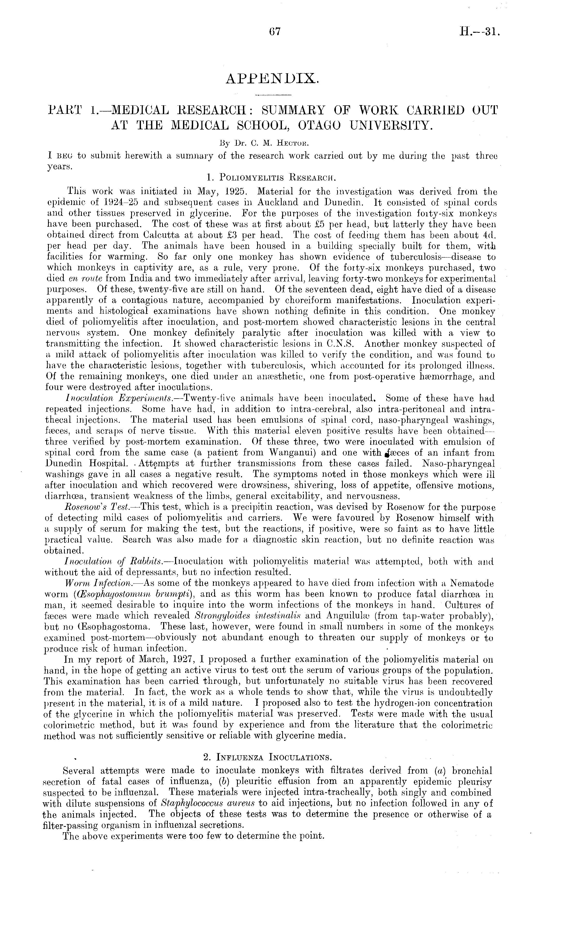 APPENDIX. PART I.—MEDICAL RESEARCH: SUMMARY OF WORK CARRIED OUT AT THE MEDICAL SCHOOL, OTAGO UNIVERSITY. By Dr. C. M. Hector. I beg to submit herewith a sumnary of the research work carried out by me during the past three years. 1. Poliomyelitis Research. This work was initiated in May, 1925. Material for the investigation was derived from the epidemic of 1924-25 and subsequent cases in Auckland and Dunedin. It consisted of spinal cords and other tissues preserved in glycerine. For the purposes of the investigation foity-six monkeys have been purchased. The cost of these was at first about £5 per head, but latterly they have been obtained direct from Calcutta at about £3 per head. The cost of feeding them has been about 4d. per head per day. The animals have been housed in a building specially built for them, with facilities for warming. So far only one monkey has shown evidence of tuberculosis —disease to which monkeys in captivity are, as a rule, very prone. Of the forty-six monkeys purchased, two died en route from India and two immediately after arrival, leaving forty-two monkeys for experimental purposes. Of these, twenty-five are still on hand. Of the seventeen dead, eight have died of a disease apparently of a contagious nature, accompanied by choreiform manifestations. Inoculation experiments and histological examinations have shown nothing definite in this condition. One monkey died of poliomyelitis after inoculation, and post-mortem showed characteristic lesions in the central nervous system. One monkey definitely paralytic after inoculation was killed with a view to transmitting the infection. It showed characteristic lesions in C.N.S. Another monkey suspected of a mild attack of poliomyelitis after inoculation was killed to verify the condition, and was found to have the characteristic lesions, together with tuberculosis, which accounted for its prolonged illness. Of the remaining monkeys, one died under an anaesthetic, one from post-operative haemorrhage, and four were destroyed after inoculations. Inoculation Experiments. —Twenty-five animals have been inoculated. Some of these have had repeated injections. Some have had, in addition to intra-cerebral, also intra-peritoneal and intrathecal injections. The material used has been emulsions of spinal cord, naso-pharyngeal washings, faeces, and scraps of nerve tissue. With this material eleven positive results have been obtained — three verified by post-mortem examination. Of these three, two were inoculated with emulsion of spinal cord from the same case (a patient from Wanganui) and one with Jaoces of an infant from Dunedin Hospital. . Attempts at further transmissions from these cases failed. Naso-pharyngeal washings gave in all cases a negative result. The symptoms noted in those monkeys which were ill after inoculation and which recovered were drowsiness, shivering, loss of appetite, offensive motions, diarrhoea, transient weakness of the limbs, general excitability, and nervousness. Rosenow's Test. —This test, which is a precipitin reaction, was devised by Rosenow for the purpose of detecting mild cases of poliomyelitis and carriers. We were favoured by Rosenow himself with a supply of serum for making the test, but the reactions, if positive, were so faint as to have little practical value. Search was also made for a diagnostic skin reaction, but no definite reaction was obtained. Inoculation of Rabbits. —Inoculation with poliomyelitis material was attempted, both with and without the aid of depressants, but no infection resulted. Worm Infection. —As some of the monkeys appeared to have died from infection with a Nematode worm (CEsophagostomum brumjpti), and as this worm has been known to produce fatal diarrhoea in man, it seemed desirable to inquire into the worm infections of the monkeys in hand. Cultures of faeces were made which revealed Strongyloses intestinalis and Anguilulae (from tap-water probably), but no (Esophagostoma. These last, however, were found in small numbers in some of the monkeys examined post-mortem —obviously not abundant enough to threaten our supply of monkeys or to produce risk of human infection. In my report of March, 1927, I proposed a further examination of the poliomyelitis material on hand, in the hope of getting an active virus to test out the serum of various groups of the population. This examination has been carried through, but unfortunately no suitable virus has been recovered from the material. In fact, the work as a whole tends to show that, while the virus is undoubtedly present in the material, it is of a mild nature. I proposed also to test the hydrogen-ion concentration of the glycerine in which the poliomyelitis material was preserved. Tests were made with the usual colorimetric method, but it was found by experience and from the literature that the colorimetric method was not sufficiently sensitive or reliable with glycerine media. 2. Influenza Inoculations. Several attempts were made to inoculate monkeys with filtrates derived from (a) bronchial secretion of fatal cases of influenza, (6) pleuritic effusion from an apparently epidemic pleurisy suspected to be influenzal. These materials were injected intra-tracheally, both singly and combined with dilute suspensions of Staphylococcus aureus to aid injections, but no infection followed in any of the animals injected. The objects of these tests was to determine the presence or otherwise of a filter-passing organism in influenzal secretions. The above experiments were too few to determine the point.