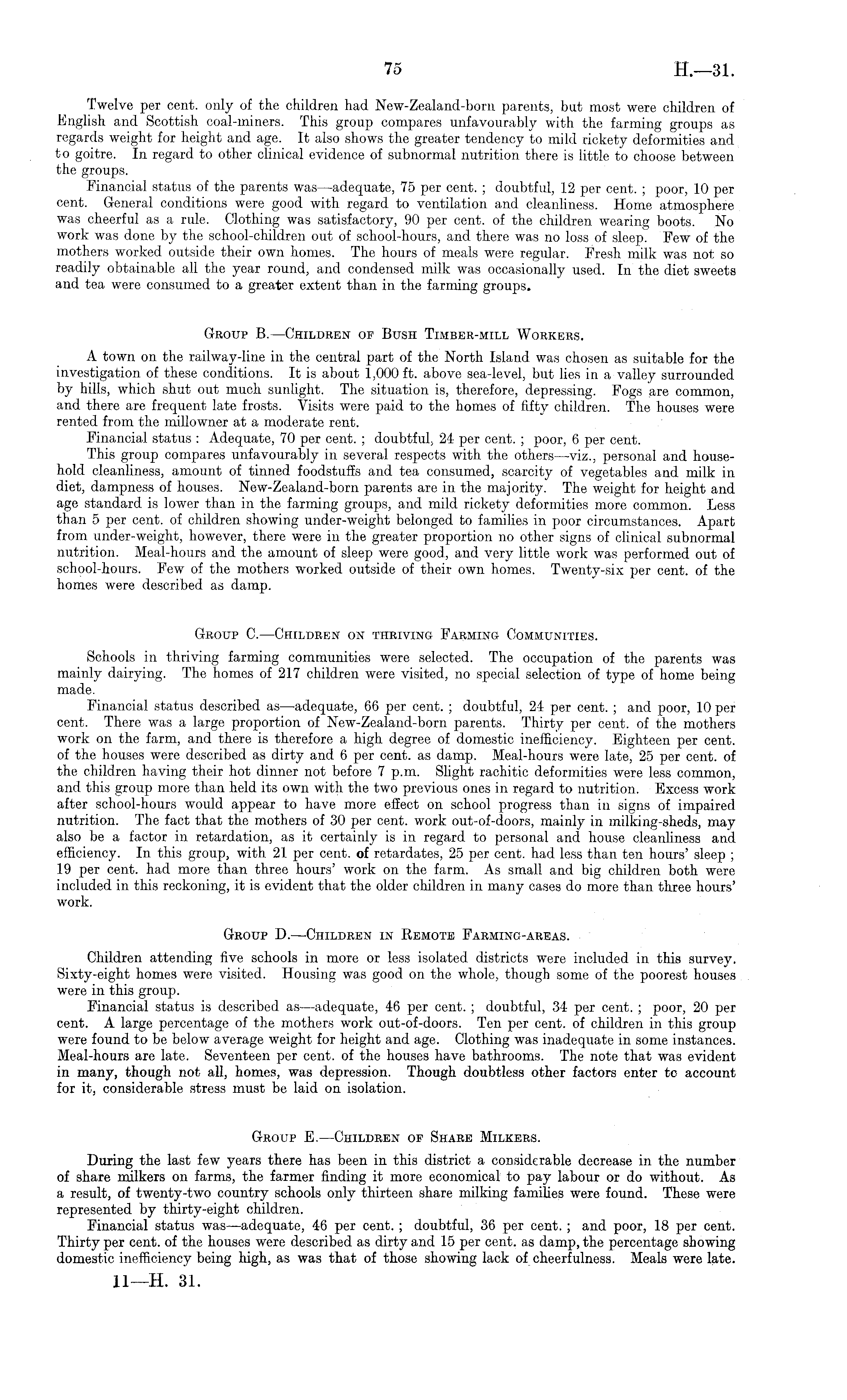 Twelve per cent, only of the children had New-Zealand-born parents, but most were children of English and Scottish coal-miners. This group compares unfavourably with the farming groups as regards weight for height and age. It also shows the greater tendency to mild rickety deformities and to goitre. In regard to other clinical evidence of subnormal nutrition there is little to choose between the groups. Financial status of the parents was —adequate, 75 per cent. ; doubtful, 12 per cent. ; poor, 10 per cent. General conditions were good with regard to ventilation and cleanliness. Home atmosphere was cheerful as a rule. Clothing was satisfactory, 90 per cent, of the children wearing boots. No work was done by the school-children out of school-hours, and there was no loss of sleep. Few of the mothers worked outside their own homes. The hours of meals were regular. Fresh milk was not so readily obtainable all the year round, and condensed milk was occasionally used. In the diet sweets and tea were consumed to a greater extent than in the farming groups. Group B. —Children of Bush Timber-mill Workers. A town on the railway-line in the central part of the North Island was chosen as suitable for the investigation of these conditions. It is about 1,000 ft. above sea-level, but lies in a valley surrounded by hills, which shut out much sunlight. The situation is, therefore, depressing. Fogs are common, and there are frequent late frosts. Visits were paid to the homes of fifty children. The houses were rented from the millowner at a moderate rent. Financial status : Adequate, 70 per cent. ; doubtful, 24 per cent. ; poor, 6 per cent. This group compares unfavourably in several respects with the others—viz., personal and household cleanliness, amount of tinned foodstuffs and tea consumed, scarcity of vegetables and milk in diet, dampness of houses. New-Zealand-born parents are in the majority. The weight for height and age standard is lower than in the farming groups, and mild rickety deformities more common. Less than 5 per cent, of children showing under-weight belonged to families in poor circumstances. Apart from under-weight, however, there were in the greater proportion no other signs of clinical subnormal nutrition. Meai-hours and the amount of sleep were good, and very little work was performed out of school-hours. Few of the mothers worked outside of their own homes. Twenty-six per cent, of the homes were described as damp. Group C.—Children on thriving Farming Communities. Schools in thriving farming communities were selected. The occupation of the parents was mainly dairying. The homes of 217 children were visited, no special selection of type of home being made. Financial status described as —adequate, 66 per cent. ; doubtful, 24 per cent. ; and poor, 10 per cent. There was a large proportion of New-Zealand-born parents. Thirty per cent, of the mothers work on the farm, and there is therefore a high degree of domestic inefficiency. Eighteen per cent, of the houses were described as dirty and 6 per cent, as damp. Meal-hours were late, 25 per cent, of the children having their hot dinner not before 7 p.m. Slight rachitic deformities were less common, and this group more than held its own with the two previous ones in regard to nutrition. Excess work after school-hours would appear to have more effect on school progress than in signs of impaired nutrition. The fact that the mothers of 30 per cent, work out-of-doors, mainly in milking-sheds, may also be a factor in retardation, as it certainly is in regard to personal and house cleanliness and efficiency. In this group, with 21 per cent, of retardates, 25 per cent, had less than ten hours' sleep ; 19 per cent, had more than three hours' work on the farm. As small and big children both were included in this reckoning, it is evident that the older children in many cases do more than three hours' work. Group D.—Children in Remote Farming-areas. Children attending five schools in more or less isolated districts were included in this survey. Sixty-eight homes were visited. Housing was good on the whole, though some of the poorest houses were in this group. Financial status is described as —adequate, 46 per cent. ; doubtful, 34 per cent. ; poor, 20 per cent. A large percentage of the mothers work out-of-doors. Ten per cent, of children in this group were found to be below average weight for height and age. Clothing was inadequate in some instances. Meal-hours are late. Seventeen per cent, of the houses have bathrooms. The note that was evident in many, though not all, homes, was depression. Though doubtless other factors enter to account for it, considerable stress must be laid on isolation. Group E. —Children of Share Milkers. During the last few years there has been in this district a considerable decrease in the number of share milkers on farms, the farmer finding it more economical to pay labour or do without. As a result, of twenty-two country schools only thirteen share milking families were found. These were represented by thirty-eight children. Financial status was —adequate, 46 per cent. ; doubtful, 36 per cent. ; and poor, 18 per cent. Thirty per cent, of the houses were described as dirty and 15 per cent, as damp, the percentage showing domestic inefficiency being high, as was that of those showing lack of cheerfulness. Meals were late.