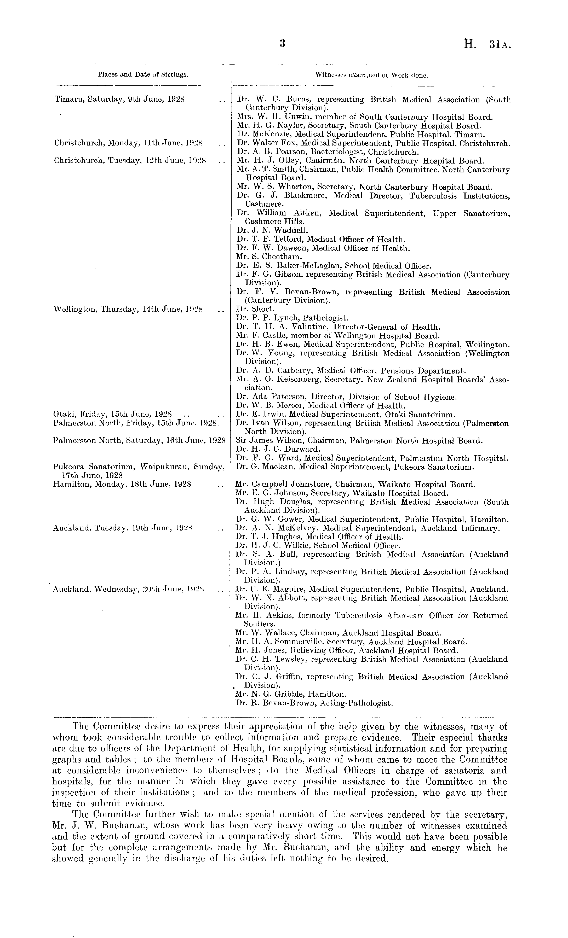 The Committee desire to express their appreciation of the help given by the witnesses, many of whom took considerable trouble to collect information and prepare evidence. Their especial thanks are due to officers of the Department of Health, for supplying statistical information and for preparing graphs and tables ; to the members of Hospital Boards, some of whom came to meet the Committee at considerable inconvenience to themselves ; ito the Medical Officers in charge of sanatoria and hospitals, for the manner in which they gave every possible assistance to the Committee in the inspection of their institutions ; and to the members of the medical profession, who gave up their time to submit evidence. The Committee further wish to make special mention of the services rendered by the secretary, Mr. J. W. Buchanan, whose work has been very heavy owing to the number of witnesses examined and the extent of ground covered in a comparatively short time. This would not have been possible but for the complete arrangements made by Mr. Buchanan, and the ability and energy which he showed generally in the discharge of his duties left nothing to be desired.