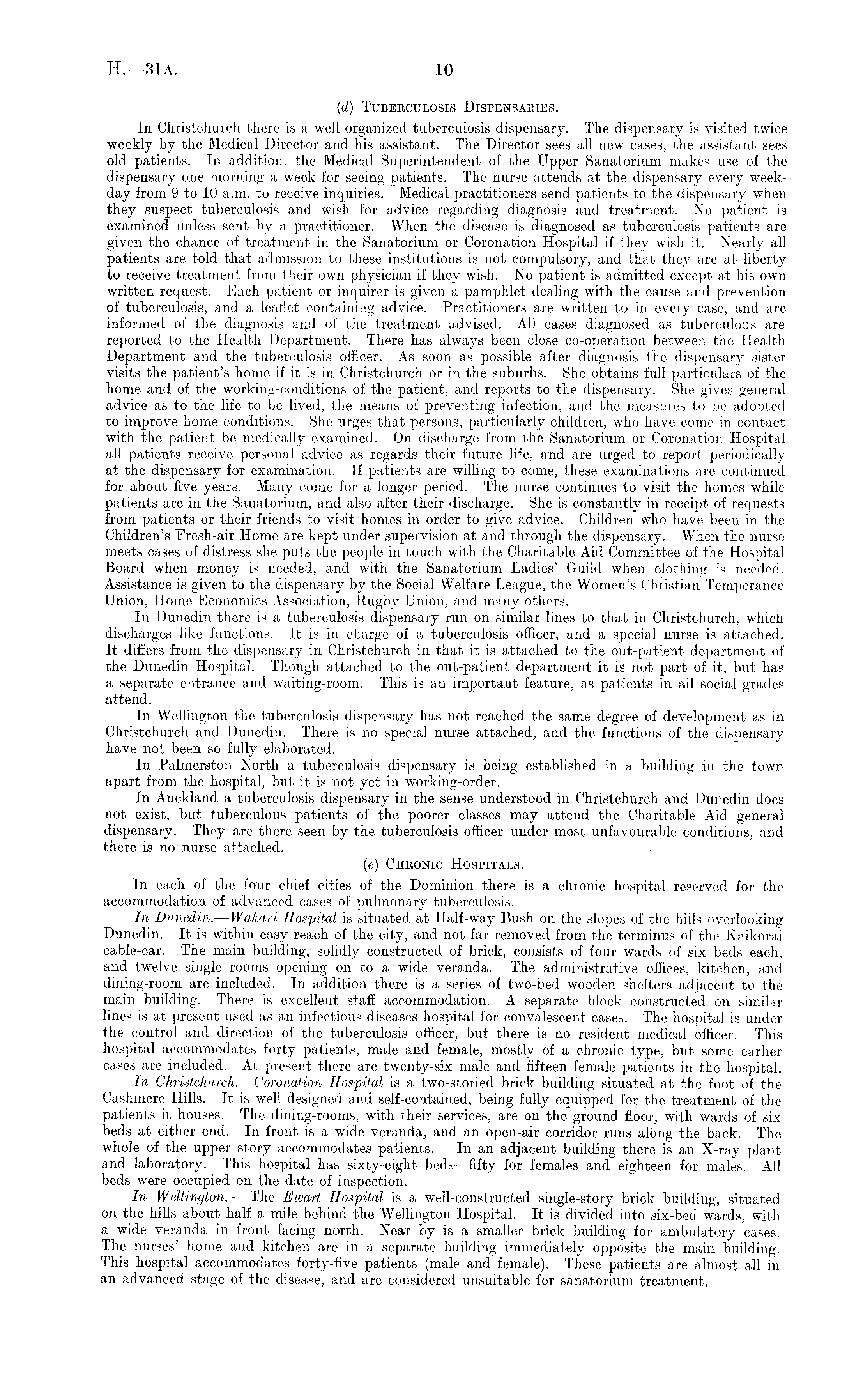 (id) Tuberculosis Dispensaries. In Christchurch there is a well-organized tuberculosis dispensary. The dispensary is visited twice weekly by the Medical Director and his assistant. The Director sees all new cases, the assistant sees old patients. In addition, the Medical Superintendent of the Upper Sanatorium makes use of the dispensary one morning a week for seeing patients. The nurse attends at the dispensary every weekday from 9to 10 a.m. to receive inquiries. Medical practitioners send patients to the dispensary when they suspect tuberculosis and wish for advice regarding diagnosis and treatment. No patient is examined unless sent by a practitioner. When the disease is diagnosed as tuberculosis patients are given the chance of treatment in the Sanatorium or Coronation Hospital if they wish it. Nearly all patients are told that admission to these institutions is not compulsory, and that they are at liberty to receive treatment from their own physician if they wish. No patient is admitted except at his own written request. Each patient or inquirer is given a pamphlet dealing with the cause and prevention of tuberculosis, and a leaflet containing advice. Practitioners are written to in every case, and are informed of the diagnosis and of the treatment advised. All cases diagnosed as tuberculous are reported to the Health Department. There has always been close co-operation between the Health Department and the tuberculosis officer. As soon as possible after diagnosis the dispensary sister visits the patient's home if it is in Christchurch or in the suburbs. She obtains full particulars of the home and of the working-conditions of the patient, and reports to the dispensary. She gives general advice as to the life to be lived, the means of preventing infection, and the measures to be adopted to improve home conditions. She urges that persons, particularly children, who have come in contact with the patient be medically examined. On discharge from the Sanatorium or Coronation Hospital all patients receive personal advice as regards their future life, and are urged to report periodically at the dispensary for examination. If patients are willing to come, these examinations are continued for about five years. Many come for a longer period. The nurse continues to visit the homes while patients are in the Sanatorium, and also after their discharge. She is constantly in receipt of requests from patients or their friends to visit homes in order to give advice. Children who have been in the Children's Fresh-air Home are kept under supervision at and through the dispensary. When the nurse meets cases of distress she puts the people in touch with the Charitable Aid Committee of the Hospital Board when money is needed, and with the Sanatorium Ladies' Guild when clothing is needed. Assistance is given to the dispensary by the Social Welfare League, the Women's Christian Temperance Union, Home Economics Association, Rugby Union, and many others. In Dunedin there is a tuberculosis dispensary run on similar lines to that in Christchurch, which discharges like functions. It is in charge of a tuberculosis officer, and a special nurse is attached. It differs from the dispensary in Christchurch in that it is attached to the out-patient department of the Dunedin Hospital. Though attached to the out-patient department it is not part of it, but has a separate entrance and waiting-room. This is an important feature, as patients in all social grades attend. In Wellington the tuberculosis dispensary has not reached the same degree of development as in Christchurch and Dunedin. There is no special nurse attached, and the functions of the dispensary have not been so fully elaborated. In Palmerston North a tuberculosis dispensary is being established in a building in the town apart from the hospital, but it is not yet in working-order. In Auckland a tuberculosis dispensary in the sense understood in Christchurch and Dunedin does not exist, but tuberculous patients of the poorer classes may attend the Charitable Aid general dispensary. They are there seen by the tuberculosis officer under most unfavourable conditions, and there is no nurse attached. (e) Chronic Hospitals. In each of the four chief cities of the Dominion there is a chronic hospital reserved for the accommodation of advanced cases of pulmonary tuberculosis. In Dunedin. —Walcari Hospital is situated at Half-way Push on the slopes of the hills overlooking Dunedin. It is within easy reach of the city, and not far removed from the terminus of the Kaikorai cable-car. The main building, solidly constructed of brick, consists of four wards of six beds each, and twelve single rooms opening on to a wide veranda. The administrative offices, kitchen, and dining-room are included. In addition there is a series of two-bed wooden shelters adjacent to the main building. There is excellent staff accommodation. A separate block constructed 011 similar lines is at present used as an infectious-diseases hospital for convalescent cases. The hospital is under the control and direction of the tuberculosis officer, but there is no resident medical officer. This hospital accommodates forty patients, male and female, mostly of a chronic type, but some earlier cases are included. At present there are twenty-six male and fifteen female patients in the hospital. In Christchurch.—■ Coronation Hospital is a two-storied brick building situated at the foot of the Cashmere Hills. It is well designed and self-contained, being fully equipped for the treatment of the patients it houses. The dining-rooms, with their services, are on the ground floor, with wards of six beds at either end. In front is a wide veranda, and an open-air corridor runs along the back. The whole of the upper story accommodates patients. In an adjacent building there is an X-ray plant and laboratory. This hospital has sixty-eight beds —fifty for females and eighteen for males. All beds were occupied on the 