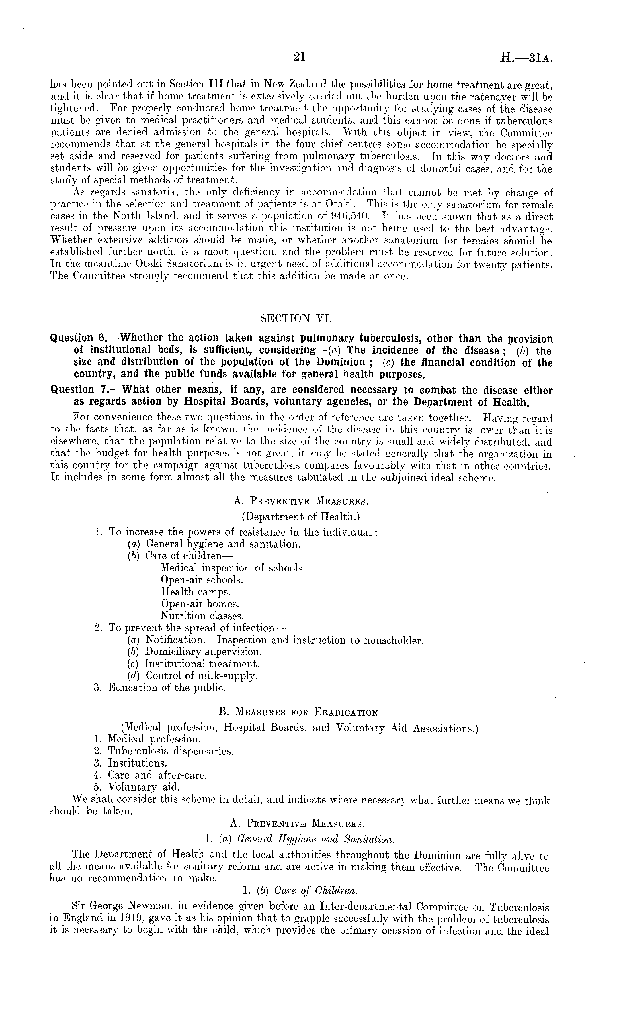has been pointed out in Section 111 that in New Zealand the possibilities for home treatment are great, and it is clear that if home treatment is extensively carried out the burden upon the ratepayer will be lightened. For properly conducted home treatment the opportunity for studying cases of the disease must be given to medical practitioners and medical students, and this cannot be done if tuberculous patients are denied admission to the general hospitals. With this object in view, the Committee recommends that at the general hospitals in the four chief centres some accommodation be specially set aside and reserved for patients suffering from pulmonary tuberculosis. In this way doctors and students will be given opportunities for the investigation and diagnosis of doubtful cases, and for the study of special methods of treatment. As regards sanatoria, the only deficiency in accommodation that cannot be met by change of practice in the selection and treatment of patients is at Otaki. This is the only sanatorium for female cases in the North Island, and it serves a population of 946,540. It has been shown that as a direct result of pressure upon its accommodation this institution is not being used to the best advantage. Whether extensive addition should be made, or whether another sanatorium for females should be established further north, is a moot question, and the problem must be reserved for future solution. In the meantime Otaki Sanatorium is in urgent need of additional accommodation for twenty patients. The Committee strongly recommend that this addition be made at once. SECTION VI. Question 6. —Whether the action taken against pulmonary tuberculosis, other than the provision of institutional beds, is sufficient, considering—(a) The incidence of the disease; (6) the size and distribution of the population of the Dominion ; (e) the financial condition of the country, and the public funds available for general health purposes. Question 7. —What other means, if any, are considered necessary to combat the disease either as regards action by Hospital Boards, voluntary agencies, or the Department of Health. For convenience these two questions in the order of reference are taken together. Having regard to the facts that, as far as is known, the incidence of the disease in this country is lower than it is elsewhere, that the population relative to the size of the country is small and widely distributed, and that the budget for health purposes is not great, it may be stated generally that the organization in this country for the campaign against tuberculosis compares favourably with that in other countries. It includes in some form almost all the measures tabulated in the subjoined ideal scheme. A. Preventive Measures. (Department of Health.) 1. To increase the powers of resistance in the individual:— (a) General hygiene and sanitation. (b) Care of children— Medical inspection of schools. Open-air schools. Health camps. Open-air homes. Nutrition classes. 2. To prevent the spread of infection— (а) Notification. Inspection and instruction to householder. (б) Domiciliary supervision. (c) Institutional treatment. (d) Control of milk-supply. 3. Education of the public. B. Measures for Eradication. (Medical profession, Hospital Boards, and Voluntary Aid Associations.) 1. Medical profession. 2. Tuberculosis dispensaries. 3. Institutions. 4. Care and after-care. 5. Voluntary aid. We shall consider this scheme in detail, and indicate where necessary what further means we think should be taken. A. Preventive Measures. 1. (a) General Hygiene and Sanitation. The Department of Health and the local authorities throughout the Dominion are fully alive to all the means available for sanitary reform and are active in making them effective. The Committee has no recommendation to make. 1. (b) Care of Children. Sir George Newman, in evidence given before an Inter-departmental Committee on Tuberculosis in England in 1919, gave it as his opinion that to grapple successfully with the problem of tuberculosis it is necessary to begin with the child, which provides the primary occasion of infection and the ideal