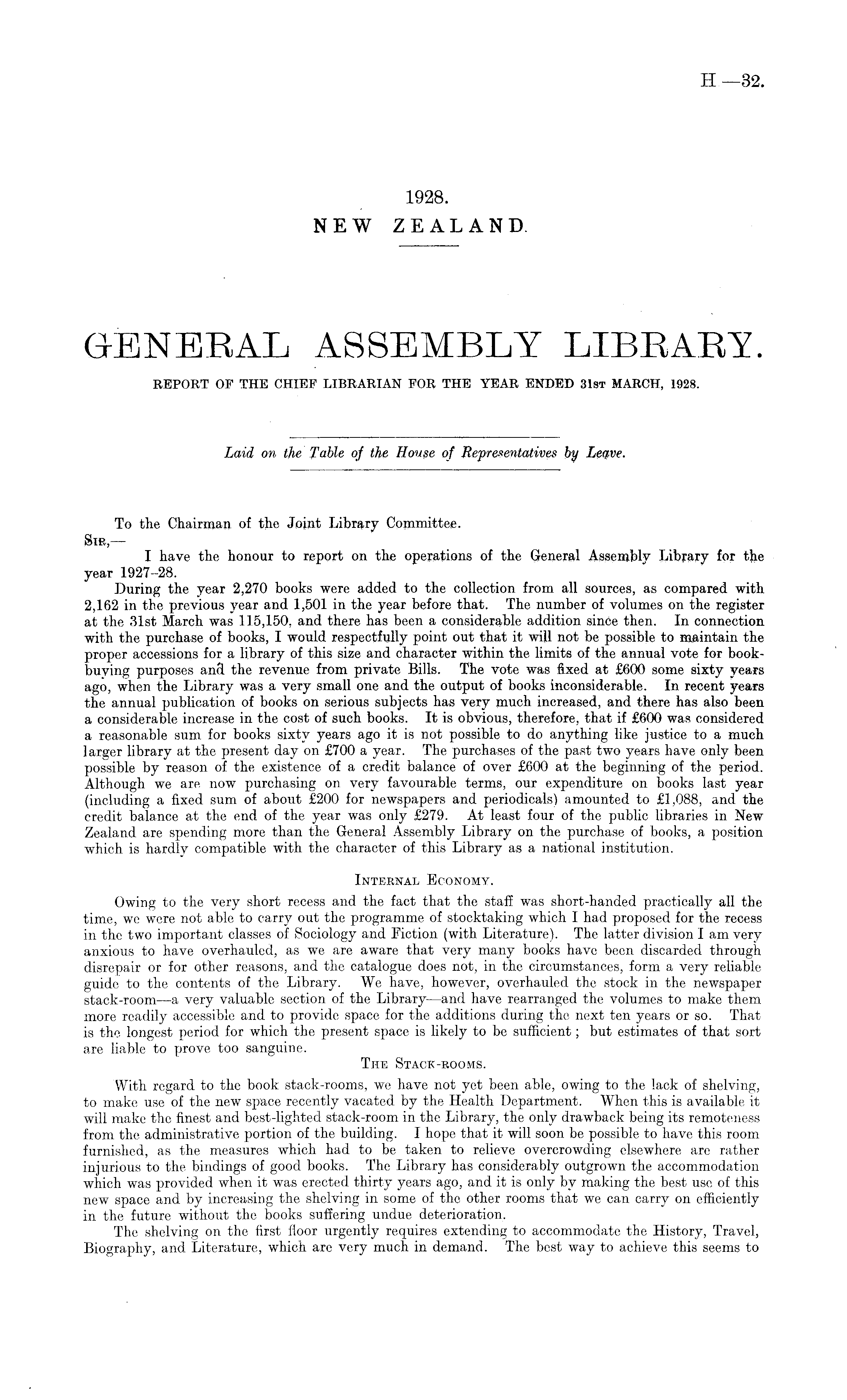 To the Chairman of the Joint Library Committee. Sir, — I have the honour to report on the operations of the General Assembly Library for the year 1927-28. During the year 2,270 books were added to the collection from all sources, as compared with 2,162 in the previous year and 1,501 in the year before that. The number of volumes on the register at the 31st. March was 115,150, and there has been a considerable addition since then. In connection with the purchase of books, I would respectfully point out that it will not be possible to maintain the proper accessions for a library of this size and character within the limits of the annual vote for bookbuying purposes and the revenue from private Bills. The vote was fixed at £600 some sixty years ago, when the Library was a very small one and the output of books inconsiderable. In recent years the annual publication of books on serious subjects has very much increased, and there has also been a considerable increase in the cost of such books. It is obvious, therefore, that if £600 was considered a reasonable sum for books sixty years ago it is not possible to do anything like justice to a much larger library at the present day on £700 a year. The purchases of the past two years have only been possible by reason of the existence of a credit balance of over £600 at the beginning of the period. Although we are now purchasing on very favourable terms, our expenditure on books last year (including a fixed sum of about £200 for newspapers and periodicals) amounted to £1,088, and the credit balance at the end of the year was only £279. At least four of the public libraries in New Zealand are spending more than the General Assembly Library on the purchase of books, a position which is hardly compatible with the character of this Library as a national institution. Internal Economy. Owing to the very short recess and the fact that the staff was short-handed practically all the time, we were not able to carry out the programme of stocktaking which I had proposed for the recess in the two important classes of Sociology and Fiction (with Literature). The latter division lam very anxious to have overhauled, as we are aware that very many books have been discarded through disrepair or for other reasons, and the catalogue does not, in the circumstances, form a very reliable guide to the contents of the Library. We have, however, overhauled the stock in the newspaper stack-room —a very valuable section of the Library—and have rearranged the volumes to make them more readily accessible and to provide space for the additions during the next ten years or so. That is the longest period for which the present space is likely to be sufficient; but estimates of that sort are liable to prove too sanguine. Ti-ie Stack-rooms. With regard to the book stack-rooms, we have not yet been able, owing to the lack of shelving, to make use of the new space recently vacated by the Health Department. When this is available it will make the finest and best-lighted stack-room in the Library, the only drawback being its remoteness from the administrative portion of the building. I hope that it will soon be possible to have this room furnished, as the measures which had to be taken to relieve overcrowding elsewhere are rather injurious to the bindings of good books. The Library has considerably outgrown the accommodation which was provided when it was erected thirty years ago, and it is only by making the best use of this new space and by increasing the shelving in some of the other rooms that we can carry on efficiently in the future without the books suffering undue deterioration. The shelving on the first floor urgently requires extending to accommodate the History, Travel, Biography, and Literature, which are very much in demand. The best way to achieve this seems to
