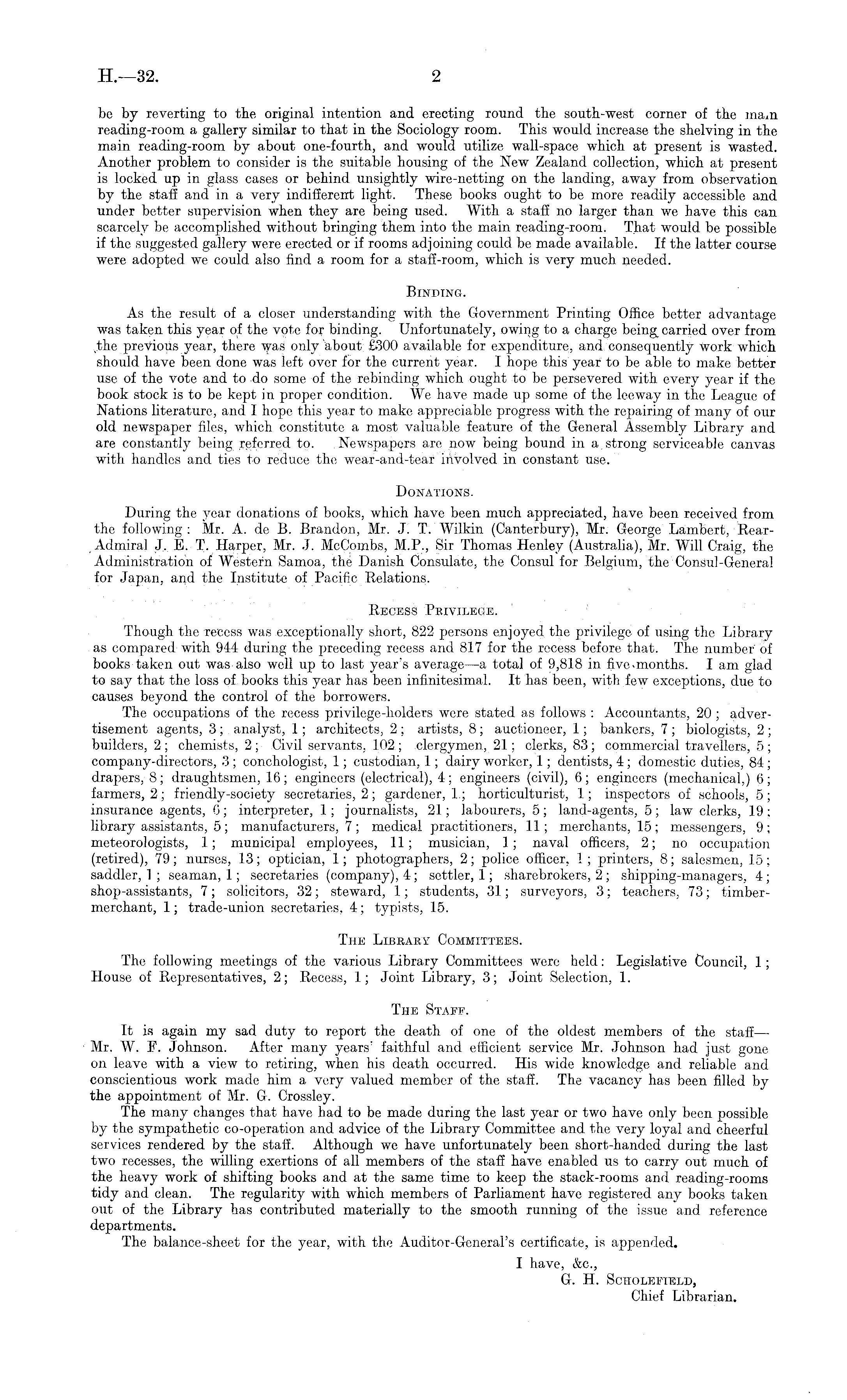be by reverting to the original intention and erecting round the south-west corner of the maxn reading-room a gallery similar to that in the Sociology room. This would increase the shelving in the main reading-room by about one-fourth, and would utilize wall-space which at present is wasted. Another problem to consider is the suitable housing of the New Zealand collection, which at present is locked up in glass cases or behind unsightly wire-netting on the landing, away from observation by the staff and in a very indifferent light. These books ought to be more readily accessible and under better supervision when they are being used. With a staff no larger than we have this can scarcely be accomplished without bringing them into the main reading-room. That would be possible if the suggested gallery were erected or if rooms adjoining could be made available. If the latter course were adopted we could also find a room for a staff-room, which is very much needed. Binding. As the result of a closer understanding with the Government Printing Office better advantage was taken this year of the vote fop binding. Unfortunately, owing to a charge being t carried over from .the previous year, there was only about £300 available for expenditure, and consequently work which should have been done was left over for the current year. I hope this year to be able to make better use of the vote and to do some of the rebinding which ought to be persevered with every year if the book stock is to be kept in proper condition. We have made up some of the leeway in the League of Nations literature, and I hope this year to make appreciable progress with the repairing of many of our old newspaper files, which constitute a most valuable feature of the General Assembly Library and are constantly being referred to. Newspapers are now being bound in a strong serviceable canvas with handles and ties to reduce the wear-and-tear involved in constant use. Donations. During the year donations of books, which have been much appreciated, have been received from the following: Mr. A. de B. Brandon, Mr. J. T. Wilkin (Canterbury), Mr. George Lambert, RearAdmira] J, E. T. Harper, Mr. J. McCombs, M.P., Sir Thomas Henley (Australia), Mr. Will Craig, the Administration of Western Samoa, the Danish Consulate, the Consul for Belgium, the Consul-General for Japan, and the Institute of Pacific. Relations. Recess Privilege. ' ; Though the recess was exceptionally short, 822 persons enjoyed the privilege of using the Library as compared with 944 during the preceding recess and 817 for the,recess before that. The number of books taken out was also well up to last year's average —a total of 9,818 in lam glad to say that the loss of books this year has been infinitesimal. It has been, with few exceptions, due to causes beyond the control of the borrowers. The occupations of the recess privilege-holders were stated as follows : Accountants, 20 ; advertisement agents, 3; . analyst, 1; architects, 2; artists, 8 ; auctioneer, 1; bankers, 7; biologists, 2; builders, 2 ; chemists, 2 ; Civil servants. 102 ; clergymen, 21; clerks, 83; commercial travellers, 5 ; company-directors, 3; conchologist, 1; custodian, 1; dairy worker, 1; dentists, 4; domestic duties, 84; drapers, 8; draughtsmen, 16; engineers (electrical), 4; engineers (civil), 6; engineers (mechanical,) 6; farmers, 2 ; friendly-society secretaries, 2 ; gardener, 1; horticulturist, 1; inspectors of schools, 5 ; insurance agents, G; interpreter, 1; journalists, 21; labourers, 5; land-agents, 5; law clerks, 19; library assistants, 5; manufacturers, 7; medical practitioners, 11; merchants, 15; messengers, 9; meteorologists, 1; municipal employees, 11; musician, 1; naval officers, 2; no occupation (retired), 79; nurses, 13; optician, 1; photographers, 2; police officer, 1 ; printers, 8; salesmen, 15; saddler, 1 ; seaman, 1; secretaries (company), 4; settler, I; sharebrokers, 2 ; shipping-managers, 4 ; shop-assistants, 7; solicitors, 32; steward, 1; students, 31; surveyors, 3; teachers, 73; timbermerchant, 1; trade-union secretaries, 4; typists, 15. The Library Committees. The following meetings of the various Library Committees were held: Legislative Council, 1; House of Representatives, 2; Recess, 1; Joint Library, 3; Joint Selection, 1. The Staff. It is again my sad duty to report the death of one of the oldest members of the staff— Mr. W. F. Johnson. After many years' faithful and efficient service Mr. Johnson had just gone on leave with a view to retiring, when his death occurred. His wide knowledge and reliable and conscientious work made him a very valued member of the staff. The vacancy has been filled by the appointment of Mr. G. Crossley. The many changes that have had to be made during the last year or two have only been possible by the sympathetic co-operation and advice of the Library Committee and the very loyal and cheerful services rendered by the staff. Although we have unfortunately been short-handed during the last two recesses, the willing exertions of all members of the staff have enabled us to carry out much of the heavy work of shifting books and at the same time to keep the stack-rooms and reading-rooms tidy and clean. The regularity with which members of Parliament have registered any books taken out of the Library has contributed materially to the smooth running of the issue and reference departments. The balance-sheet for the year, with the Auditor-General's certificate, is appended. I have, &c., G. H. SCHOLEFIELD, Chief Librarian.