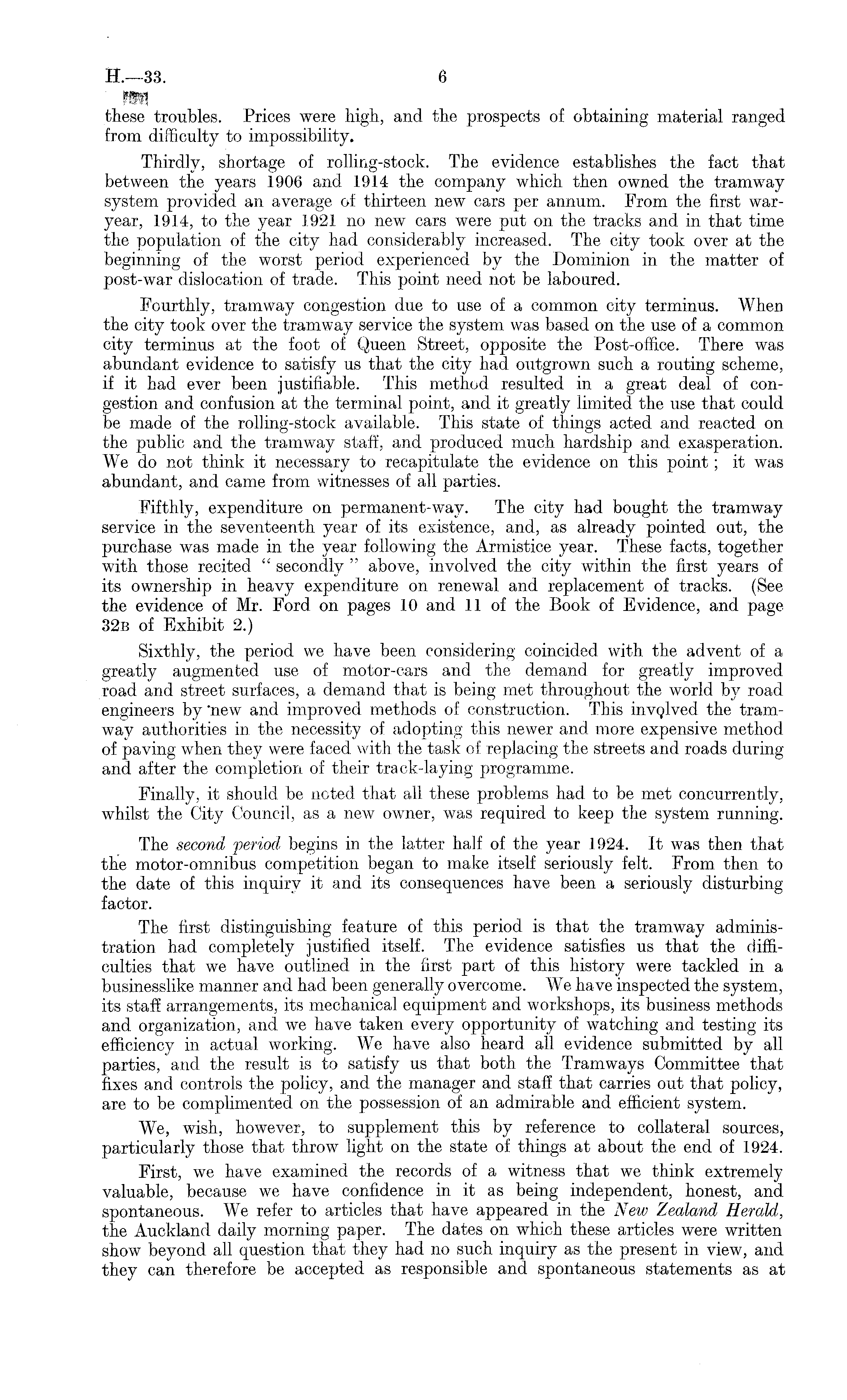 ?§« these troubles. Prices were high., and the prospects of obtaining material ranged from difficulty to impossibility. Thirdly, shortage of rolling-stock. The evidence establishes the fact that between the years 1906 and 1914 the company which then owned the tramway system provided an average of thirteen new cars per annum. From the first waryear, 1914, to the year 1921 no new cars were put on the tracks and in that time the population of the city had considerably increased. The city took over at the beginning of the worst period experienced by the Dominion in the matter of post-war dislocation of trade. This point need not be laboured. Fourthly, tramway congestion due to use of a common city terminus. When the city took over the tramway service the system was based on the use of a common city terminus at the foot of Queen Street, opposite the Post-office. There was abundant evidence to satisfy us that the city had outgrown such a routing scheme, if it had ever been justifiable. This method resulted in a great deal of congestion and confusion at the terminal point, and it greatly limited the use that could be made of the rolling-stock available. This state of things acted and reacted on the public and the tramway staff, and produced much hardship and exasperation. We do not think it necessary to recapitulate the evidence on this point; it was abundant, and came from witnesses of all parties. Fifthly, expenditure on permanent-way. The city had bought the tramway service in the seventeenth year of its existence, and, as already pointed out, the purchase was made in the year following the Armistice year. These facts, together with those recited " secondly " above, involved the city within the first years of its ownership in heavy expenditure on renewal and replacement of tracks. (See the evidence of Mr. Ford on pages 10 and 11 of the Book of Evidence, and page 32b of Exhibit 2.) Sixthly, the period we have been considering coincided with the advent of a greatly augmented use of motor-cars and the demand for greatly improved road and street surfaces, a demand that is being met throughout the world by road engineers by 'new and improved methods of construction. This invQlved the tramway authorities in the necessity of adopting this newer and more expensive method of paving when they were faced with the task of replacing the streets and roads during and after the completion of their track-laying programme. Finally, it should be noted that all these problems had to be met concurrently, whilst the City Council, as a new owner, was required to keep the system running. The second period begins in the latter half of the year 1924. It was then that the motor-omnibus competition began to make itself seriously felt. From then to the date of this inquiry it and its consequences have been a seriously disturbing factor. The first distinguishing feature of this period is that the tramway administration had completely justified itself. The evidence satisfies us that the difficulties that we have outlined in the first part of this history were tackled in a businesslike manner and had been generally overcome. We have inspected the system, its staff arrangements, its mechanical equipment and workshops, its business methods and organization, and we have taken every opportunity of watching and testing its efficiency in actual working. We have also heard all evidence submitted by all parties, and the result is to satisfy us that both the Tramways Committee that fixes and controls the policy, and the manager and staff that carries out that policy, are to be complimented on the possession of an admirable and efficient system. We, wish, however, to supplement this by reference to collateral sources, particularly those that throw light on the state of things at about the end of 1924. First, we have examined the records of a witness that we think extremely valuable, because we have confidence in it as being independent, honest, and spontaneous. We refer to articles that have appeared in the New Zealand Herald,, the Auckland daily morning paper. The dates on which these articles were written show beyond all question that they had no such inquiry as the present in view, and they can therefore be accepted as responsible and spontaneous statements as at