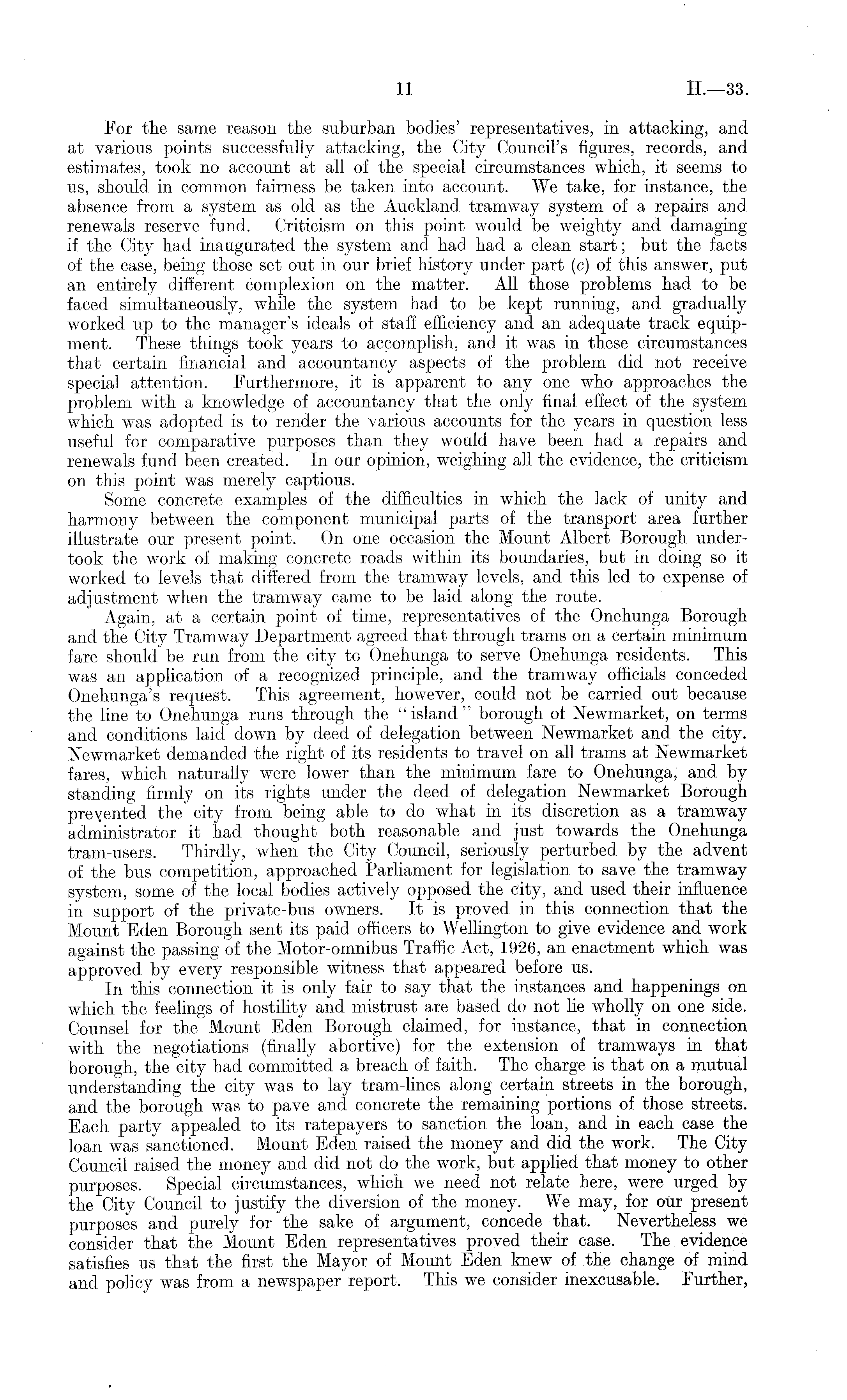 For the same reason the suburban bodies' representatives, in attacking, and at various points successfully attacking, the City Council's figures, records, and estimates, took no account at all of the special circumstances which, it seems to us, should in common fairness be taken into account. We take, for instance, the absence from a system as old as the Auckland tramway system of a repairs and renewals reserve fund. Criticism on this point would be weighty and damaging if the City had inaugurated the system and had had a clean start; but the facts of the case, being those set out in our brief history under part (c) of this answer, put an entirely different complexion on the matter. All those problems had to be faced simultaneously, while the system had to be kept running, and gradually worked up to the manager's ideals of staff efficiency and an adequate track equipment. These things took years to accomplish, and it was in these circumstances that certain financial and accountancy aspects of the problem did not receive special attention. Furthermore, it is apparent to any one who approaches the problem with a knowledge of accountancy that the only final effect of the system which was adopted is to render the various accounts for the years in question less useful for comparative purposes than they would have been had a repairs and renewals fund been created. In our opinion, weighing all the evidence, the criticism on this point was merely captious. Some concrete examples of the difficulties in which the lack of unity and harmony between the component municipal parts of the transport area further illustrate our present point. On one occasion the Mount Albert Borough undertook the work of making concrete roads within its boundaries, but in doing so it worked to levels that differed from the tramway levels, and this led to expense of adjustment when the tramway came to be laid along the route. Again, at a certain point of time, representatives of the Onehunga Borough and the City Tramway Department agreed that through trams on a certain minimum fare should be run from the city to Onehunga to serve Onehunga residents. This was an application of a recognized principle, and the tramway officials conceded Onehunga's request. This agreement, however, could not be carried out because the line to Onehunga runs through the "island" borough of Newmarket, on terms and conditions laid down by deed of delegation between Newmarket and the city. Newmarket demanded the right of its residents to travel on all trams at Newmarket fares, which naturally were lower than the minimum fare to Onehunga, and by standing firmly on its rights under the deed of delegation Newmarket Borough prevented the city from being able to do what in its discretion as a tramway administrator it had thought both reasonable and just towards the Onehunga tram-users. Thirdly, when the City Council, seriously perturbed by the advent of the bus competition, approached Parliament for legislation to save the tramway system, some of the local bodies actively opposed the city, and used their influence in support of the private-bus owners. It is proved in this connection that the Mount Eden Borough sent its paid officers bo Wellington to give evidence and work against the passing of the Motor-omnibus Traffic Act, 1926, an enactment which was approved by every responsible witness that appeared before us. In this connection it is only fair to say that the instances and happenings on which the feelings of hostility and mistrust are based do not lie wholly on one side. Counsel for the Mount Eden Borough claimed, for instance, that in connection with the negotiations (finally abortive) for the extension of tramways in that borough, the city had committed a breach of faith. The charge is that on a mutual understanding the city was to lay tram-lines along certain streets in the borough, and the borough was to pave and concrete the remaining portions of those streets. Each party appealed to its ratepayers to sanction the loan, and in each case the loan was sanctioned. Mount Eden raised the money and did the work. The City Council raised the money and did not do the work, but applied that money to other purposes. Special circumstances, which we need not relate here, were urged by the City Council to justify the diversion of the money. We may, for our present purposes and purely for the sake of argument, concede that. Nevertheless we consider that the Mount Eden representatives proved their case. The evidence satisfies us that the first the Mayor of Mount Eden knew of the change of mind and policy was from a newspaper report. This we consider inexcusable. Further,