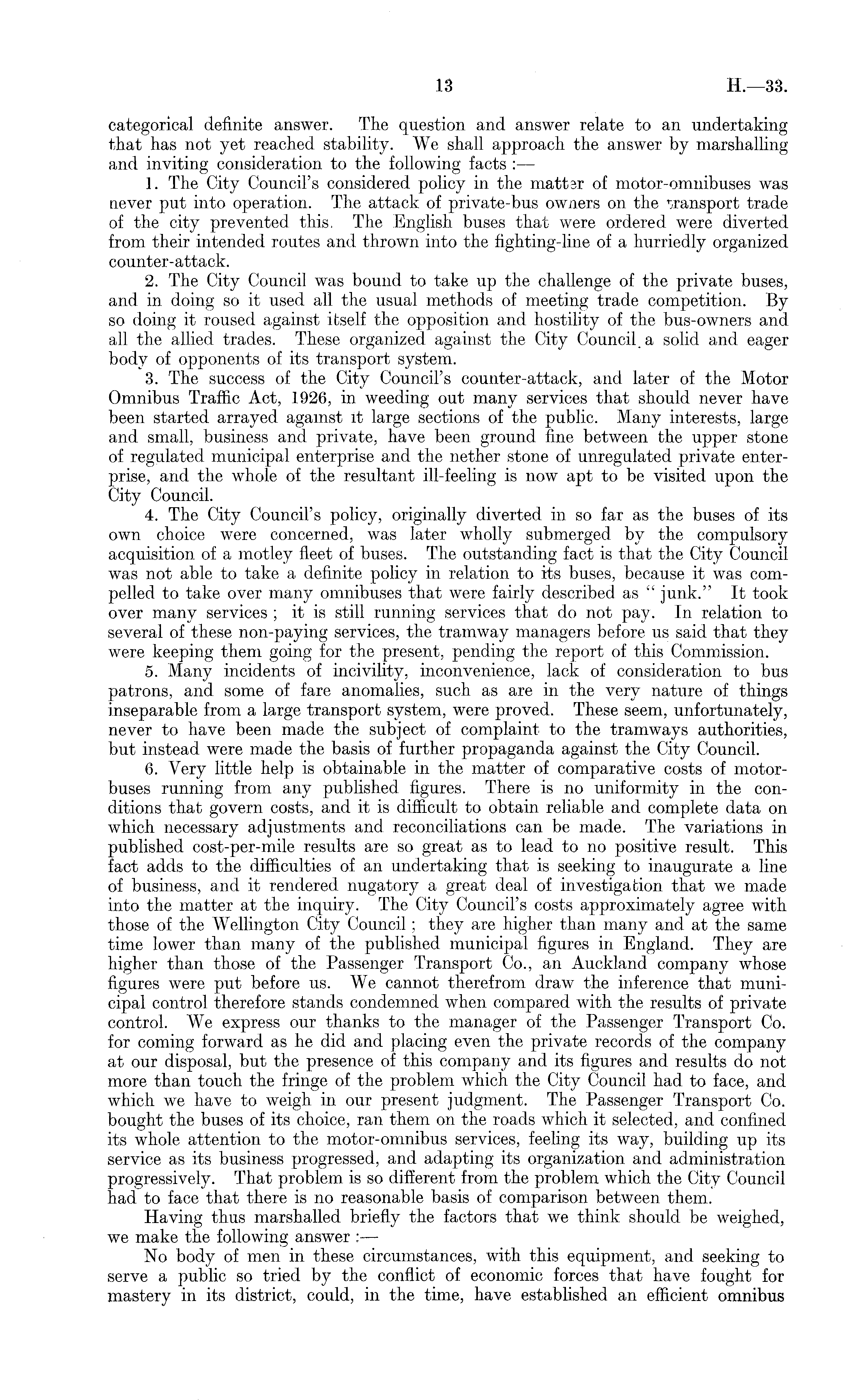 categorical definite answer. The question and answer relate to an undertaking that has not yet reached stability. We shall approach the answer by marshalling and inviting consideration to the following facts : — 1. The City Council's considered policy in the mattsr of motor-omnibuses was never put into operation. The attack of private-bus owners on the transport trade of the city prevented this. The English buses that were ordered were diverted from their intended routes and thrown into the fighting-line of a hurriedly organized counter-attack. 2. The City Council was bound to take up the challenge of the private buses, and in doing so it used all the usual methods of meeting trade competition. By so doing it roused against itself the opposition and hostility of the bus-owners and all the allied trades. These organized against the City Council . a solid and eager body of opponents of its transport system. 3. The success of the City Council's counter-attack, and later of the Motor Omnibus Traffic Act, 1926, in weeding out many services that should never have been started arrayed against it large sections of the public. Many interests, large and small, business and private, have been ground fine between the upper stone of regulated municipal enterprise and the nether stone of unregulated private enterprise, and the whole of the resultant ill-feeling is now apt to be visited upon the City Council. 4. The City Council's policy, originally diverted in so far as the buses of its own choice were concerned, was later wholly submerged by the compulsory acquisition of a motley fleet of buses. The outstanding fact is that the City Council was not able to take a definite policy in relation to its buses, because it was compelled to take over many omnibuses that were fairly described as " junk." It took over many services ; it is still running services that do not pay. In relation to several of these non-paying services, the tramway managers before us said that they were keeping them going for the present, pending the report of this Commission. 5. Many incidents of incivility, inconvenience, lack of consideration to bus patrons, and some of fare anomalies, such as are in the very nature of things inseparable from a large transport system, were proved. These seem, unfortunately, never to have been made the subject of complaint to the tramways authorities, but instead were made the basis of further propaganda against the City Council. 6. Very little help is obtainable in the matter of comparative costs of motorbuses running from any published figures. There is no uniformity in the conditions that govern costs, and it is difficult to obtain reliable and complete data on which necessary adjustments and reconciliations can be made. The variations in published cost-per-mile results are so great as to lead to no positive result. This fact adds to the difficulties of an undertaking that is seeking to inaugurate a line of business, and it rendered nugatory a great deal of investigation that we made into the matter at the inquiry. The City Council's costs approximately agree with those of the Wellington City Council ; they are higher than many and at the same time lower than many of the published municipal figures in England. They are higher than those of the Passenger Transport Co., an Auckland company whose figures were put before us. We cannot therefrom draw the inference that municipal control therefore stands condemned when compared with the results of private control. We express our thanks to the manager of the Passenger Transport Co. for coming forward as he did and placing even the private records of the company at our disposal, but the presence of this company and its figures and results do not more than touch the fringe of the problem which the City Council had to face, and which we have to weigh in our present judgment. The Passenger Transport Co. bought the buses of its choice, ran them on the roads which it selected, and confined its whole attention to the motor-omnibus services, feeling its way, building up its service as its business progressed, and adapting its organization and administration progressively. That problem is so different from the problem which the City Council had to face that there is no reasonable basis of comparison between them. Having thus marshalled briefly the factors that we think should be weighed, we make the following answer : — No body of men in these circumstances, with this equipment, and seeking to serve a public so tried by the conflict of economic forces that have fought for mastery in its district, could, in the time, have established an efficient omnibus