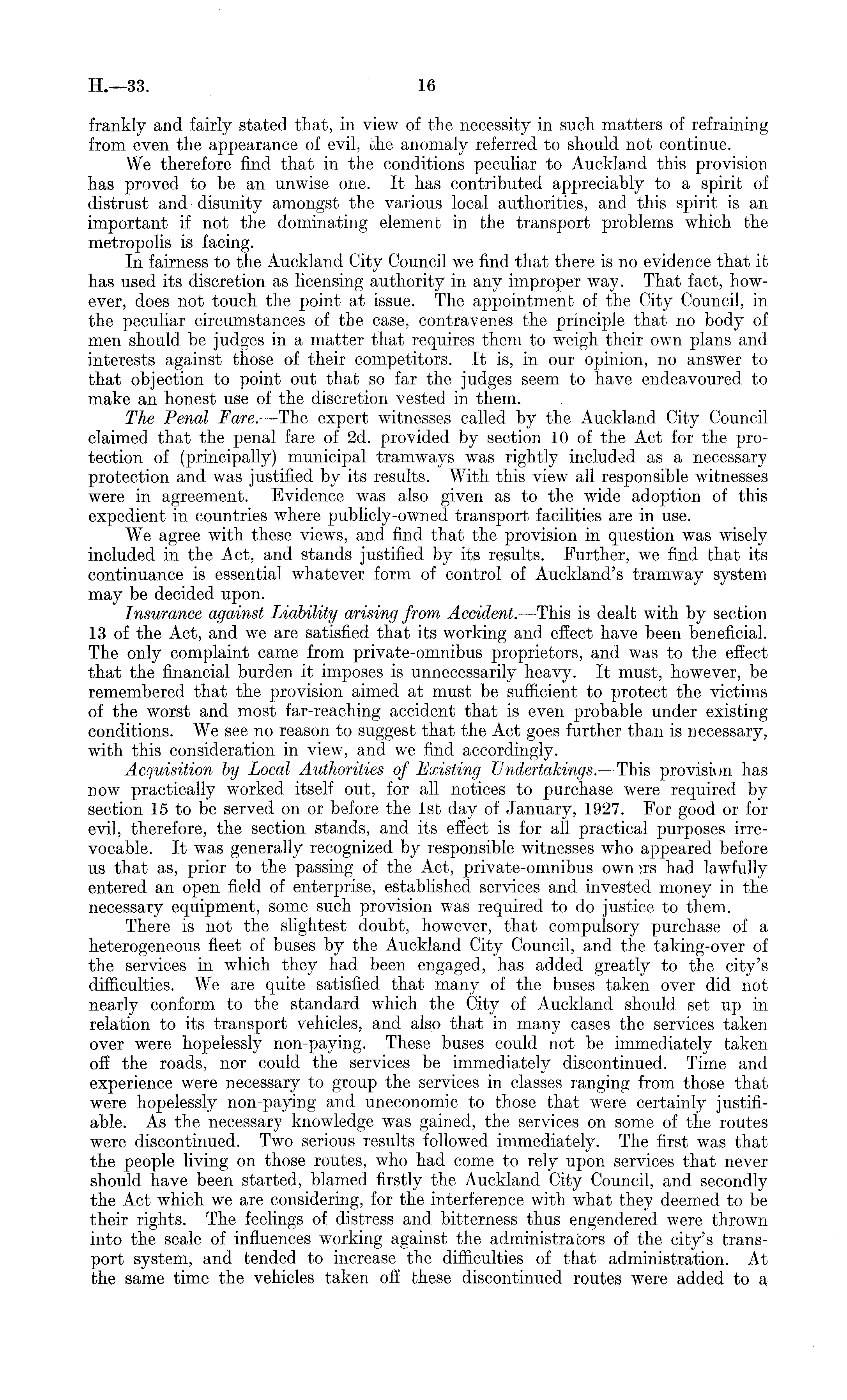 frankly and fairly stated that, in view of the necessity in such matters of refraining from even the appearance of evil, che anomaly referred to should not continue. We therefore find that in the conditions peculiar to Auckland this provision has proved to be an unwise one. It has contributed appreciably to a spirit of distrust and disunity amongst the various local authorities, and this spirit is an important if not the dominating element in the transport problems which the metropolis is facing. In fairness to the Auckland City Council we find that there is no evidence that it has used its discretion as licensing authority in any improper way. That fact, however, does not touch the point at issue. The appointment of the City Council, in the peculiar circumstances of the case, contravenes the principle that no body of men should be judges in a matter that requires them to weigh their own plans and interests against those of their competitors. It is, in our opinion, no answer to that objection to point out that so far the judges seem to have endeavoured to make an honest use of the discretion vested in them. The Penal Fare. —The expert witnesses called by the Auckland City Council claimed that the penal fare of 2d. provided by section 10 of the Act for the protection of (principally) municipal tramways was rightly included as a necessary protection and was justified by its results. With this view all responsible witnesses were in agreement. Evidence was also given as to the wide adoption of this expedient in countries where publicly-owned transport facilities are in use. We agree with these views, and find that the provision in question was wisely included in the Act, and stands justified by its results. Further, we find that its continuance is essential whatever form of control of Auckland's tramway system may be decided upon. Insurance against Liability arising from Accident. —This is dealt with by section 13 of the Act, and we are satisfied that its working and effect have been beneficial. The only complaint came from private-omnibus proprietors, and was to the effect that the financial burden it imposes is unnecessarily heavy. It must, however, be remembered that the provision aimed at must be sufficient to protect the victims of the worst and most far-reaching accident that is even probable under existing conditions. We see no reason to suggest that the Act goes further than is necessary, with this consideration in view, and we find accordingly. Acquisition by Local Authorities of Existing Undertakings.— This provision has now practically worked itself out, for all notices to purchase were required by section 15 to be served on or before the Ist day of January, 1927. For good or for evil, therefore, the section stands, and its effect is for all practical purposes irrevocable. It was generally recognized by responsible witnesses who appeared before us that as, prior to the passing of the Act, private-omnibus own >rs had lawfully entered an open field of enterprise, established services and invested money in the necessary equipment, some such provision was required to do justice to them. There is not the slightest doubt, however, that compulsory purchase of a heterogeneous fleet of buses by the Auckland City Council, and the taking-over of the services in which they had been engaged, has added greatly to the city's difficulties. We are quite satisfied that many of the buses taken over did not nearly conform to the standard which the City of Auckland should set up in relation to its transport vehicles, and also that in many cases the services taken over were hopelessly non-paying. These buses could not be immediately taken off the roads, nor could the services be immediately discontinued. Time and experience were necessary to group the services in classes ranging from those that were hopelessly non-paying and uneconomic to those that were certainly justifiable. As the necessary knowledge was gained, the services on some of the routes were discontinued. Two serious results followed immediately. The first was that the people living on those routes, who had come to rely upon services that never should have been started, blamed firstly the Auckland City Council, and secondly the Act which we are considering, for the interference with what they deemed to be their rights. The feelings of distress and bitterness thus engendered were thrown into the scale of influences working against the administrators of the city's transport system, and tended to increase the difficulties of that administration. At the same time the vehicles taken off these discontinued routes were added to a