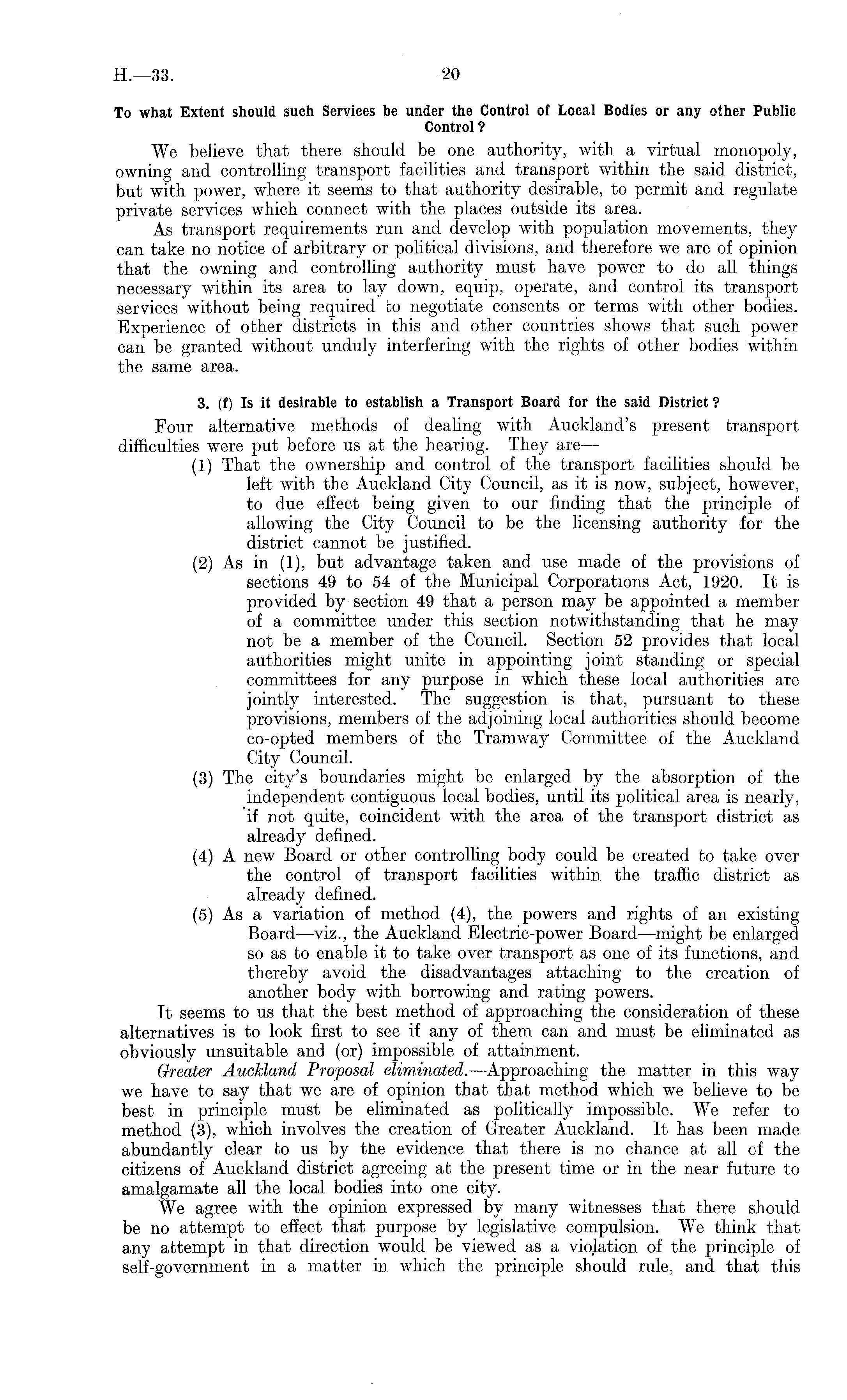 To what Extent should such Services be under the Control of Local Bodies or any other Public Control ? We believe that there should be one authority, with a virtual monopoly, owning and controlling transport facilities and transport within the said district, but with power, where it seems to that authority desirable, to permit and regulate private services which connect with the places outside its area. As transport requirements run and develop with population movements, they can take no notice of arbitrary or political divisions, and therefore we are of opinion that the owning and controlling authority must have power to do all things necessary within its area to lay down, equip, operate, and control its transport services without being required to negotiate consents or terms with other bodies. Experience of other districts in this and other countries shows that such power can be granted without unduly interfering with the rights of other bodies within the same area. 3. (f) Is it desirable to establish a Transport Board for the said District ? Four alternative methods of dealing with Auckland's present transport difficulties were put before us at the hearing. They are — (1) That the ownership and control of the transport facilities should be left with the Auckland City Council, as it is now, subject, however, to due effect being given to our finding that the principle of allowing the City Council to be the licensing authority for the district cannot be justified. (2) As in (1), but advantage taken and use made of the provisions of sections 49 to 54 of the Municipal Corporations Act, 1920. It is provided by section 49 that a person may be appointed a member of a committee under this section notwithstanding that he may not be a member of the Council. Section 52 provides that local authorities might unite in appointing joint standing or special committees for any purpose in which these local authorities are jointly interested. The suggestion is that, pursuant to these provisions, members of the adjoining local authorities should become co-opted members of the Tramway Committee of the Auckland City Council. (3) The city's boundaries might be enlarged by the absorption of the independent contiguous local bodies, until its political area is nearly, if not quite, coincident with the area of the transport district as already defined. (4) A new Board or other controlling body could be created to take over the control of transport facilities within the traffic district as already defined. (5) As a variation of method (4), the powers and rights of an existing Board —viz., the Auckland Electric-power Board—might be enlarged so as to enable it to take over transport as one of its functions, and thereby avoid the disadvantages attaching to the creation of another body with borrowing and rating powers. It seems to us that the best method of approaching the consideration of these alternatives is to look first to see if any of them can and must be eliminated as obviously unsuitable and (or) impossible of attainment. Greater Auckland Proposal eliminated. —Approaching the matter in this way we have to say that we are of opinion that that method which we believe to be best in principle must be eliminated as politically impossible. We refer to method (3), which involves the creation of Greater Auckland. It has been made abundantly clear to us by tlie evidence that there is no chance at all of the citizens of Auckland district agreeing at the present time or in the near future to amalgamate all the local bodies into one city. We agree with the opinion expressed by many witnesses that there should be no attempt to effect that purpose by legislative compulsion. We think that any attempt in that direction would be viewed as a violation of the principle of self-government in a matter in which the principle should rule, and that this