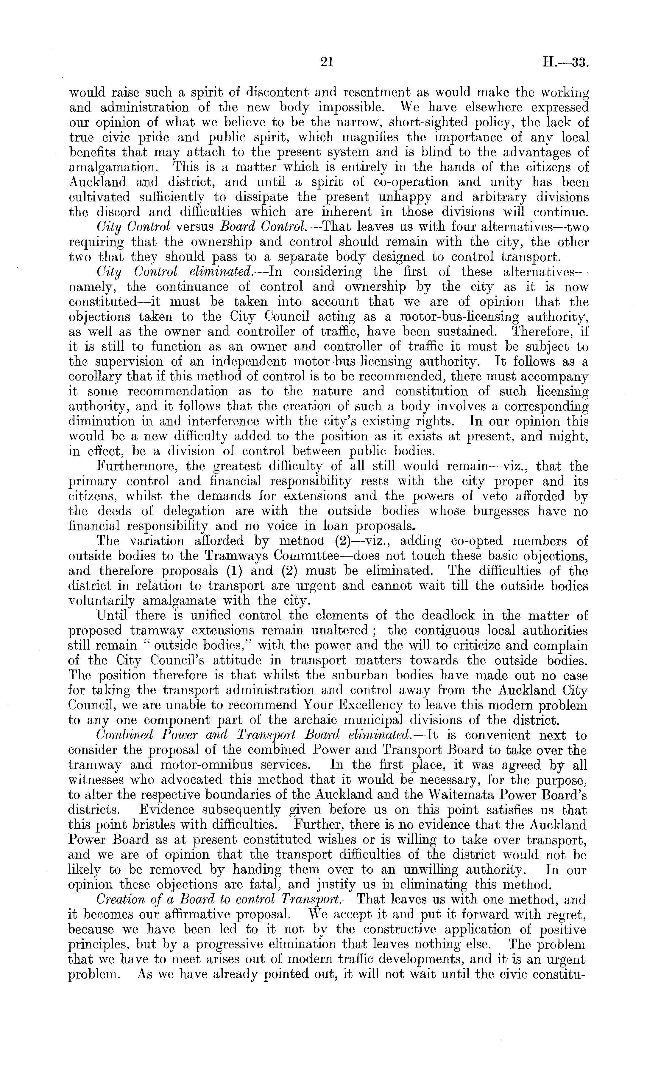 would raise such a spirit of discontent and resentment as would make the working and administration of the new body impossible. We have elsewhere expressed our opinion of what we believe to be the narrow, short-sighted policy, the lack of true civic pride and public spirit, which magnifies the importance of any local benefits that may attach to the present system and is blind to the advantages of amalgamation. This is a matter which is entirely in the hands of the citizens of Auckland and district, and until a spirit of co-operation and unity has been cultivated sufficiently to dissipate the present unhappy and arbitrary divisions the discord and difficulties which are inherent in those divisions will continue. City Control versus Board Control.—That leaves us with four alternatives —two requiring that the ownership and control should remain with the city, the other two that they should pass to a separate body designed to control transport. City Control eliminated.—ln considering the first of these alternatives — namely, the continuance of control and ownership by the city as it is now constituted —it must be taken into account that we are of opinion that the objections taken to the City Council acting as a motor-bus-licensing authority, as well as the owner and controller of traffic, have been sustained. Therefore, if it is still to function as an owner and controller of traffic it must be subject to the supervision of an independent motor-bus-licensing authority. It follows as a corollary that if this method of control is to be recommended, there must accompany it some recommendation as to the nature and constitution of such licensing authority, and it follows that the creation of such a body involves a corresponding diminution in and interference with the city's existing rights. In our opinion this would be a new difficulty added to the position as it exists at present, and might, in effect, be a division of control between public bodies. Furthermore, the greatest difficulty of all still would remain—viz., that the primary control and financial responsibility rests with the city proper and its citizens, whilst the demands for extensions and the powers of veto afforded by the deeds of delegation are with the outside bodies whose burgesses have no financial responsibility and no voice in loan proposals. The variation afforded by metnod (2)- —viz., adding co-opted members of outside bodies to the Tramways Committee —does not touch these basic objections, and therefore proposals (1) and (2) must be eliminated. The difficulties of the district in relation to transport are urgent and cannot wait till the outside bodies voluntarily amalgamate with the city. Until there is unified control the elements of the deadlock in the matter of proposed tramway extensions remain unaltered ; the contiguous local authorities still remain " outside bodies," with the power and the will to criticize and complain of the City Council's attitude in transport matters towards the outside bodies. The position therefore is that whilst the suburban bodies have made out no case for taking the transport administration and control away from the Auckland City Council, we are unable to recommend Your Excellency to leave this modern problem to any one component part of the archaic municipal divisions of the district. Combined Power and Transport Board eliminated. —It is convenient next to consider the proposal of the combined Power and Transport Board to take over the tramway and motor-omnibus services. In the first place, it was agreed by all witnesses who advocated this method that it would be necessary, for the purpose, to alter the respective boundaries of the Auckland and the Waitemata Power Board's districts. Evidence subsequently given before us on this point satisfies us that this point bristles with difficulties. Further, there is no evidence that the Auckland Power Board as at present constituted wishes or is willing to take over transport, and we are of opinion that the transport difficulties of the district would not be likely to be removed by handing them over to an unwilling authority. In our opinion these objections are fatal, and justify us in eliminating this method. Creation of a Board to control Transport.—That leaves us with one method, and it becomes our affirmative proposal. We accept it and put it forward with regret, because we have been led to it not by the constructive application of positive principles, but by a progressive elimination that leaves nothing else. The problem that we have to meet arises out of modern traffic developments, and it is an urgent problem. As we have already pointed out, it will not wait until the civic constitu-