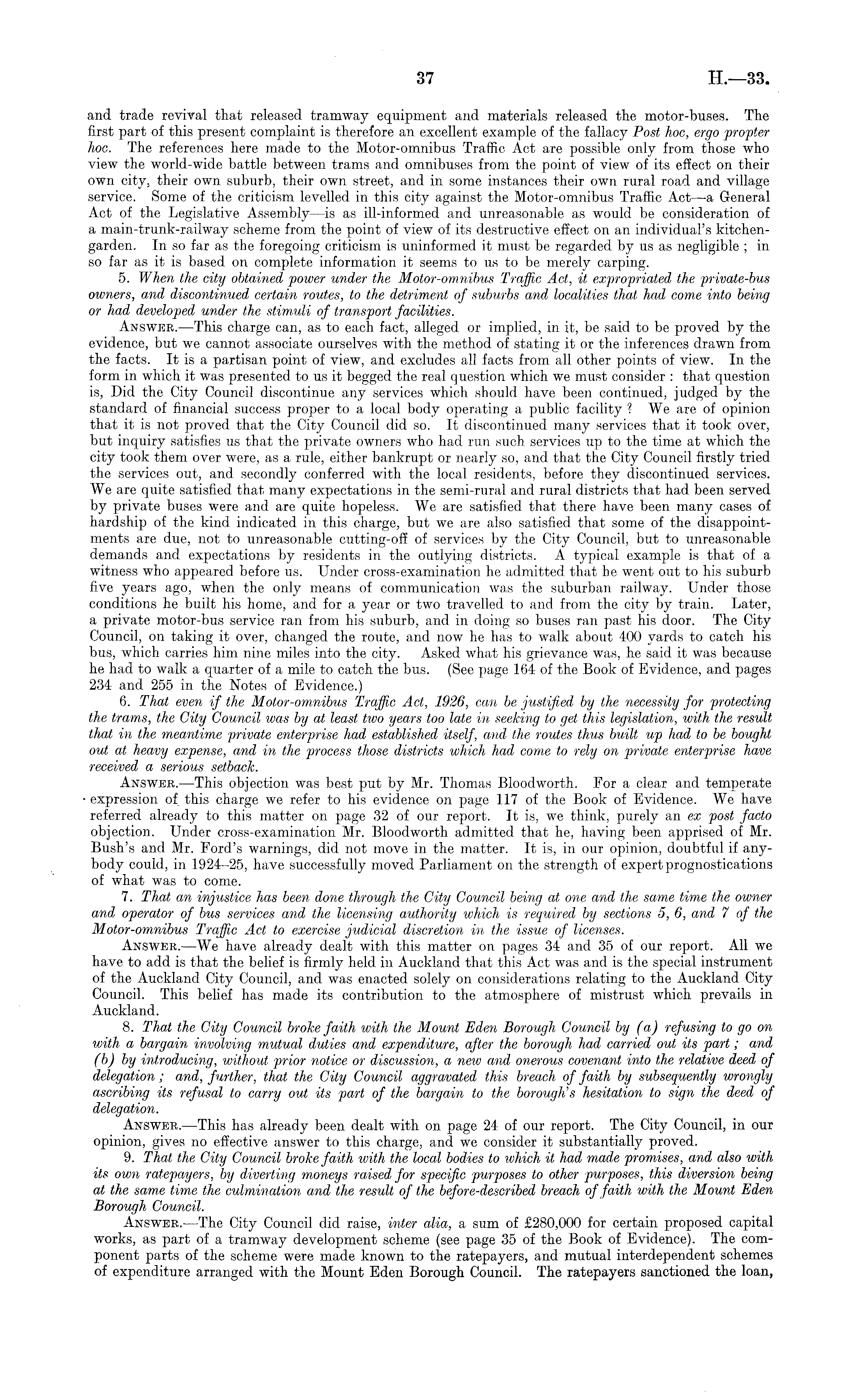 and trade revival that released tramway equipment and materials released the motor-buses. The first part of this present complaint is therefore an excellent example of the fallacy Post hoc, ergo propter hoc. The references here made to the Motor-omnibus Traffic Act are possible only from those who view the world-wide battle between trams and omnibuses from the point of view of its effect on their own city, their own suburb, their own street, and in some instances their own rural road and village service. Some of the criticism levelled in this city against the Motor-omnibus Traffic Act—a General Act of the Legislative Assembly—is as ill-informed and unreasonable as would be consideration of a main-trunk-railway scheme from the point of view of its destructive effect on an individual's kitchengarden. In so far as the foregoing criticism is uninformed it must be regarded by us as negligible ; in so far as it is based on complete information it seems to us to be merely carping. 5. When the city obtained power under the Motor-omnibus Traffic Act, it expropriated the private-bus owners, and discontinued certain routes, to the detriment of suburbs and localities that had come into being or had developed under the stimuli of transport facilities. Answer.—This charge can, as to each fact, alleged or implied, in it, be said to be proved by the evidence, but we cannot associate ourselves with the method of stating it or the inferences drawn from the facts. It is a partisan point of view, and excludes all facts from all other points of view. In the form in which it was presented to us it begged the real question which we must consider : that question is, Did the City Council discontinue any services which should have been continued, judged by the standard of financial success proper to a local body operating a public facility ? We are of opinion that it is not proved that the City Council did so. It discontinued many services that it took over, but inquiry satisfies us that the private owners who had run such services up to the time at which the city took them over were, as a rule, either bankrupt or nearly so, and that the City Council firstly tried the services out, and secondly conferred with the local residents, before they discontinued services. We are quite satisfied that many expectations in the semi-rural and rural districts that had been served by private buses were and are quite hopeless. We are satisfied that there have been many cases of hardship of the kind indicated in this charge, but we are also satisfied that some of the disappointments are due, not to unreasonable cutting-off of services by the City Council, but to unreasonable demands and expectations by residents in the outlying districts. A typical example is that of a witness who appeared before us. Under cross-examination he admitted that he went out to his suburb five years ago, when the only means of communication was the suburban railway. Under those conditions he built his home, and for a year or two travelled to and from the city by train. Later, a private motor-bus service ran from his suburb, and in doing so buses ran past his door. The City Council, on taking it over, changed the route, and now he has to walk about 400 yards to catch his bus, which carries him nine miles into the city. Asked what his grievance was, he said it was because he had to walk a quarter of a mile to catch the bus. (See page 164 of the Book of Evidence, and pages 234 and 255 in the Notes of Evidence.) 6. That even if the Motor-omnibus Traffic Act, 1926, can be justified by the necessity for protecting the trams, the City Council was by at least two years too late in seeking to get this legislation, with the result that in the meantime private enterprise had established itself, and the routes thus built up had to be bought out at heavy expense, and in the process those districts which had come to rely on private enterprise have received a serious setback. Answer.—This objection was best put by Mr. Thomas Bloodworth. For a clear and temperate expression of this charge we refer to his evidence on page 117 of the Book of Evidence. We have referred already to this matter on page 32 of our report. It is, we think, purely an ex post facto objection. Under cross-examination Mr. Bloodworth admitted that he, having been apprised of Mr. Bush's and Mr. Ford's warnings, did not move in the matter. It is, in our opinion, doubtful if anybody could, in 1924-25, have successfully moved Parliament on the strength of expert prognostications of what was to come. 7. That an injustice has been done through the City Council being at one and the same time the owner and operator of bus services and the licensing authority which is required by sections 5, 6, and 7 of the Motor-omnibus Traffic Act to exercise judicial discretion in the issue of licenses. Answer.—We have already dealt with this matter on pages 34 and 35 of our report. All we have to add is that the belief is firmly held in Auckland that this Act was and is the special instrument of the Auckland City Council, and was enacted solely on considerations relating to the Auckland City Council. This belief has made its contribution to the atmosphere of mistrust which prevails in Auckland. 8. That the City Council broke faith with the Mount Eden Borough Council by (a) refusing to go on with a bargain involving mutual duties and expenditure, after the borough had carried out its part; and (b) by introducing, without prior notice or discussion, a new and onerous covenant into the relative deed of delegation ; and, further, that the City Council aggravated this breach of faith by subsequently wrongly ascribing its refusal to carry out its part of the bargain to the borough's hesitation to sign the deed of delegation. Answer.—This has already been dealt with on page 24 of our report. The City Council, in our opinion, gives no effective answer to this charge, and we consider it substantially proved. 9. That