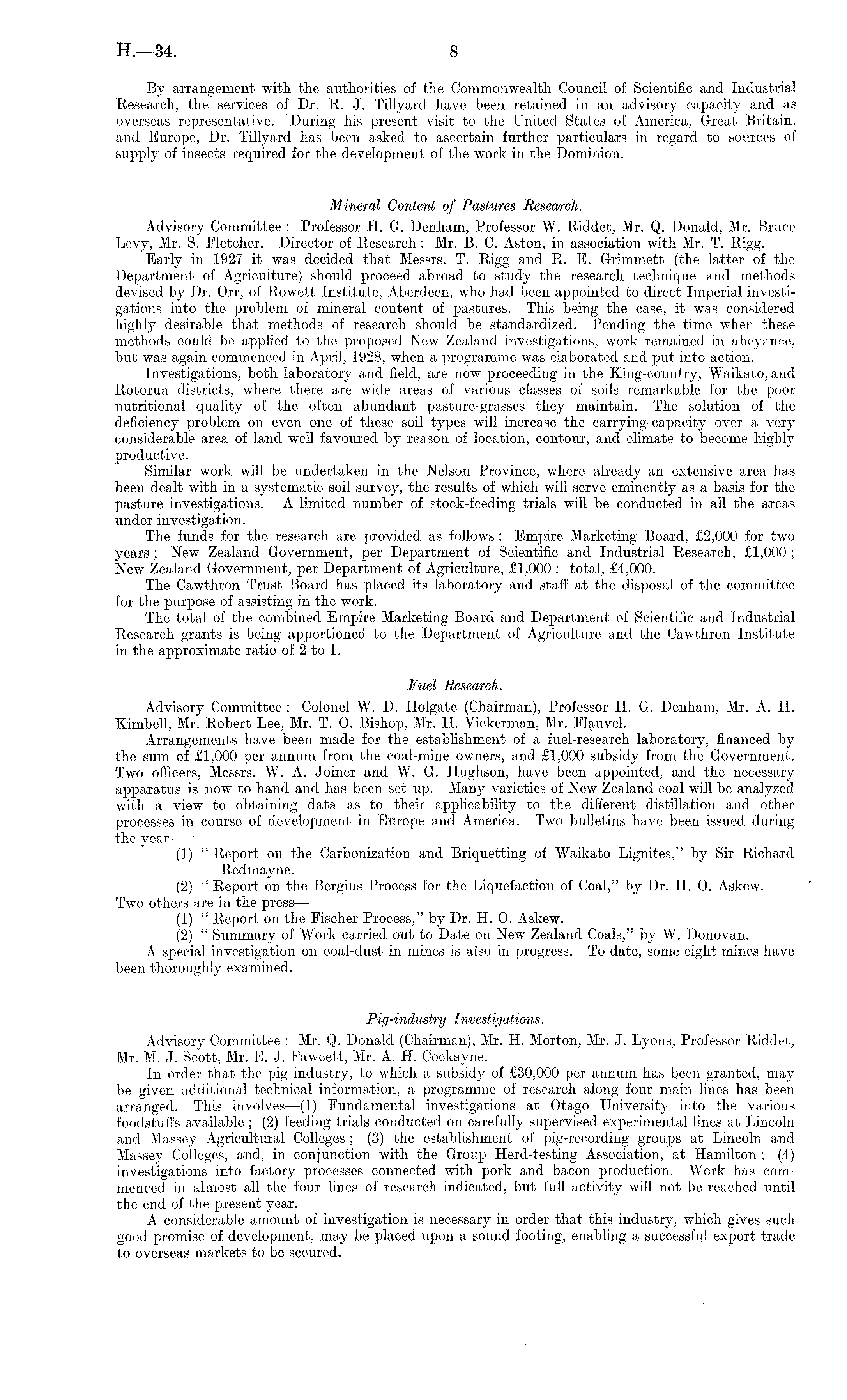 By arrangement with the authorities of the Commonwealth Council of Scientific and Industrial Research, the services of Dr. R. J. Tillyard have been retained in an advisory capacity and as overseas representative. During his present visit to the United States of America, Great Britain, and Europe, Dr. Tillyard has been asked to ascertain further particulars in regard to sources of supply of insects required for the development of the work in the Dominion. Mineral Content of Pastures Research. Advisory Committee : Professor H. G. Denham, Professor W. Riddet, Mr. Q. Donald, Mr. Bruce Levy, Mr. S. Fletcher. Director of Research : Mr. B. C. Aston, in association with Mr. T. Rigg. Early in 1927 it was decided that Messrs. T. Rigg and R. E. Grimmett (the latter of the Department of Agriculture) should proceed abroad to study the research technique and methods devised by Dr. Orr, of Rowett Institute, Aberdeen, who had been appointed to direct Imperial investigations into the problem of mineral content of pastures. This being the case, it was considered highly desirable that methods of research should be standardized. Pending the time when these methods could be applied to the proposed New Zealand investigations, work remained in abeyance, but was again commenced in April, 1928, when a programme was elaborated and put into action. Investigations, both laboratory and field, are now proceeding in the King-country, Waikato, and Rotorua districts, where there are wide areas of various classes of soils remarkable for the poor nutritional quality of the often abundant pasture-grasses they maintain. The solution of the deficiency problem on even one of these soil types will increase the carrying-capacity over a very considerable area of land well favoured by reason of location, contour, and climate to become highly productive. Similar work will be undertaken in the Nelson Province, where already an extensive area has been dealt with in a systematic soil survey, the results of which will serve eminently as a basis for the pasture investigations. A limited number of stock-feeding trials will be conducted in all the areas under investigation. The funds for the research are provided as follows : Empire Marketing Board, £2,000 for two years ; New Zealand Government, per Department of Scientific and Industrial Research, £1,000 ; New Zealand Government, per Department of Agriculture, £1,000 : total, £4,000. The Cawthron Trust Board has placed its laboratory and staff at the disposal of the committee for the purpose of assisting in the work. The total of the combined Empire Marketing Board and Department of Scientific and Industrial Research grants is being apportioned to the Department of Agriculture and the Cawthron Institute in the approximate ratio of 2 to 1. Fuel Research. Advisory Committee : Colonel W. D. Holgate (Chairman), Professor H. G. Denham, Mr. A. H, Kimbell, Mr. Robert Lee, Mr. T. O. Bishop, Mr. H. Vickerman, Mr. Fl^uvel. Arrangements have been made for the establishment of a fuel-research laboratory, financed by the sum of £1,000 per annum from the coal-mine owners, and £1,000 subsidy from the Government. Two officers, Messrs. W. A. Joiner and W. G. Hughson, have been appointed, and the necessary apparatus is now to hand and has been set up. Many varieties of New Zealand coal will be analyzed with a view to obtaining data as to their applicability to the different distillation and other processes in course of development in Europe and America. Two bulletins have been issued during the year — • (1) " Report on the Carbonization and Briquetting of Waikato Lignites," by Sir Richard Redmayne. (2) " Report on the Bergius Process for the Liquefaction of Coal," by Dr. H. 0. Askew. Two others are in the press — (1) " Report on the Fischer Process," by Dr. H. 0. Askew. (2) " Summary of Work carried out to Date on New Zealand Coals," by W. Donovan. A special investigation on coal-dust in mines is also in progress. To date, some eight mines have been thoroughly examined. Pig-industry Investigations. Advisory Committee : Mr. Q. Donald (Chairman), Mr. H. Morton, Mr. J. Lyons, Professor Riddet, Mr. M. J. Scott, Mr. E. J. Fawcett, Mr. A. H. Cockayne. In order that the pig industry, to which a subsidy of £30,000 per annum has been granted, may be given additional technical information, a programme of research along four main lines has been arranged. This involves —(1) Fundamental investigations at Otago University into the various foodstuffs available ; (2) feeding trials conducted on carefully supervised experimental lines at Lincoln and Massey Agricultural Colleges ; (3) the establishment of pig-recording groups at Lincoln and Massey Colleges, and, in conjunction with the Group Herd-testing Association, at Hamilton ; (4) investigations into factory processes connected with pork and bacon production. Work has commenced in almost all the four lines of research indicated, but full activity will not be reached until the end of the present year. A. considerable amount of investigation is necessary in order that this industry, which gives such good promise of development, may be placed upon a sound footing, enabling a successful export trade to overseas markets to be secured.