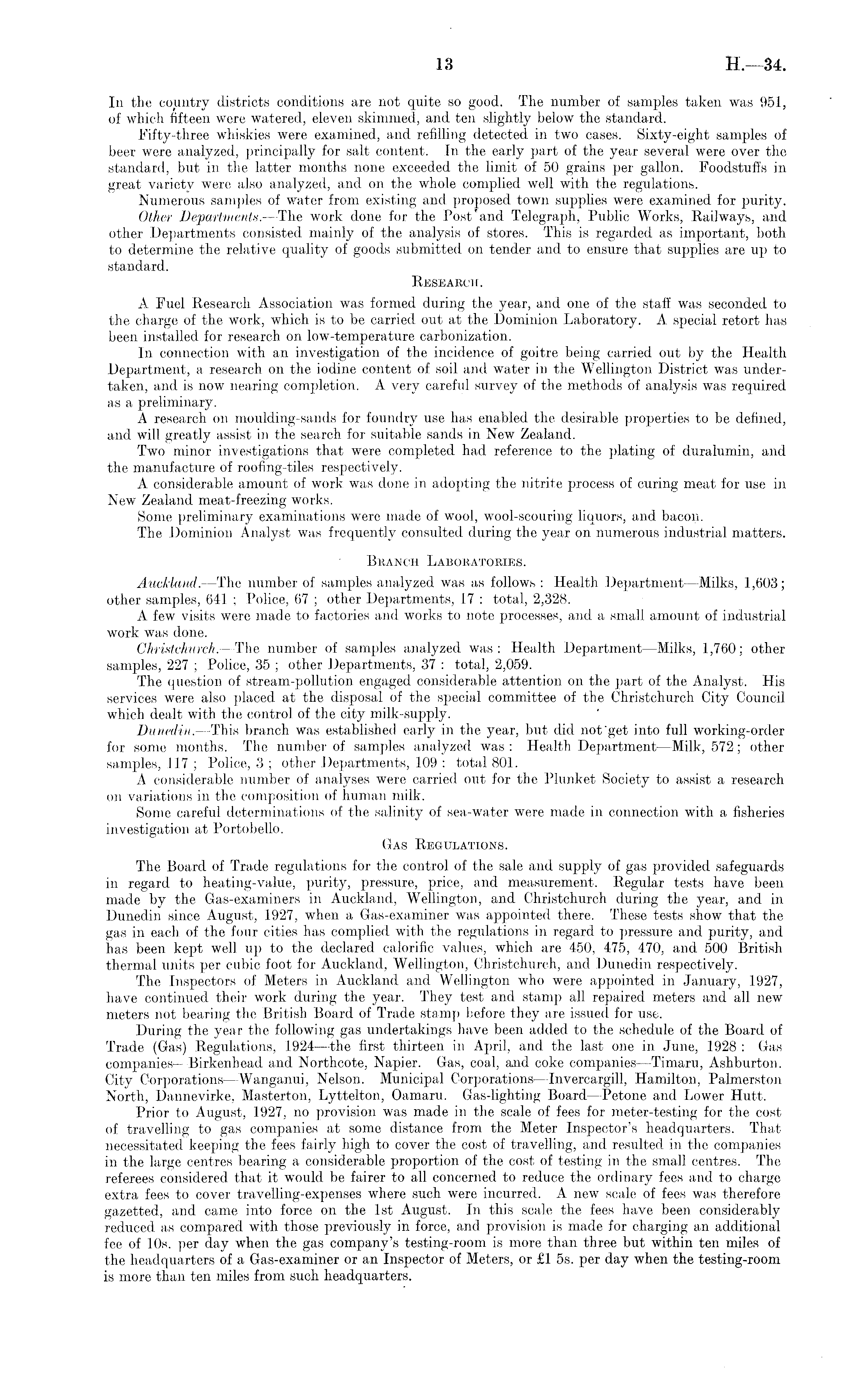 lii the country districts conditions are not quite so good. The number of samples taken was 951, of which fifteen were watered, eleven skimmed, and ten slightly below the standard. Fifty-three whiskies were examined, and refilling detected in two cases. Sixty-eight samples of beer were analyzed, principally for salt content. In the early part of the year several were over the standard, but in the latter months none exceeded the limit of 50 grains per gallon. Foodstuffs in great variety were also analyzed, and on the whole complied well with the regulations. Numerous samples of water from existing and proposed town supplies were examined for purity. Other Departments. —The work done for the Post and Telegraph, Public Works, Railways, and other Departments consisted mainly of the analysis of stores. This is regarded as important, both to determine the relative quality of goods submitted on tender and to ensure that supplies are up to standard. Research. A Fuel Research Association was formed during the year, and one of the staff was seconded to the charge of the work, which is to be carried out at the Dominion Laboratory. A special retort has been installed for research on low-temperature carbonization. In connection with an investigation of the incidence of goitre being carried out by the Health Department, a research on the iodine content of soil and water in the Wellington District was undertaken, and is now nearing completion. A very careful survey of the methods of analysis was required as a preliminary. A research on moulding-sands for foundry use has enabled the desirable properties to be defined, and will greatly assist in the search for suitable sands in New Zealand. Two minor investigations that were completed had reference to the plating of duralumin, and the manufacture of roofing-tiles respectively. A considerable amount of work was done in adopting the nitrite process of curing meat for use in New Zealand meat-freezing works. Some preliminary examinations were made of wool, wool-scouring liquors, and bacon. The Dominion Analyst was frequently consulted during the year on numerous industrial matters. Branch Laboratories. Auckland.—The number of samples analyzed was as follows : Health Department—Milks, 1,603; other samples, 641 ; Police, 67 ; other Departments, 17 : total, 2,328. A few visits were made to factories and works to note processes, and a small amount of industrial work was done. Christchurch. —The number of samples analyzed was: Health Department—Milks, 1,760; other samples, 227 ; Police, 35 ; other Departments, 37 : total, 2,059. The question of stream-pollution engaged considerable attention on the part of the Analyst. His services were also placed at the disposal of the special committee of the Christchurch City Council which dealt with the control of the city milk-supply. Dunedin. —This branch was established early in the year, but did not'get into full working-order for some months. The number of samples analyzed was : Health Department —Milk, 572; other samples, 117 ; Police, 3 ; other Departments, 109 : total 801. A considerable number of analyses were carried out for the Plunket Society to assist a research on variations in the composition of human milk. Some careful determinations of the salinity of sea-water were made in connection with a fisheries investigation at Portobello. Gas Regulations. The Board of Trade regulations for the control of the sale and supply of gas provided safeguards in regard to heating-value, purity, pressure, price, and measurement. Regular tests have been made by the Gas-examiners in Auckland, Wellington, and Christchurch during the year, and in Dunedin since August, 1927, when a Gas-examiner was appointed there. These tests show that the gas in each of the four cities has complied with the regulations in regard to pressure and purity, and has been kept well up to the declared calorific values, which are 450, 475, 470, and 500 British thermal units per cubic foot for Auckland, Wellington, Christchurch, and Dunedin respectively. The Inspectors of Meters in Auckland and Wellington who were appointed in January, 1927, have continued their work during the year. They test and stamp all repaired meters and all new meters not bearing the British Board of Trade stamp before they are issued for use. During the year the following gas undertakings have been added to the schedule of the Board of Trade (Gas) Regulations, 1924 —the first thirteen in April, and the last one in June, 1928 : Gas companies—Birkenhead and Northcote, Napier. Gas, coal, and coke companies—Timaru, Ashburton. City Corporations —Wanganui, Nelson. Municipal Corporations —Invercargill, Hamilton, Palmerston North, Dannevirke, Masterton, Lyttelton, Oamaru. Gas-lighting Board —Petone and Lower Hutt. Prior to August, 1927, no provision was made in the scale of fees for meter-testing for the cost of travelling to gas companies at some distance from the Meter Inspector's headquarters. That necessitated keeping the fees fairly high to cover the cost of travelling, and resulted in the companies in the large centres bearing a considerable proportion of the cost of testing in the small centres. The referees considered that it would be fairer to all concerned to reduce the ordinary fees and to charge extra fees to cover travelling-expenses where such were incurred. A new scale of fees was therefore gazetted, and came into force on the Ist August. In this scale the fees have been considerably reduced as compared with those previously in force, and provision is made for charging an additional fee of 10s. per day when the gas company's testing-room is more than three but within ten miles of the headquarters of a Gas-examiner or an Inspector of Meters, or £1 ss. per day when the testing-room is more than ten miles from such headquarters.