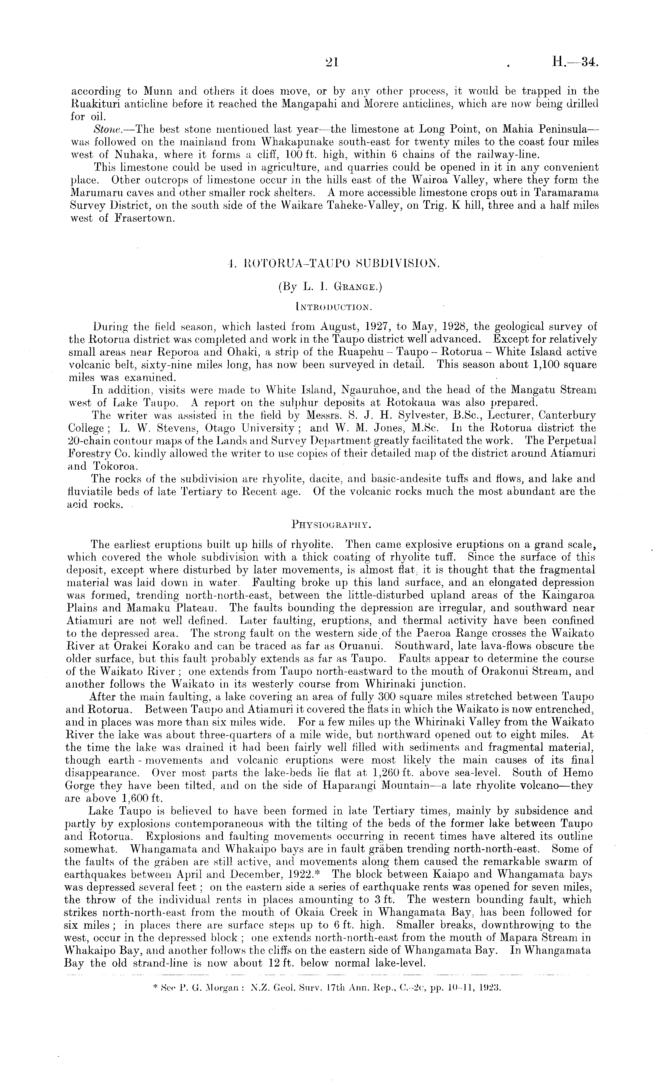 according to Munn and others it does move, or by any other process, it would be trapped in the Ruakituri anticline before it reached the Mangapahi and Morere anticlines, which are now being drilled for oil. Stone. —The best stone mentioned last year —the limestone at Long Point, on Mahia Peninsula — was followed on the mainland from Whakapunake south-east for twenty miles to the coast four miles west of Nuhaka,. where it forms a cliff, 100 ft. high, within 6 chains of the railway-line. This limestone could be used in agriculture, and quarries could be opened in it in any convenient place. Other outcrops of limestone occur in the hills east of the Wairoa Valley, where they form the Marumaru caves and other smaller rock shelters. A more accessible limestone crops out in Taramarama Survey District, on the south side of the Waikare Taheke-Valley, on Trig. K hill, three and a half miles west of Frasertown. 4. ROTORUA-TAUPO SUBDIVISION. (By L. I. Grange.) Introduction. During the field season, which lasted from August, 1927, to May, 1928, the geological survey of the Rotorua district was completed and work in the Taupo district well advanced. Except for relatively small areas near Reporoa and Ohaki, a strip of the Ruapehu - Taupo - Rotorua - White Island active volcanic belt, sixty-nine miles long, has now been surveyed in detail. This season about 1,100 square miles was examined. In addition, visits were made to White Island, Ngauruhoe, and the head of the Mangatu Stream west of Lake Taupo. A report on the sulphur deposits at Rotokaua was also prepared. The writer was assisted in the field by Messrs. S. J. H. Sylvester, B.Sc., Lecturer, Canterbury College ; L. W. Stevens, Otago University ; and W. M. Jones, M.Sc. In. the Rotorua district the 20-chain contour maps of the Lands and Survey Department greatly facilitated the work. The Perpetual Forestry Co. kindly allowed the writer to use copies of their detailed map of the district around Atiamuri and Tokoroa. The rocks of the subdivision are rhyolite, dacite, and basic-andesite tuffs and flows, and lake and fluviatile beds of late Tertiary to Recent age. Of the volcanic rocks much the most abundant are the acid rocks. Physiography. The earliest eruptions built up hills of rhyolite. Then came explosive eruptions on a grand scale, which covered the whole subdivision with a thick coating of rhyolite tuff. Since the surface of this deposit, except where disturbed by later movements, is almost flat it is thought that the fragmental material was laid down in water. Faulting broke up this land surface, and an elongated depression was formed, trending north-north-east, between the little-disturbed upland areas of the Kaingaroa Plains and Mamaku Plateau. The faults bounding the depression are irregular, and southward near Atiamuri are not well defined. Later faulting, eruptions, and thermal activity have been confined to the depressed area. The strong fault on the western side,of the Paeroa Range crosses the Waikato River at Orakei Korako and can be traced as far as Oruanui. Southward, late lava-flows obscure the older surface, but this fault probably extends as far as Taupo. Faults appear to determine the course of the Waikato River ; one extends from Taupo north-eastward to the mouth of Orakonui Stream, and another follows the Waikato in its westerly course from Whirinaki junction. After the main faulting, a lake covering an area of fully 300 square miles stretched between Taupo and Rotorua. Between Taupo and Atiamuri it covered the flats in which the Waikato is now entrenched, and in places was more than six miles wide. For a few miles up the Whirinaki Valley from the Waikato River the lake was about three-quarters of a mile wide, but northward opened out to eight miles. At the time the lake was drained it had been fairly well filled with sediments and fragmental material, though earth - movements and volcanic eruptions were most likely the main causes of its final disappearance. Over most parts the lake-beds lie flat at 1,260 ft. above sea-level. South of Hemo Gorge they have been tilted, and on the side of Haparangi Mountain —a late rhyolite volcano—they are above 1,600 ft. Lake Taupo is believed to have been formed in late Tertiary times, mainly by subsidence and partly by explosions contemporaneous with the tilting of the beds of the former lake between Taupo and Rotorua. Explosions and faulting movements occurring in recent times have altered its outline somewhat. Whangamata and Whakaipo bays are in fault graben trending north-north-east. Some of the faults of the graben are still active, and movements along them caused the remarkable swarm of earthquakes between April and December, 1922.* The block between Kaiapo and Whangamata bays was depressed several feet; on the eastern side a series of earthquake rents was opened for seven miles, the throw of the individual rents in places amounting to 3 ft. The western bounding fault, which strikes north-north-east from the mouth of Okaia Creek in Whangamata Bay, has been followed for six miles ; in places there are surface steps up to 6 ft. high. Smaller breaks, downthrowing to the west, occur in the depressed block ; one extends north-north-east from the mouth of Mapara Stream in Whakaipo Bay, and another follows the cliffs on the eastern side of Whangamata Bay. In Whangamata Bay the old strand-line is now about 12 ft. below normal lake-level.