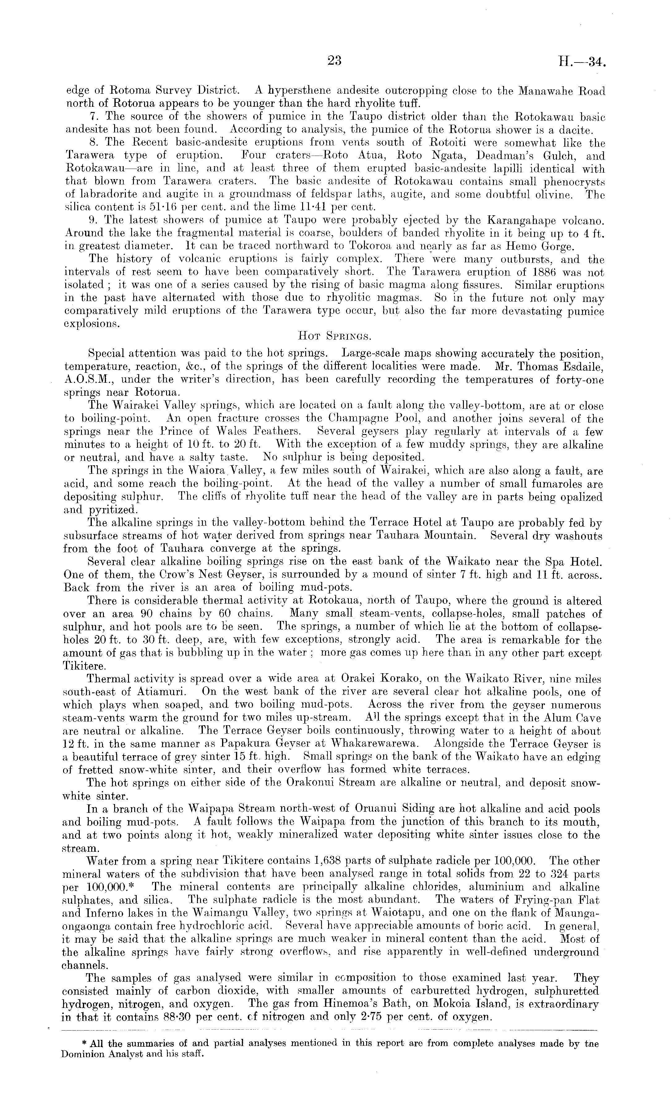 edge of Rotoma Survey District. A hypersthene andesite outcropping close to the Manawahe Road north of Rotorua appears to be younger than the hard rhyolite tuff. 7. The source of the showers of pumice in the Taupo district older than the Rotokawau basic andesite has not been found. According to analysis, the pumice of the Rotorua shower is a dacite. 8. The Recent basic-andesite eruptions from veiits south of Rotoiti were somewhat like the Tarawera type of eruption. Four craters —Roto Atua, Roto Ngata, Deadman's Gulch, and Rotokawau—are in line, and at least three of them erupted basic-andesite lapilli identical with that blown from Tarawera craters. The basic andesite of Rotokawau contains small phenocrysts of labradorite and augite in a groundmass of feldspar laths, augite, and some doubtful olivine. The silica content is 51-16 per cent, and the lime 11-41 per cent. 9. The latest showers of pumice at Taupo were probably ejected by the Karangahape volcano. Around the lake the fragmental material is coarse, boulders of banded rhyolite in it being up to 4 ft. in greatest diameter. It can be traced northward to Tokoroa and nearly as far as Hemo Gorge. The history of volcanic eruptions is fairly complex. There were many outbursts, and the intervals of rest seem to have been comparatively short. The Tarawera eruption of 1886 was not isolated ; it was one of a series caused by the rising of basic magma along fissures. Similar eruptions in the past have alternated with those due to rhyolitic magmas. So in the future not only may comparatively mild eruptions of the Tarawera type occur, but also the far more devastating pumice explosions. Hot Springs. Special attention was paid to the hot springs. Large-scale maps showing accurately the position, temperature, reaction, &c., of the springs of the different localities were made. Mr. Thomas Esdaile, A.0.5.M., under the writer's direction, has been carefully recording the temperatures of forty-one springs near Rotorua. The Wairakei Valley springs, which are located on a fault along the valley-bottom, are at or close to boiling-point. An open fracture crosses the Champagne Pool, and another joins several of the springs near the Prince of Wales Feathers. Several geysers play regularly at intervals of a few minutes to a height of 10 ft. to 20 ft. With, the exception of a few muddy springs, they are alkaline or neutral, and have a salty taste. No sulphur is being deposited. The springs in the Waiora.Valley, a few miles south of Wairakei, which are also along a fault, are acid, and some reach the boiling-point. At the head of the valley a number of small fumaroles are depositing sulphur. The cliffs of rhyolite tuff near the head of the valley are in parts being opalized and pyritized. The alkaline springs in the valley-bottom behind the Terrace Hotel at Taupo are probably fed by subsurface streams of hot water derived from springs near Tauhara Mountain. Several dry washouts from the foot of Tauhara converge at the springs. Several clear alkaline boiling springs rise on the east bank of the Waikato near the Spa Hotel. One of them, the Crow's Nest Geyser, is surrounded by a mound of sinter 7 ft. high and 11 ft. across. Back from the river is an area of boiling mud-pots. There is considerable thermal activity at Rotokaua, north of Taupo, where the ground is altered over an area 90 chains by 60 chains. Many small steam-vents, collapse-holes, small patches of sulphur, and hot pools are to be seen. The springs, a number of which lie at the bottom of collapseholes 20 ft. to 30 ft. deep, are, with few exceptions, strongly acid. The area is remarkable for the amount of gas that is bubbling up in the water ; more gas comes up here than in any other part except Tikitere. Thermal activity is spread over a wide area at Orakei Korako, on the Waikato River, nine miles south-east of Atiamuri. On the west bank of the river are several clear hot alkaline pools, one of which plays when soaped, and two boiling mud-pots. Across the river from the geyser numerous steam-vents warm the ground for two miles up-stream. AH the springs except that in the Alum Cave are neutral or alkaline. The Terrace Geyser boils continuously, throwing water to a height of about 12 ft. in the same manner as Papakura Geyser at Whakarewarewa. Alongside the Terrace Geyser is a beautiful terrace of grey sinter 15 ft. high. Small springs on the bank of the Waikato have an edging of fretted snow-white sinter, and their overflow has formed white terraces. The hot springs on either side of the Orakonui Stream are alkaline or neutral, and deposit snowwhite sinter. In a branch of the Waipapa Stream north-west of Oruanui Siding are hot alkaline and acid pools and boiling mud-pots. A fault follows the Waipapa from the junction of this branch to its mouth, and at two points along it hot, weakly mineralized water depositing white sinter issues close to the stream. Water from a spring near Tikitere contains 1,638 parts of sulphate radicle per 100,000. The other mineral waters of the subdivision that have been analysed range in total solids from 22 to 324 parts per 100,000.* The mineral contents are principally alkaline chlorides, aluminium and alkaline sulphates, and silica. The sulphate radicle is the most abundant. The waters of Frying-pan Flat and Inferno lakes in the Waimangu Valley, two springs at Waiotapu, and one on the flank of Maungaongaonga contain free hydrochloric acid. Several have appreciable amounts of boric acid. In general, it may be said that the alkaline springs are much weaker in mineral content than the acid. Most, of the alkaline springs have fairly strong overflows, and rise apparently in well-defined underground channels. The samples of gas analysed were similar in composition to those examined last year. They consisted mainly of carbon dioxide, with smaller amounts of carburetted hydrogen, sulphuretted hydrogen, nitrogen, and oxygen. The gas from Hinemoa's Bath, on Mokoia Island, is ex