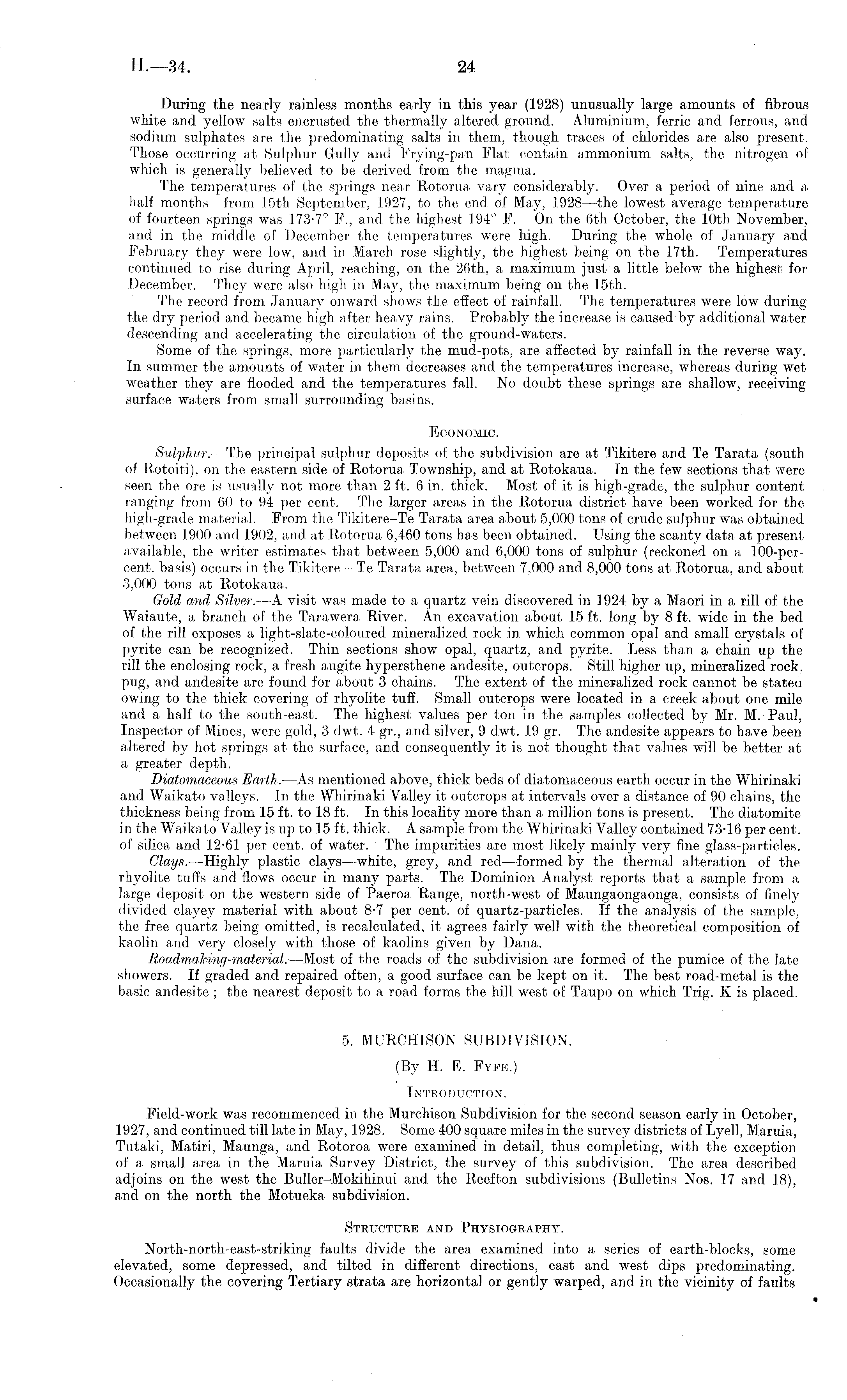 During the nearly rainless months early in this year (1928) unusually large amounts of fibrous white and yellow salts encrusted the thermally altered ground. Aluminium, ferric and ferrous, and sodium sulphates are the predominating salts in them, though traces of chlorides are also present. Those occurring at Sulphur Gully and Frying-pan Flat contain ammonium salts, the nitrogen of which is generally believed to be derived from the magma. The temperatures of the springs near Rotorua vary considerably. Over a period of nine and a half months —from 15th September, 1927, to the end of May, 1928 —the lowest average temperature of fourteen springs was 173-7° F., and the highest 194° F. On the 6th October, the 10th November, and in the middle of December the temperatures were high. During the whole of January and February they were low, and in March rose slightly, the highest being on the 17th. Temperatures continued to rise during April, reaching, on the 26th, a maximum just a little below the highest for December. They were also high in May, the maximum being on the 15th. The record from January onward shows the effect of rainfall. The temperatures were low during the dry period and became high after heavy rains. Probably the increase is caused by additional water descending and accelerating the circulation of the ground-waters. Some of the springs, more particularly the mud-pots, are affected by rainfall in the reverse way. In summer the amounts of water in them decreases and the temperatures increase, whereas during wet weather they are flooded and the temperatures fall. No doubt these springs are shallow, receiving surface waters from small surrounding basins. Economic. Sulphur.—The principal sulphur deposits of the subdivision are at Tikitere and Te Tarata (south of Rotoiti), on the eastern side of Rotorua Township, and at Rotokaua. In the few sections that were seen the ore is usually not more than 2 ft. 6 in. thick. Most of it is high-grade, the sulphur content ranging from 60 to 94 per cent. The larger areas in the Rotorua district have been worked for the high-grade material. From the Tikitere-Te Tarata area about 5,000 tons of crude sulphur was obtained between 1900 and 1902, and at Rotorua 6,460 tons has been obtained. Using the scanty data at present available, the writer estimates that between 5,000 and 6,000 tons of sulphur (reckoned on a 100-per-cent. basis) occurs in the Tikitere - Te Tarata area, between 7,000 and 8,000 tons at Rotorua, and about 3,000 tons at Rotokaua. Gold and Silver.—A. visit was made to a quartz vein discovered in 1924 by a Maori in a rill of the Waiaute, a branch of the Tarawera River. An excavation about 15 ft. long by 8 ft. wide in the bed of the rill exposes a light-slate-coloured mineralized rock in which common opal and small crystals of pyrite can be recognized. Thin sections show opal, quartz, and pyrite. 'Less than a chain up the rill the enclosing rock, a fresh augite hypersthene andesite, outcrops. Still higher up, mineralized rock, pug, and andesite are found for about 3 chains. The extent of the mineralized rock cannot be stated owing to the thick covering of rhyolite tuff. Small outcrops were located in a creek about one mile and a half to the south-east. The highest values per ton in the samples collected by Mr. M. Paul, Inspector of Mines, were gold, 3 dwt. 4 gr., and silver, 9 dwt. 19 gr. The andesite appears to have been altered by hot springs at the surface, and consequently it is not thought that values will be better at a greater depth. Diatomaceous Earth. —As mentioned above, thick beds of diatomaceous earth occur in the Whirinaki and Waikato valleys. In the Whirinaki Valley it outcrops at intervals over a distance of 90 chains, the thickness being from 15 ft. to 18 ft. In this locality more than a million tons is present. The diatomite in the Waikato Valley is up to 15 ft. thick. A sample from the Whirinaki Valley contained 73-16 per cent, of silica and 12-61 per cent, of water. The impurities are most likely mainly very fine glass-particles. Clays.—Highly plastic clays —white, grey, and red —formed by the thermal alteration of the rhyolite tuffs and flows occur in many parts. The Dominion Analyst reports that a sample from a large deposit on the western side of Paeroa Range, north-west of Maungaongaonga, consists of finely divided clayey material with about 8-7 per cent, of quartz-particles. If the analysis of the sample, the free quartz being omitted, is recalculated, it agrees fairly well with the theoretical composition of kaolin and very closely with those of kaolins given by Dana. Roadmahing-material.—Most of the roads of the subdivision are formed of the pumice of the late showers. If graded and repaired often, a good surface can be kept on it. The best road-metal is the basic andesite ; the nearest deposit to a road forms the hill west of Taupo on which Trig. K is placed. 5. MURCHISON SUBDIVISION. (By H. F. Fyfe.) Introduction. Field-work was recommenced in the Murchison Subdivision for the second season early in October, 1927, and continued till late in May, 1928. Some 400 square miles in the survey districts of Lyell, Maruia, Tutaki, Matiri, Maunga, and Rotoroa were examined in detail, thus completing, with the exception of a small area in the Maruia Survey District, the survey of this subdivision. The area described adjoins on the west the Buller-Mokihinui and the Reefton subdivisions (Bulletins Nos. 17 and 18), and on the north the Motueka subdivision. Structure and Physiography. North-north-east-striking faults divide the area examined into a series of earth-blocks, some elevated, some depressed, and tilted in different directions, east and west dips predominating. Occasionally the covering Tertiary strata are horizontal or gently warped, and in the vicinity of faults