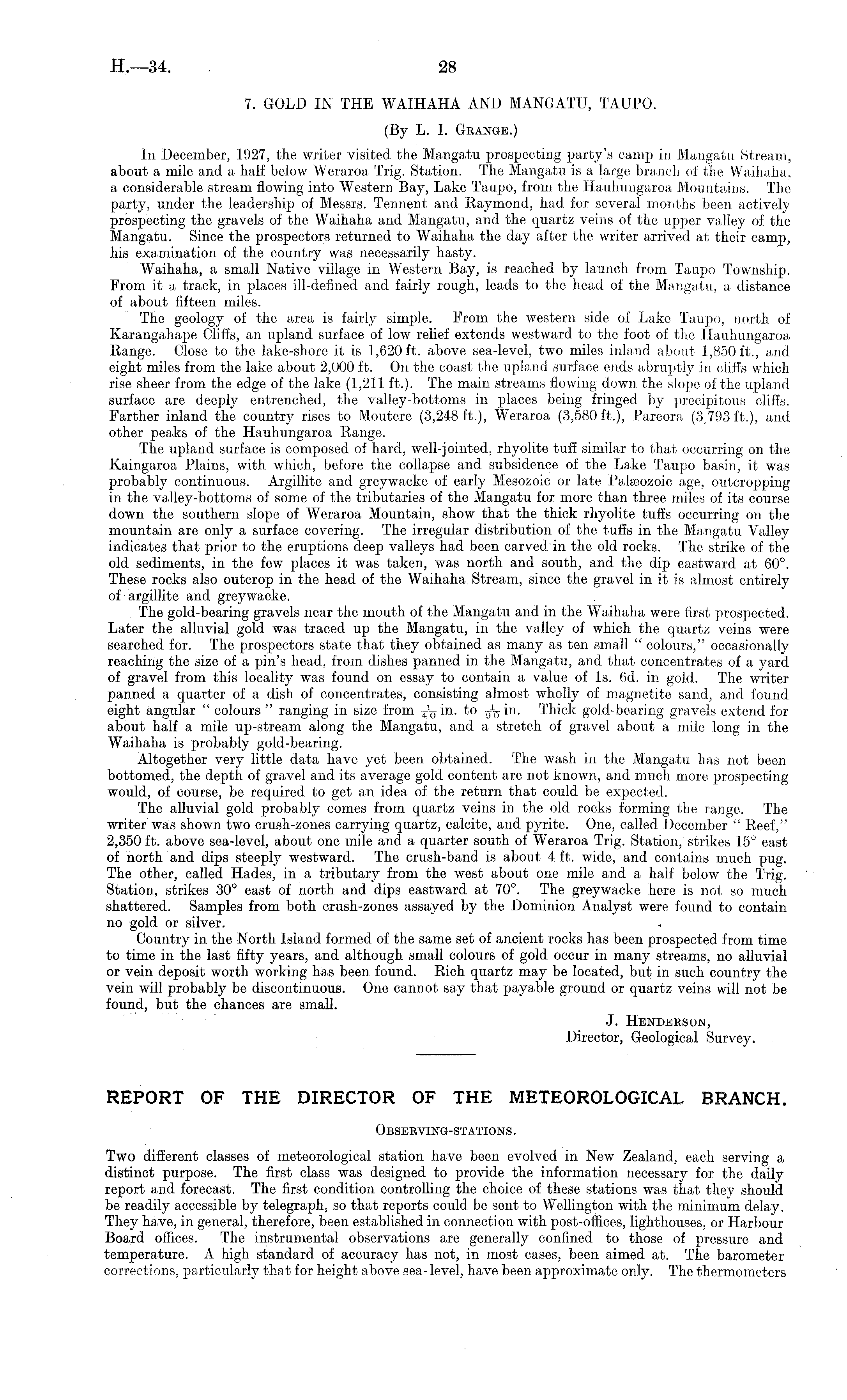 7. GOLD IN THE WAIHAHA AND MANGATU, TAUPO. (By L. I. Grange.) In December, 1927, the writer visited the Mangatu prospecting party's camp in Mangatu Stream, about a mile and a half below Weraroa Trig. Station. The Mangatu is a large branch of the Waihaha, a considerable stream flowing into Western Bay, Lake Taupo, from the Hauhungaroa Mountains. The party, under the leadership of Messrs. Tennent and Raymond, had for several months been actively prospecting the gravels of the Waihaha and Mangatu, and the quartz Veins of the upper valley of the Mangatu. Since the prospectors returned to Waihaha the day after the writer arrived at their camp, his examination of the country was necessarily hasty. Waihaha, a small Native village in Western Bay, is reached by launch from Taupo Township. From it a track, in places ill-defined and fairly rough, leads to the head of the Mangatu, a distance of about fifteen miles. The geology of the area is fairly simple. Prom the western side of Lake Taupo, north of Karangahape Cliffs, an upland surface of low relief extends westward to the foot of the Hauhungaroa Range. Close to the lake-shore it is 1,620 ft. above sea-level, two miles inland about 1,850 ft., and eight miles from the lake about 2,000 ft. On the coast the upland surface ends abruptly in cliffs which rise sheer from the edge of the lake (1,211 ft.). The main streams flowing down the slope of the upland surface are deeply entrenched, the valley-bottoms in places being fringed by precipitous cliffs. Farther inland the country rises to Moutere (3,248 ft.), Weraroa (3,580 ft.), Pareora (3,793 ft.), and other peaks of the Hauhungaroa Range. The upland surface is composed of hard, well-jointed, rhyolite tuff similar to that occurring on the Kaingaroa Plains, with which, before the collapse and subsidence of the Lake Taupo basin, it was probably continuous. Argillite and greywacke of early Mesozoic or late Palaeozoic age, outcropping in the valley-bottoms of some of the tributaries of the Mangatu for more than three miles of its course down the southern slope of Weraroa Mountain, show that the thick rhyolite tuffs occurring on the mountain are only a surface covering. The irregular distribution of the tuffs in the Mangatu Valley indicates that prior to the eruptions deep valleys had been carved in the old rocks. The strike of the old sediments, in the few places it was taken, was north and south, and the dip eastward at 60°. These rocks also outcrop in the head of the Waihaha, Stream, since the gravel in it is almost entirely of argillite and greywacke. The gold-bearing gravels near the mouth of the Mangatu and in the Waihaha were first prospected. Later the alluvial gold was traced up the Mangatu, in the valley of which the quartz veins were searched for. The prospectors state that they obtained as many as ten small " colours," occasionally reaching the size of a pin's head, from dishes panned in the Mangatu, and that concentrates of a yard of gravel from this locality was found on essay to contain a value of Is. 6d. in gold. The writer panned a quarter of a dish of concentrates, consisting almost wholly of magnetite sand, and found eight angular " colours " ranging in size from s to in. Thick gold-bearing gravels extend for about half a mile up-stream along the Mangatu, and a stretch of gravel about a mile long in the Waihaha is probably gold-bearing. Altogether very little data have yet been obtained. The wash in the Mangatu has not been bottomed, the depth of gravel and its average gold content are not known, and much more prospecting would, of course, be required to get an idea of the return that could be expected. The alluvial gold probably comes from quartz veins in the old rocks forming the range. The writer was shown two crush-zones carrying quartz, calcite, and pyrite. One, called December " Reef," 2,350 ft. above sea-level, about one mile and a quarter south of Weraroa Trig. Station, strikes 15° east of north and dips steeply westward. The crush-band is about 4 ft. wide, and contains much pug. The other, called Hades, in a tributary from the west about one mile and a half below the Trig. Station, strikes 30° east of north and dips eastward at 70°. The greywacke here is not so much shattered. Samples from both crush-zones assayed by the Dominion Analyst were found to contain no gold or silver. Country in the North Island formed of the same set of ancient rocks has been prospected from time to time in the last fifty years, and although small colours of gold occur in many streams, no alluvial or vein deposit worth working has been found. Rich quartz may be located, but in such country the vein will probably be discontinuous. One cannot say that payable ground or quartz veins will not be found, but the chances are small. J. Henderson, Director, Geological Survey. REPORT OF THE DIRECTOR OF THE METEOROLOGICAL BRANCH. Observing-st ations . Two different classes of meteorological station have been evolved in New Zealand, each serving a distinct purpose. The first class was designed to provide the information necessary for the daily report and forecast. The first condition controlling the choice of these stations was that they should be readily accessible by telegraph, so that reports could be sent to Wellington with the minimum delay. They have, in general, therefore, been established in connection with post-offices, lighthouses, or Harbour Board offices. The instrumental observations are generally confined to those of pressure and temperature. A high standard of accuracy has not, in most cases, been aimed at. The barometer corrections, particularly that for height above sea-level, have been approximate only. The thermometers
